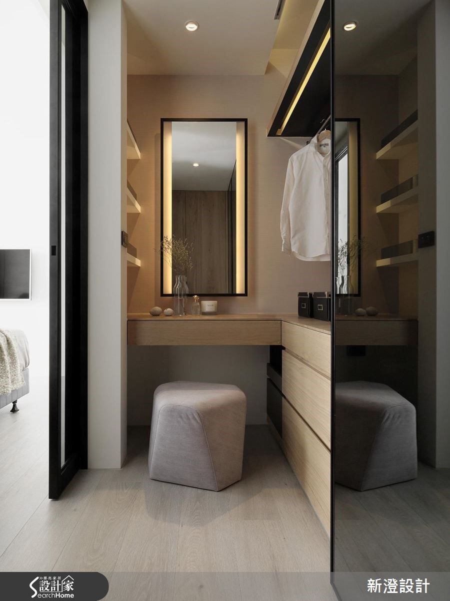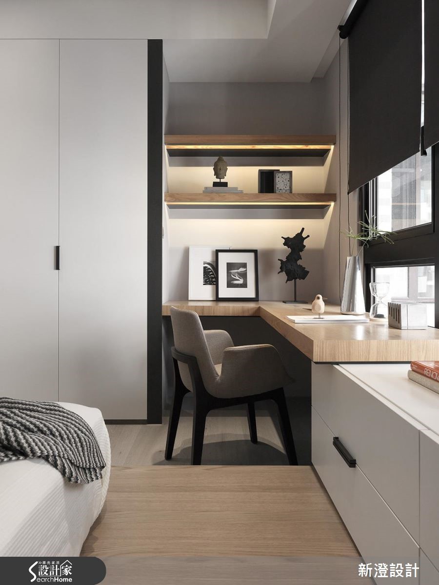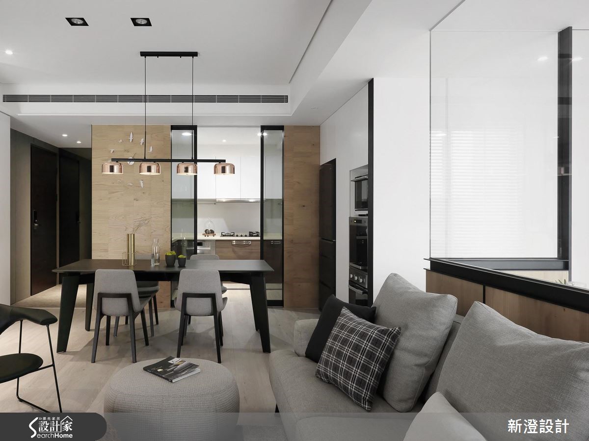 172平方米居家,设计师引用经典的黑白色调,在低彩主调中结合简约的现代语汇,同时将收纳机能隐藏,创造出空间、人、生活的和谐样貌。【舍弃复杂,简约线条延伸视感】空间舍弃过于复杂的线条,透过大面积的白色延伸,佐以黑色与木皮相间,让面与面、线与线之间,存在着细致的秩序感,无形中亦让视觉有所延伸,而书房的清玻隔断,则适时破除视线局促,增添公共场域的穿透视角,型构悠远的风景画面。【隐藏式机能,收纳简洁表情】同时于电视墙、廊道植入隐藏式机能,餐厅则给予简洁的电器收纳型式,落实利落的立面表情,餐厅、厨房之间规划两道铝制滑门,利用冷灰色玻璃型塑半通透效果,达到延伸光线与隔绝油烟目的。【强调立体感,营造视觉扩容效果】寝卧延续着白色底调,以黑色线性强调立体视感,同时为卧室争取视觉扩容效益,在转角畸零处做出阅读区、梳妆台,且另辟实用的更衣间,完善起居中的需求!