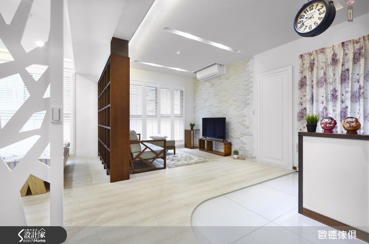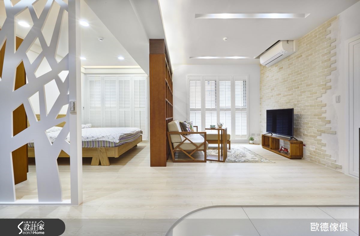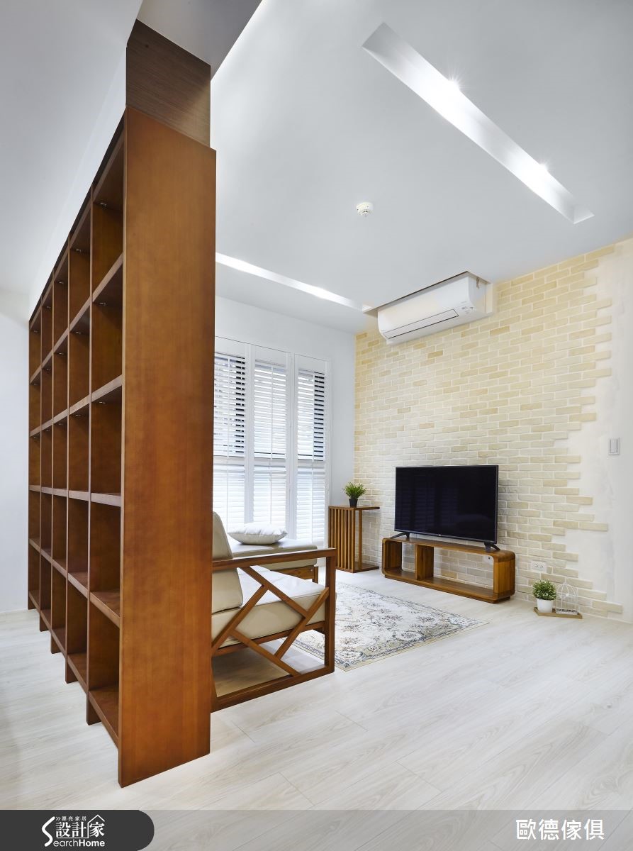 许多在都市圈忙碌工作的上班族,到了假日,都想到郊外放松度假,渴望一个无拘无束的环境,而这正是业主夫妻的心声,希望拥有明亮、舒适、不拥挤的度假小宅,让俩人能惬意享受轻盈的北欧风假期。【家具做隔断,让空间更通透】由于居住人数仅有2位,又非天天使用的空间,依此背景,设计师采取开放式的空间规划对策,通透打开了50平方米小宅,彷佛置身无拘束感的饭店套房。全室以浅色木地板统一空间休闲风格,并通过木质家具画龙点睛地区隔了界线。电视墙采用文化石搭配木质系电视柜、沙发、茶几,让客厅成为屋主一起谈天说笑的地方,并以开放式书架作为客厅与卧室之间的屏障,让屋主不仅可收纳大量物品书籍,也可摆上收藏家饰,成为空间中的风景。