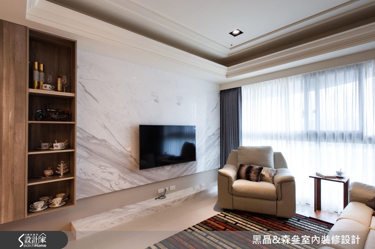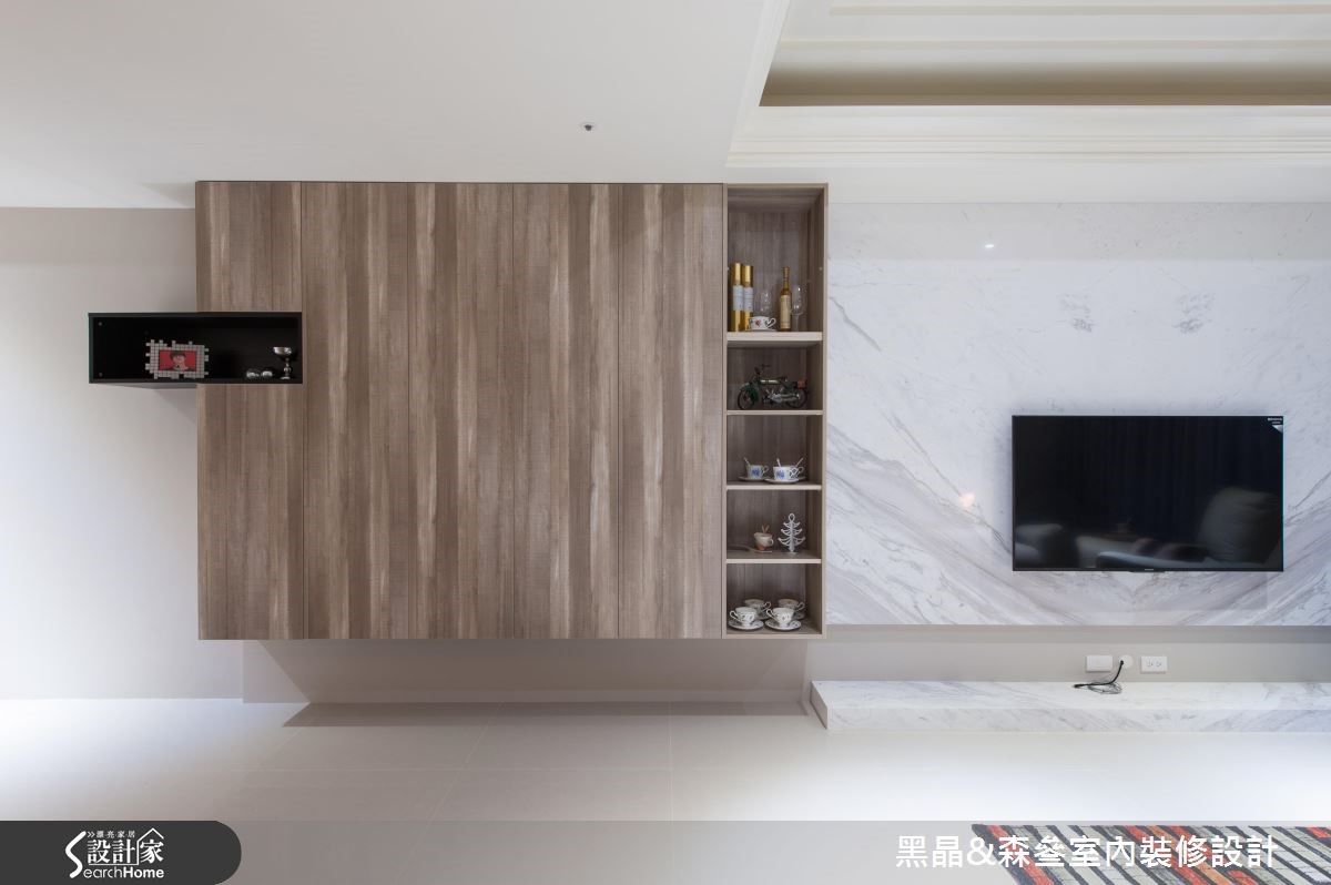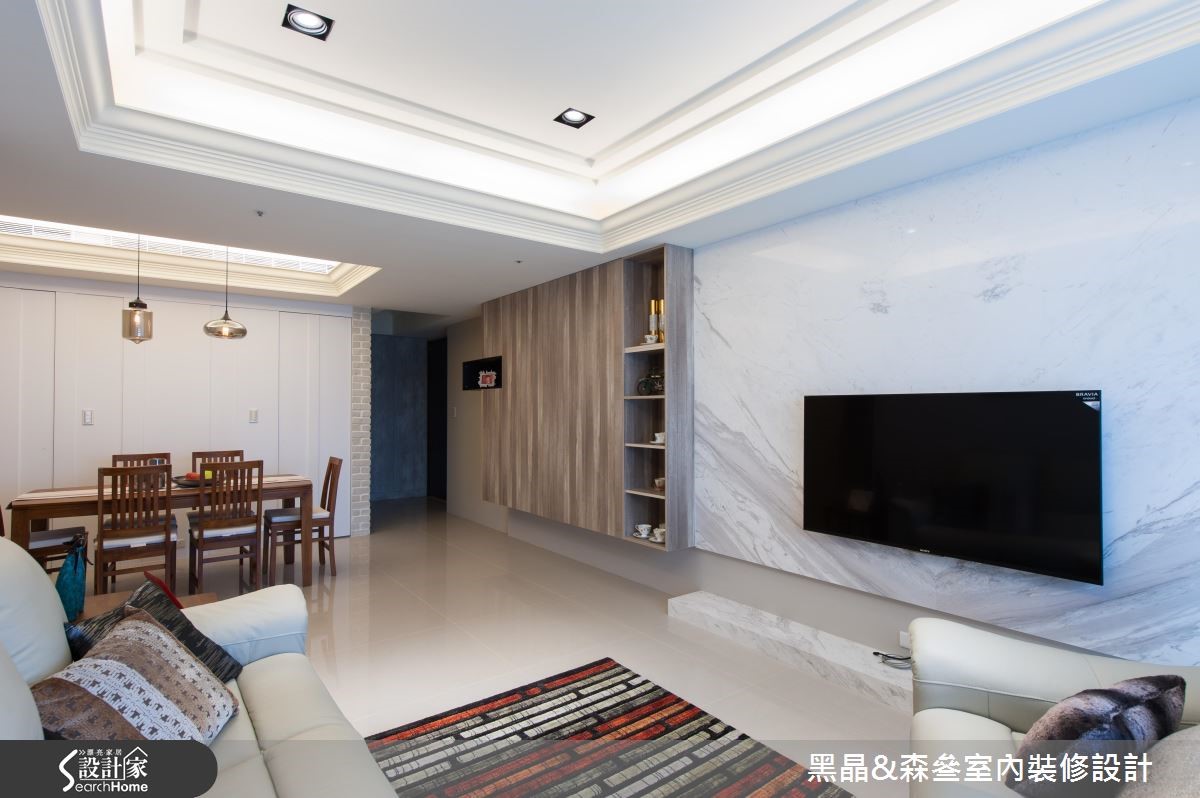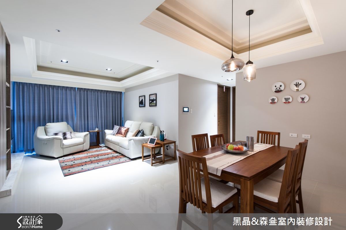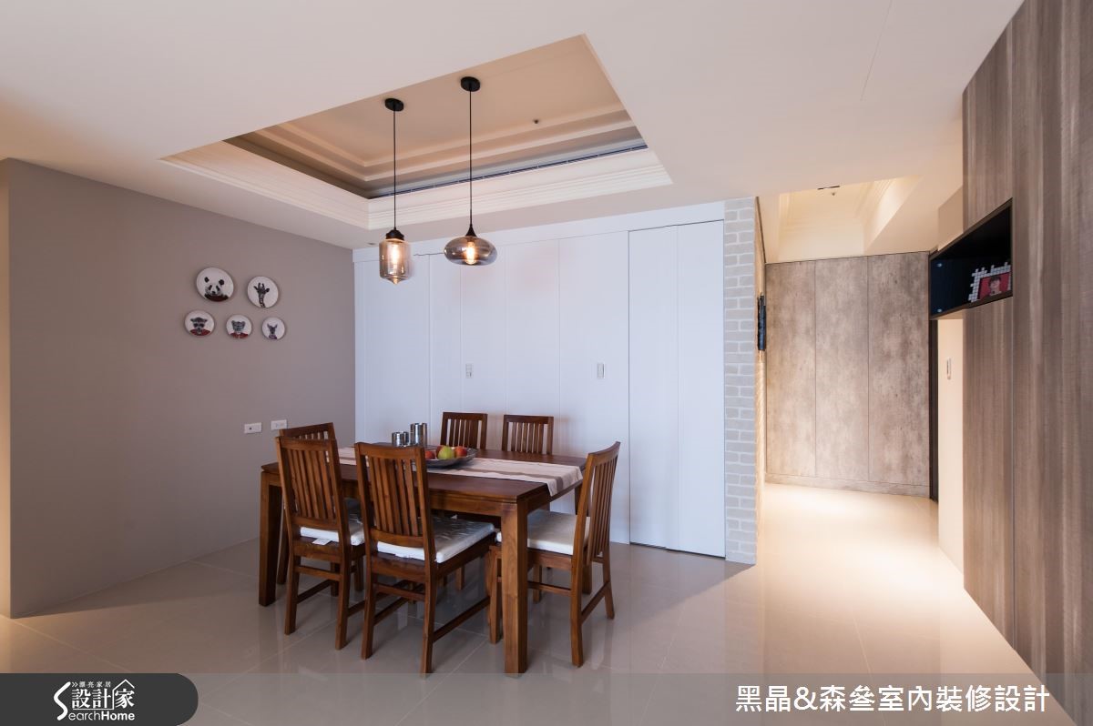 整体空间以简约的色感铺叙,让93平方米的室内也能有宽敞感;而古典与现代的设计风格相融,温润的木作肌理局部点缀,结合温暖的照明设计,替室内增添人文暖意。【清爽白铺陈,营造空间放大感】玄关处以白色文化石铺排壁面,再挂上简约画作,替玄关增添开阔视感。公共领域利用古典的线板描绘天花板,在简约不繁复的线条勾勒下,更添优雅与气度;木作收纳柜则衔接入口与客厅处,自然的木纹与一旁石材打造的电视墙相互对比,呈现古典与现代的融合。餐厅采原木桌椅摆设,搭配温暖的吊灯光源,替空间增添温馨情意;而厨房领域则以隐藏门造型,将烹调与用餐区域分开,避免产生狭小、压迫的感受,保留敞亮且舒适的用餐氛围。