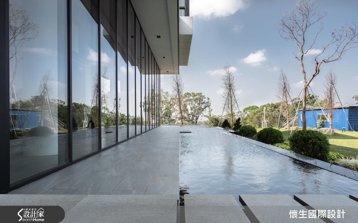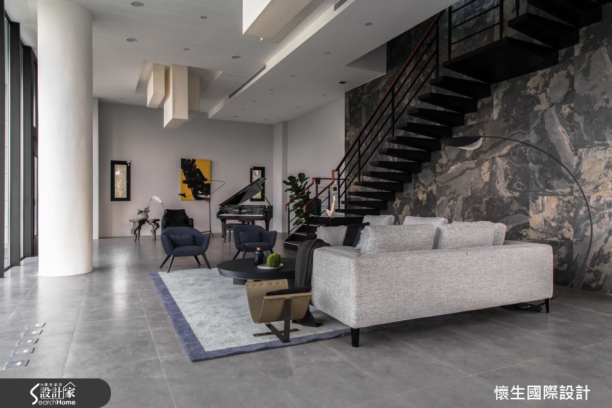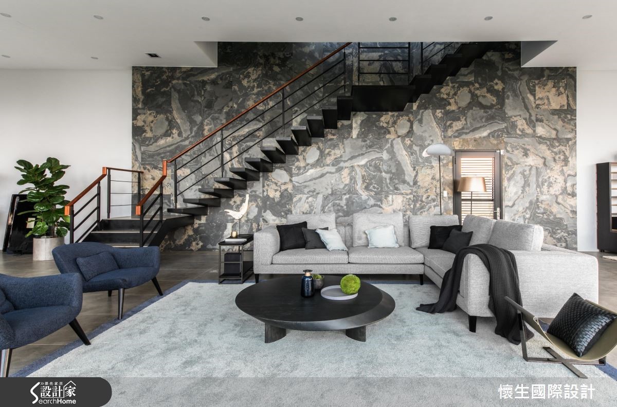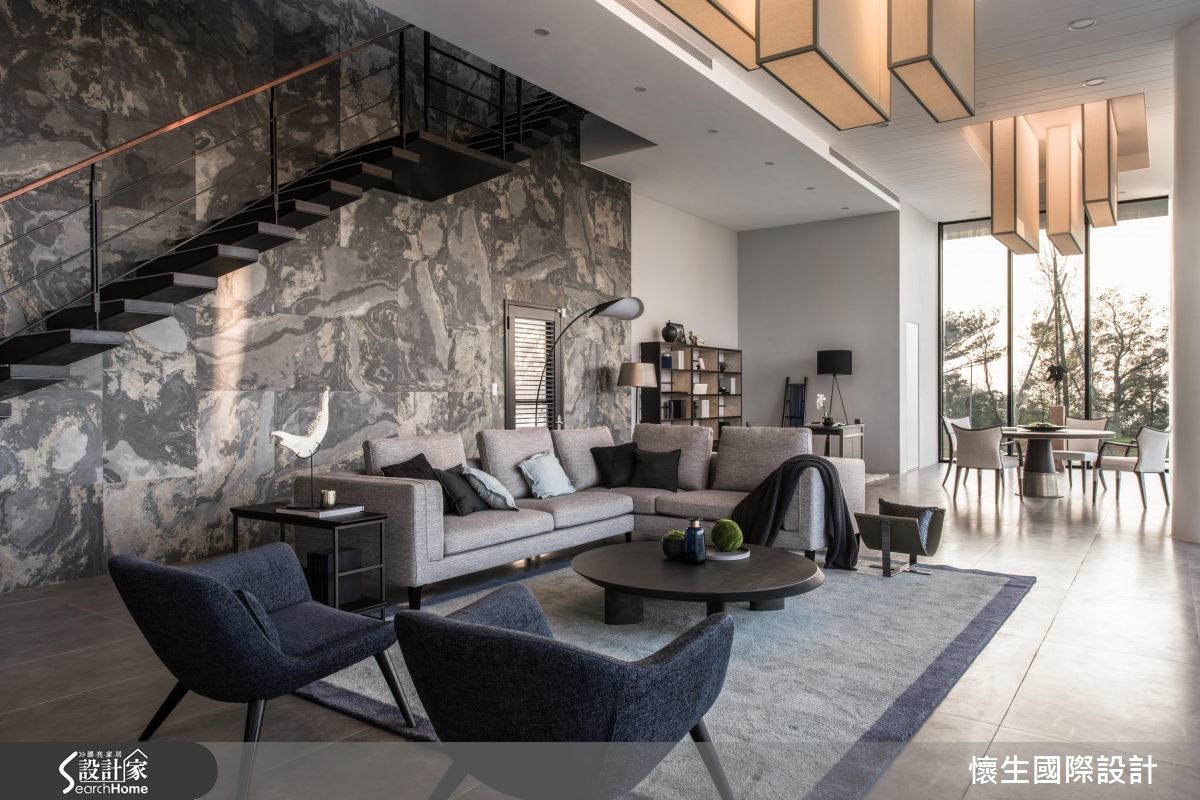 495平方米的独栋别墅,建物坐落于大面积的绿意草地,享有景观池塘环绕,设计师借引阳光、空气、水的美好条件,并以现代风作为语汇,构筑出里外皆美的庄园景致,快跟着小编进来看看吧!【大面落地窗,导入采光与景色】一楼公共空间,规划大面落地窗导入采光与景色,使视线可延伸向外,模糊室内外的分野,予人身处大自然的错觉,并在厅区天花做出独特设计,以垂降灯饰型构高低层次,打破空间的僵化感。【大理石墙面,创造恢弘大器感】整面大理石墙则充满行云流水的纹理,与向上的阶梯相融,构成恢弘大器的主视觉立面;同时以水泥粉光包覆私领域,型塑沉静恒定的空间感,成为衬托家具的素朴背景,把金属、皮革与木作烘托得更为细致,而随兴摆放的饰品软件等,则表露出居者的品味!