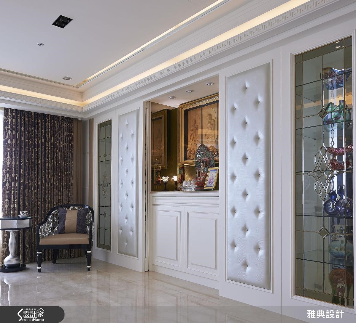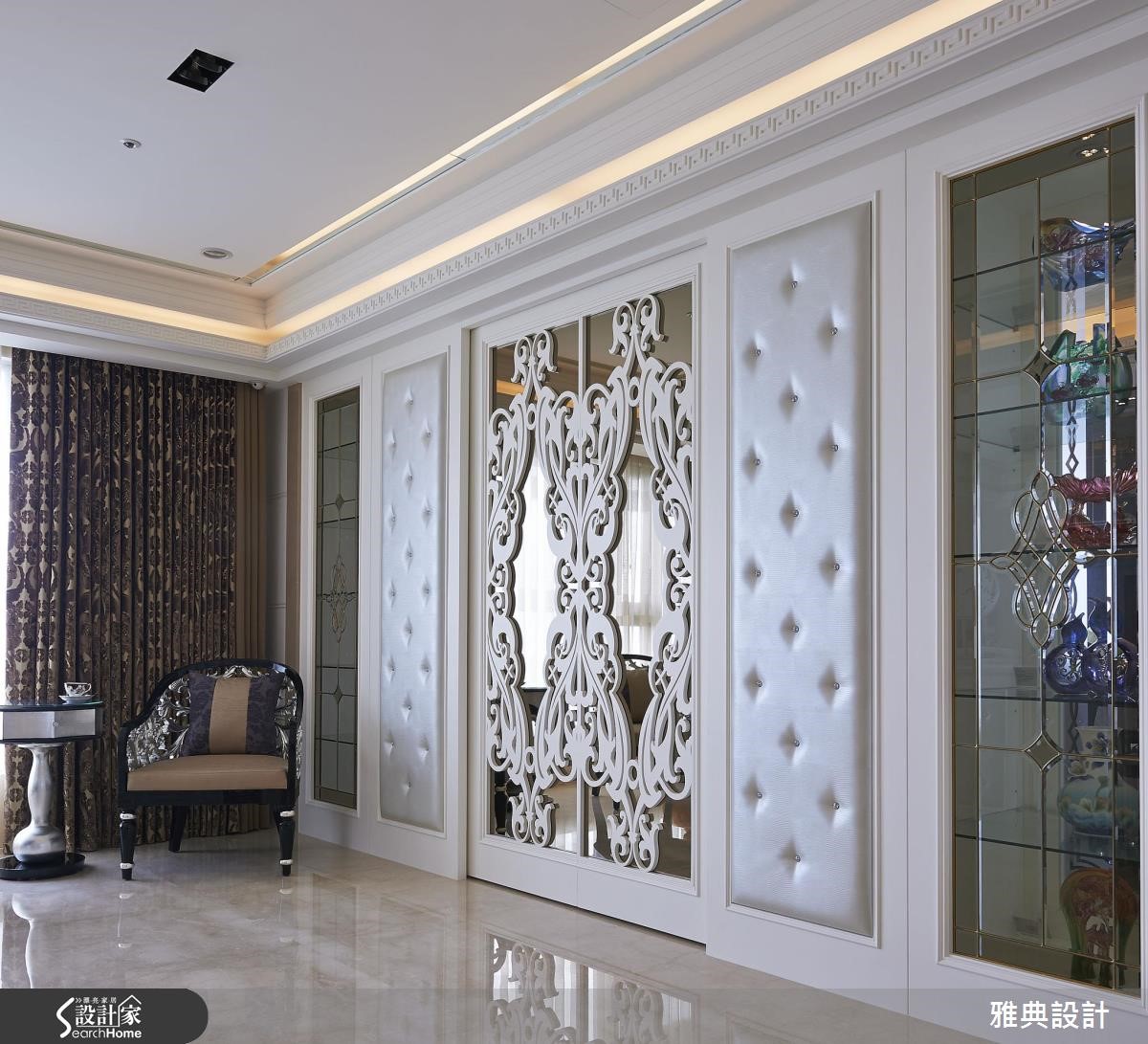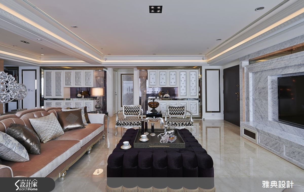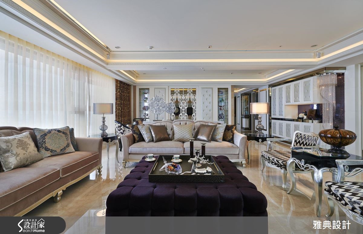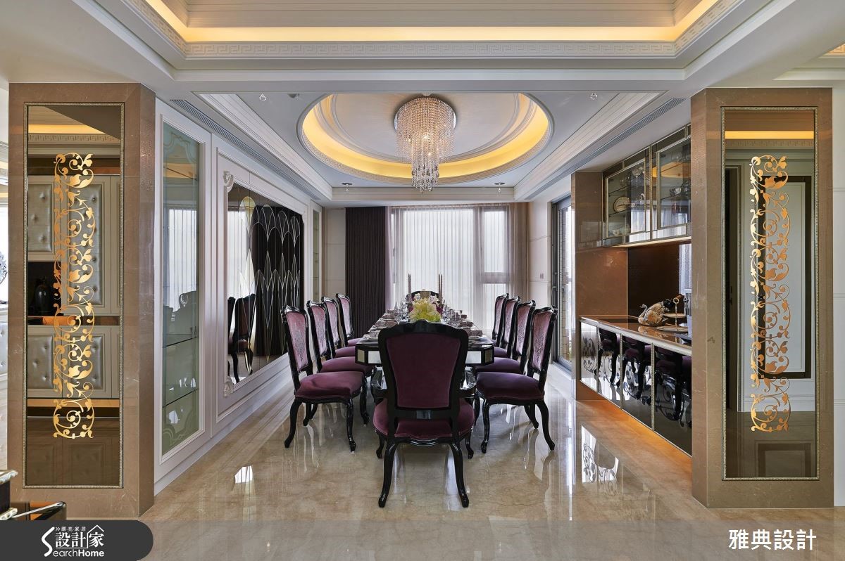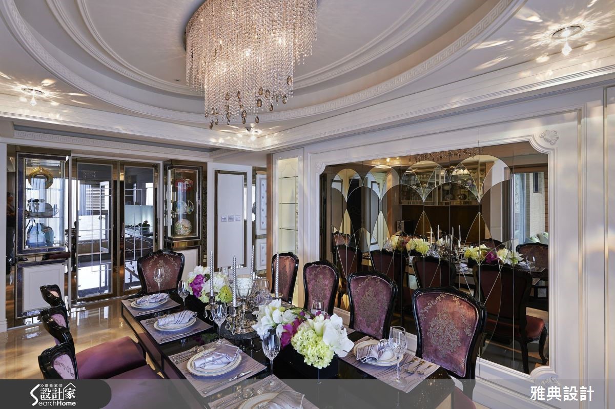 精工细致的389平方米新古典大宅,留出方格局,注入繁丽的雕花镜面、线板等设计元素,并加入璀丽的施华洛世奇钻饰,在每个细节中,展现出优雅的空间气场。【加上水晶,增添华美风格】步入客厅,宽敞的空间感及家具选择,散发着雅致大器的翩翩风度,由整体布局和收纳安排,随处可见新古典风格的优雅元素。沙发背后的雕花板镜面,不仅作为空间的主要焦点,更将佛龛巧妙隐藏,使风格营造更具一致性。同时,将两侧柜体加入绷皮并镶入水晶,搭配镶铜玻璃,除了展现精致的华美感外,透明的展示柜更让视线向餐厅处穿透延伸。用餐空间则以贵气的紫色为主轴,搭配对称的图腾雕花照明,营造隆重华贵的开场效果。