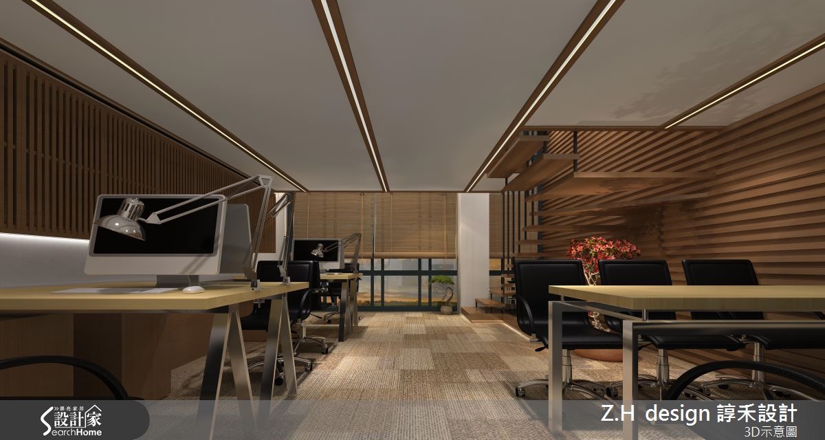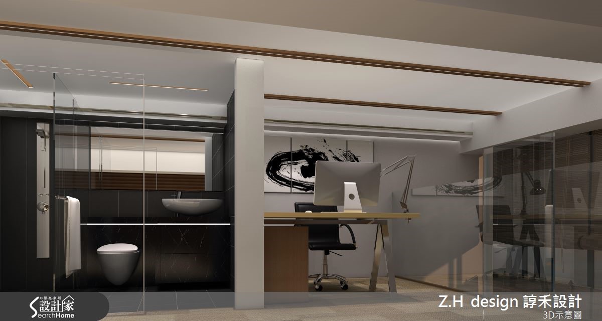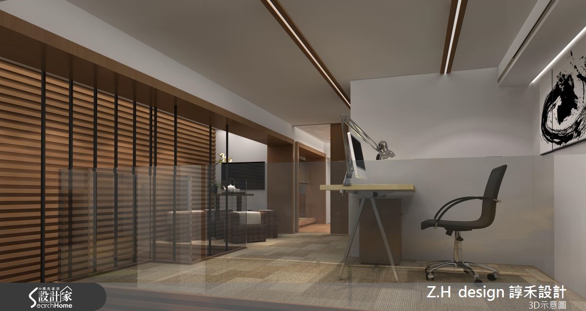 让大地色系成为空间的基底用色,以木纹肌理的质材为主调,结合绿意植栽的点缀,将户外的自然光接引入室,展现自然写实的生命力。【水墨点缀,调和出禅风质感】玄关以笔墨般线条挥洒于壁面,结合水墨画作及编织单椅,创造和风意象的迎宾视觉。办公区以白色调天花板与壁面结合木纹质材的妆点,感染温暖气息的同时又不失风雅;天花板利用木作描绘出沟缝造型,两侧壁面则以隔栅线条装饰,在纵横的视觉延伸中拉阔空间尺度。掌握梯下的畸零空间,藉由植栽与艺术雕像的摆设,塑造雅致的人文意象。二楼则规划出浴室、主管办公区及卧室,以玻璃材质作为隔断,透视感的设计替整体空间营造出开放、流动的气息;延续一楼的用色与材质,利用禅风意象与水墨画作的妆点,型塑细腻的日系风范。