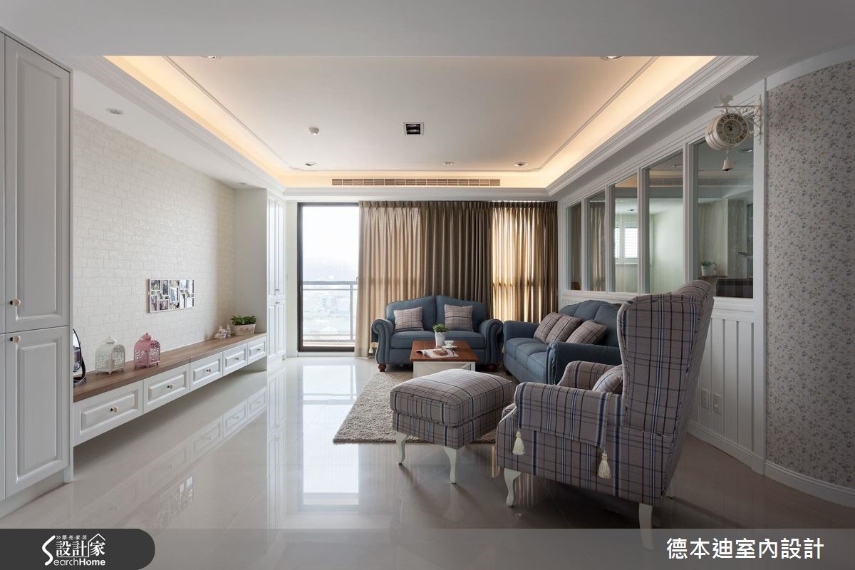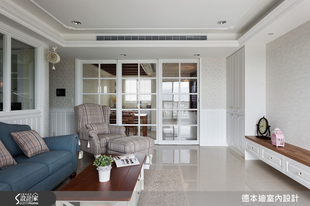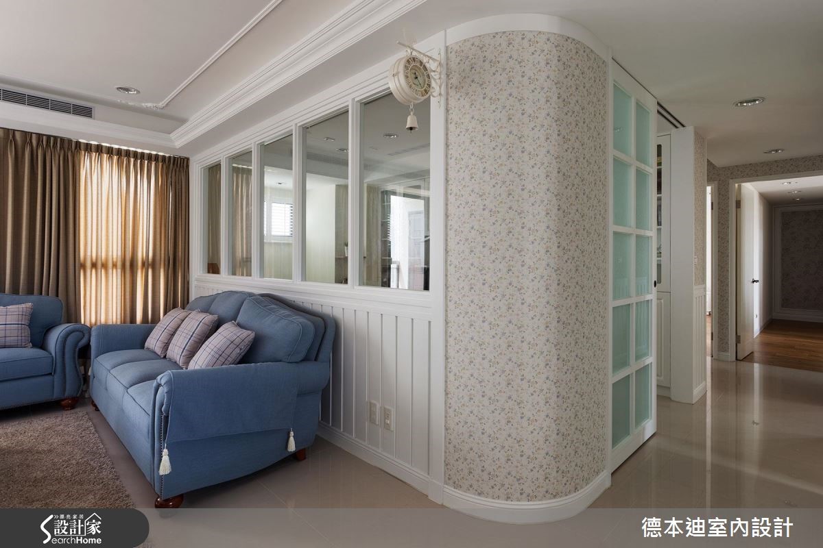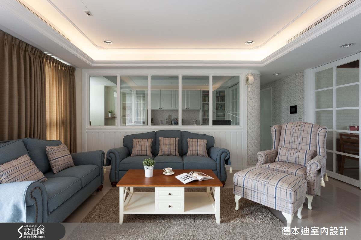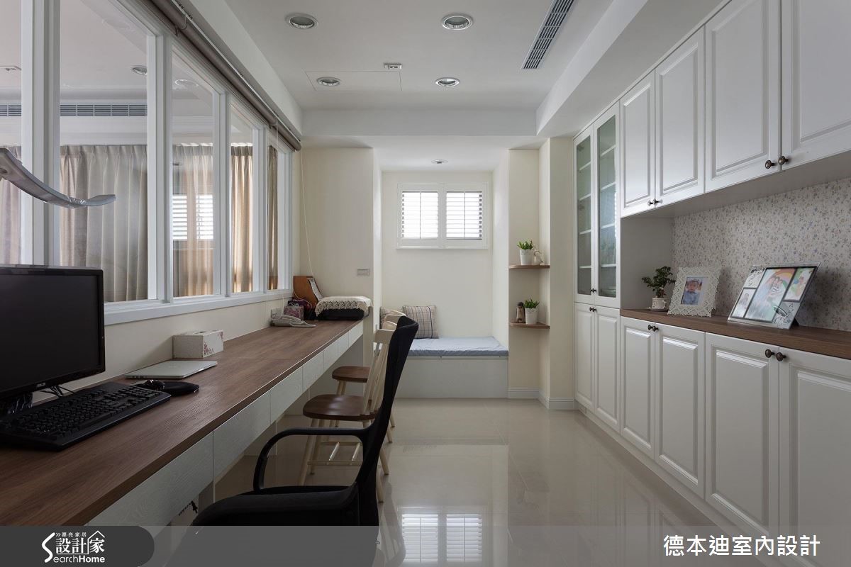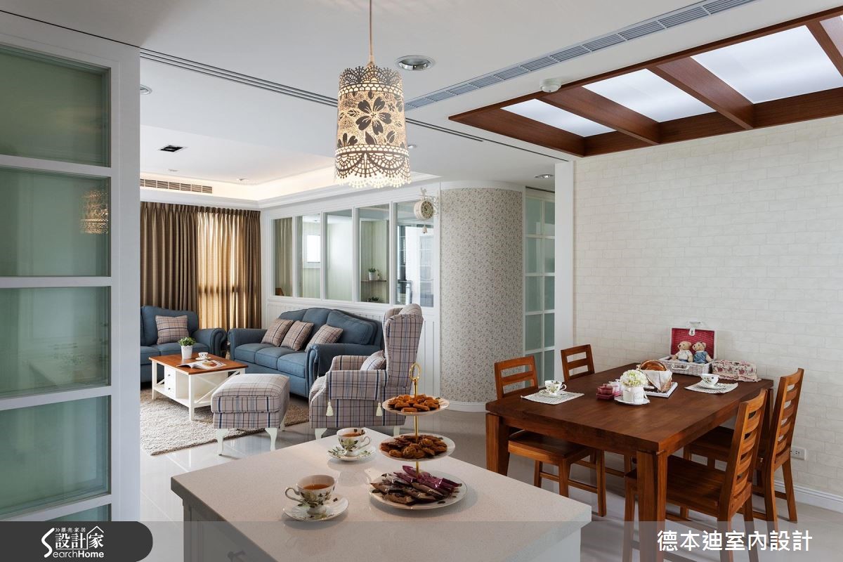 设计师以休闲感的美式风为空间定调,利用简约干净的线板串联全室,并以开放式的格局规划,搭配户外自然光感,塑造舒服的居家氛围。【玻璃拉门,营造宽敞空间视觉感】空间以清爽的白色调为主轴,电视墙两侧的对称柜体,不仅满足收纳,也展现和谐之美;开放式的客、餐厅,利用玻璃拉门弹性划分领域,当厨房进行烹调时,可拉上整片拉门,杜绝油烟味蔓延,平时则可全然敞开,让空间舒心宽敞。客厅后方利用玻璃隔断界定出书房领域,撷取透视的材质特性,营造出通透、敞亮的空间氛围;书房内利用大面积的书柜墙面以及延伸桌面设计,实现与家人共享阅读的乐趣,同时也满足屋主大量书籍的收纳需求。