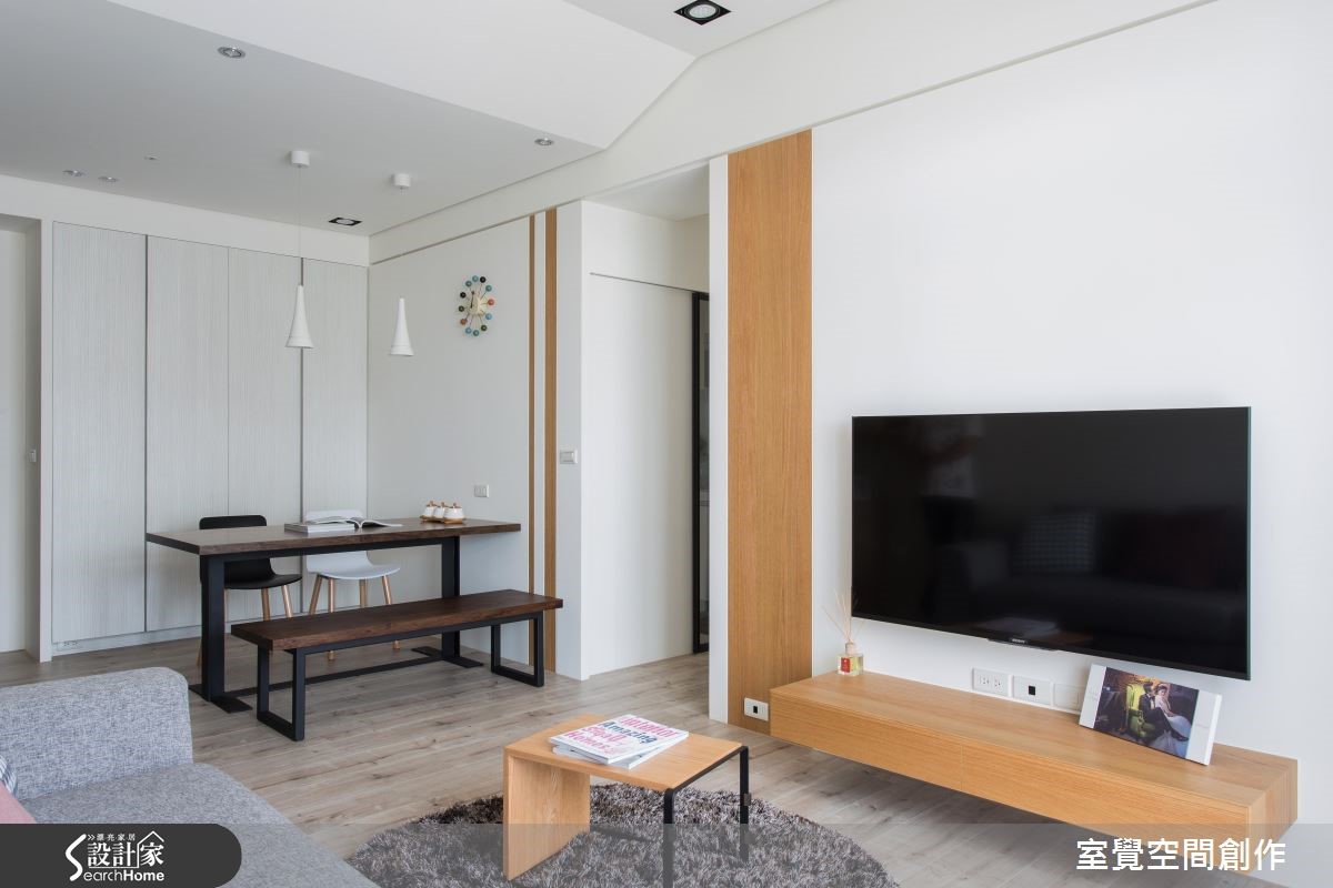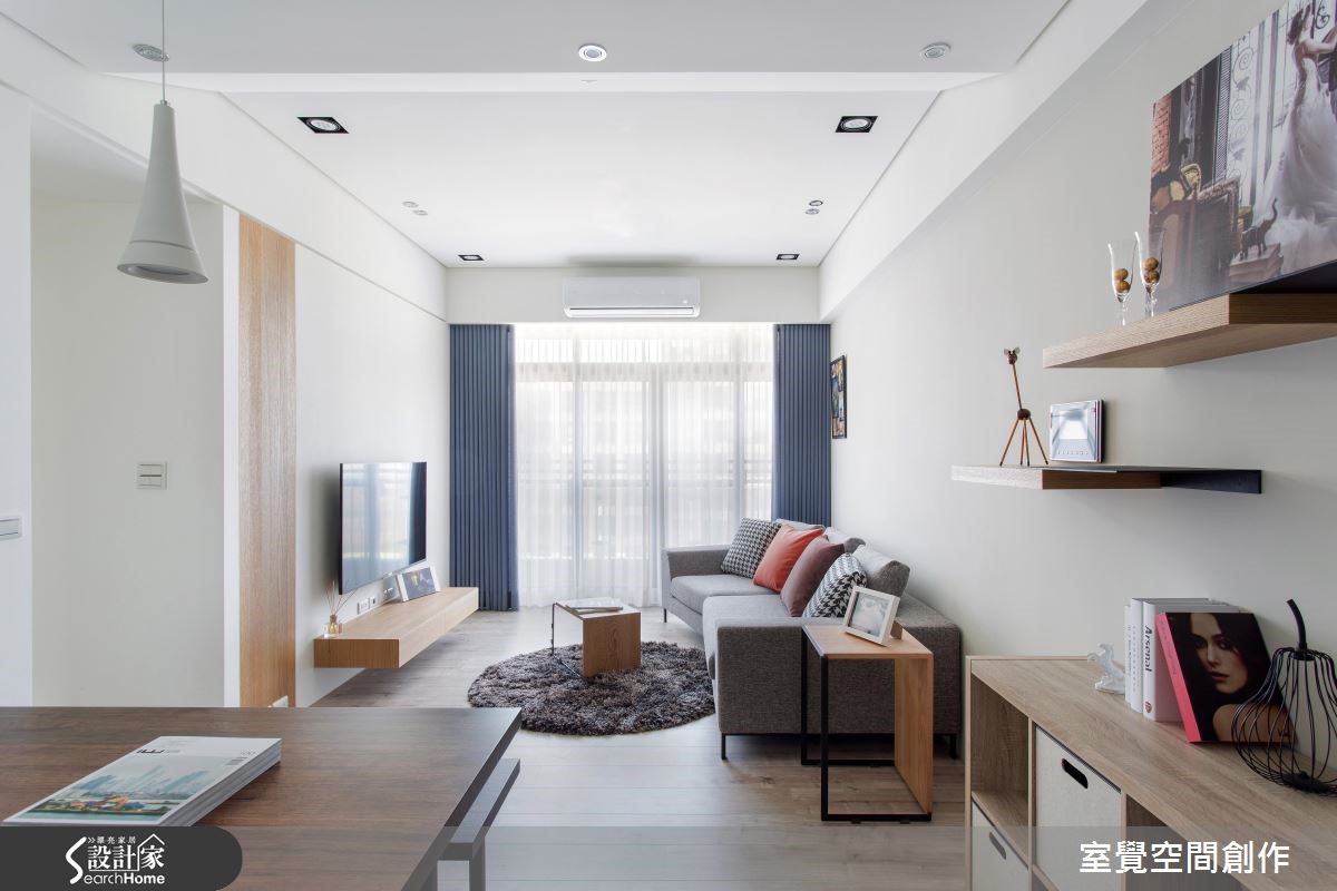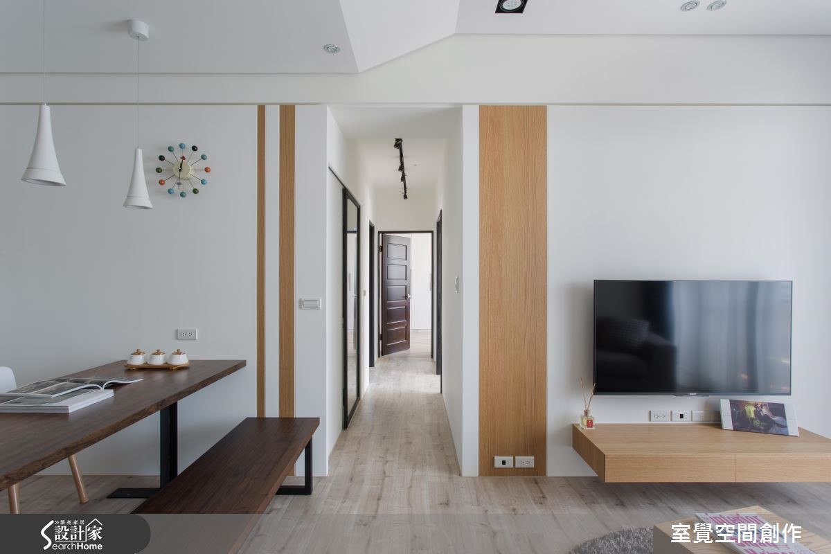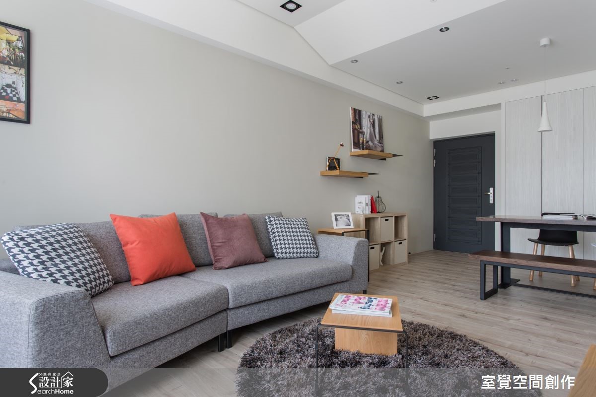 户外的暖阳穿越网纱窗帘,筛落满地柔美光感,衬托局部鲜明的木纹肌理,空气里散漾一股温润、恬淡的气息;在搭佐跳色抱枕、简约设计感的家饰,流露出人文风情。 【渐层天花藏梁,扩容挑高】公领域以开放式格局规划,天花板利用渐层的高度,巧妙包覆原有的大梁结构,创造视觉延伸让空间更显宽敞。将餐厅与厨房以实体墙区隔开来,且于壁面设计隔板与柜体设计,扩充电器柜、杂物柜与鞋柜需求,满足基本的收纳需求。在私领域的规划上,挪动原本主卧床头朝公共卫浴的配置方式,让出更多弹性空间,供收纳及未来婴儿床的摆设。大面积的白色柜墙保留了足额的收纳量,增添实用性。