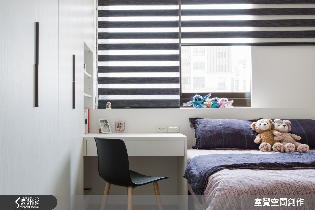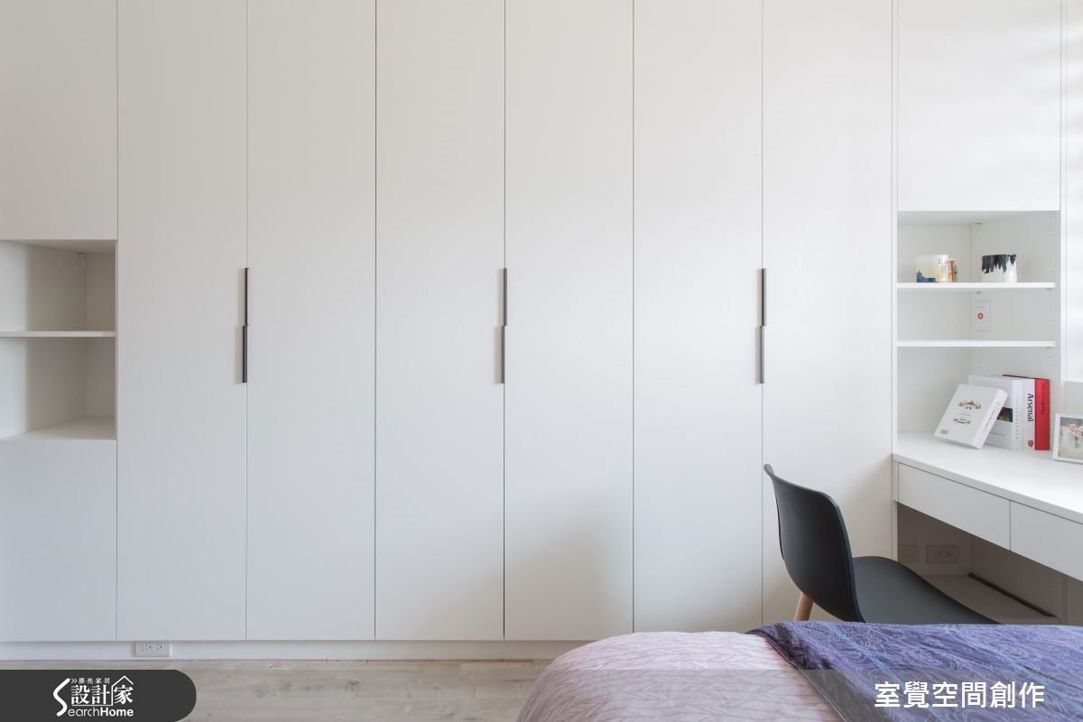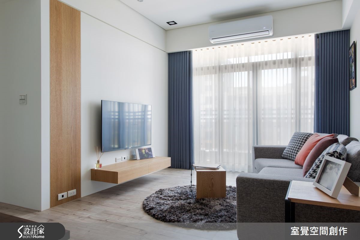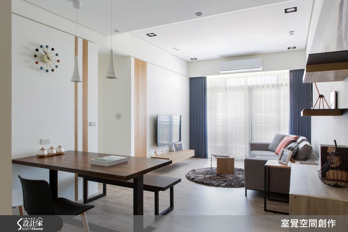 户外的暖阳穿越网纱窗帘,筛落满地柔美光感,衬托局部鲜明的木纹肌理,空气里散漾一股温润、恬淡的气息;在搭佐跳色抱枕、简约设计感的家饰,流露出人文风情。 【渐层天花藏梁,扩容挑高】公领域以开放式格局规划,天花板利用渐层的高度,巧妙包覆原有的大梁结构,创造视觉延伸让空间更显宽敞。将餐厅与厨房以实体墙区隔开来,且于壁面设计隔板与柜体设计,扩充电器柜、杂物柜与鞋柜需求,满足基本的收纳需求。在私领域的规划上,挪动原本主卧床头朝公共卫浴的配置方式,让出更多弹性空间,供收纳及未来婴儿床的摆设。大面积的白色柜墙保留了足额的收纳量,增添实用性。