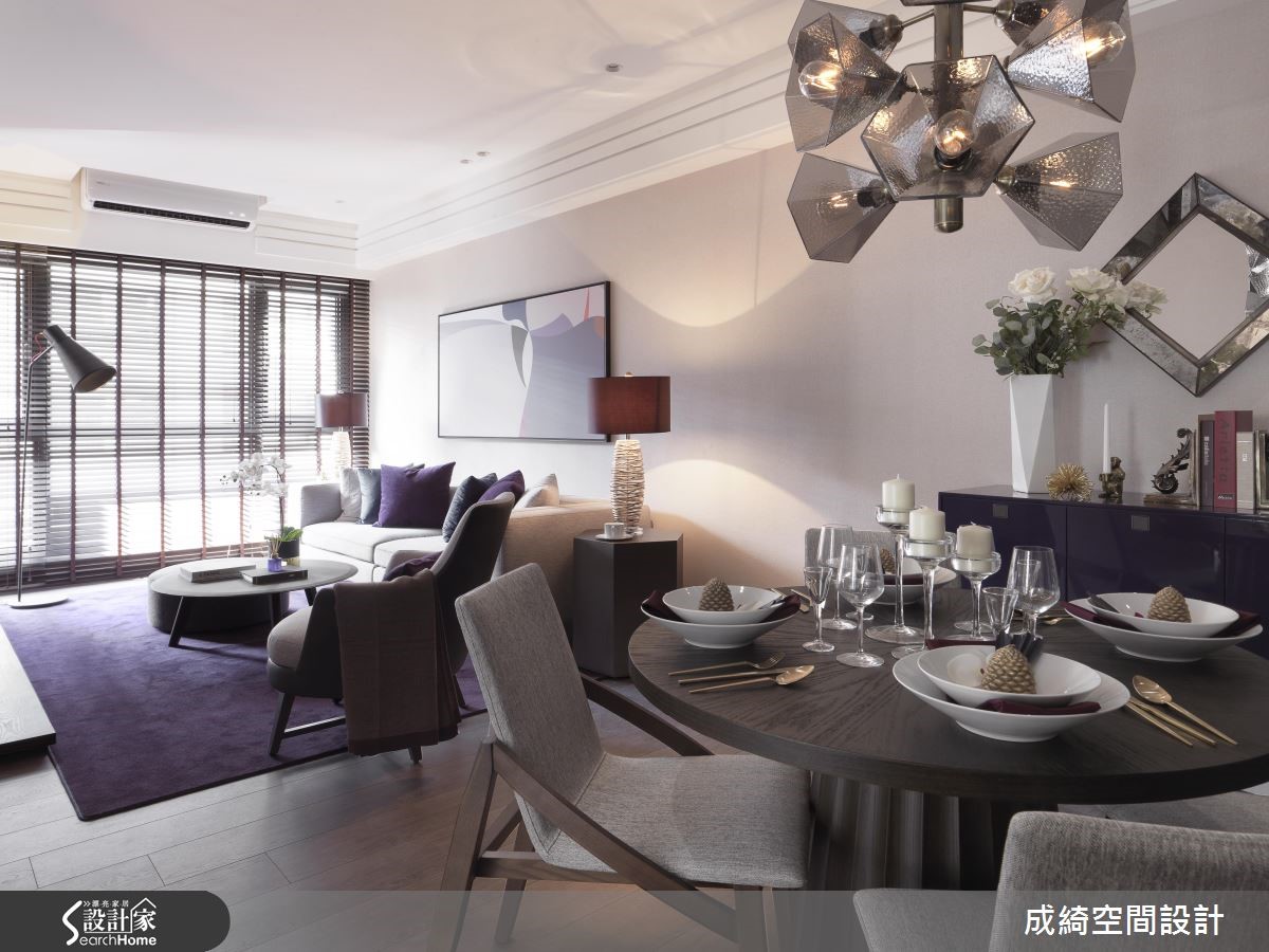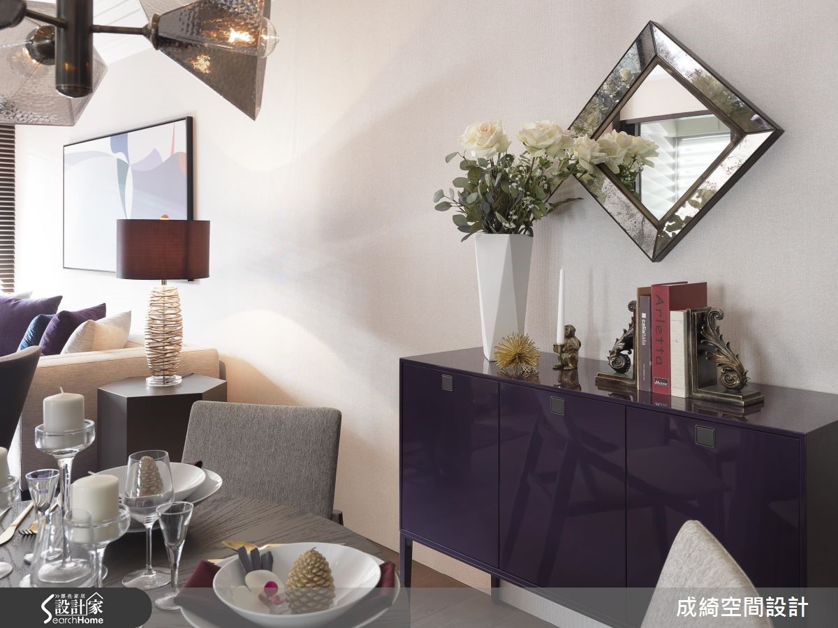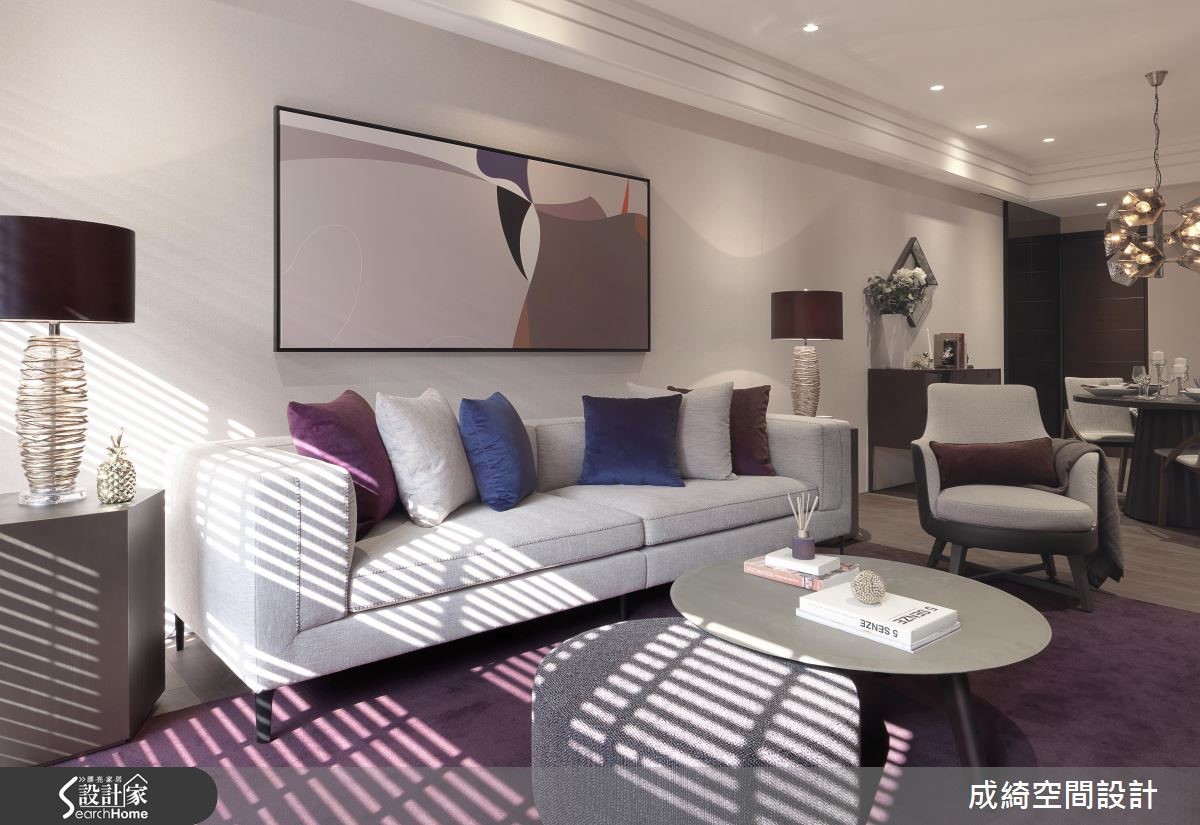 针对预算有限的新婚夫妻需求,设计团队将木作、泥作的预算降低,不大动格局。并将亮点放在色彩搭配,以紫外光为主轴,搭配银色灯具和墙饰。以家饰家具展现宛如酒店般的质感,打造甜蜜的新婚居家。【金属家饰,创造轻奢质感】设计团队把预算放置于天花与电视墙,利用线条简约的线板框设天花,接着以沉稳的实木材质,排列利落的电视墙面。搭配能随时调节光线的木百叶,创造温润不失质感的现代风尚。本案以紫外光色系为主角,运用大面积的地毯呈现紫外光的微熏色系,并以深浅不一的紫色抱枕,打造丰富的视觉层次。除了更有效减省预算,也方便日后换房时带走。设计师更巧妙善用有著金属质感的银色灯饰,创造宛如美术馆的艺术质感。