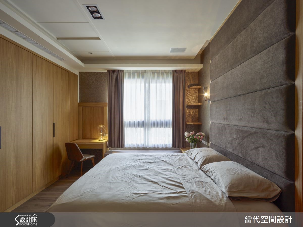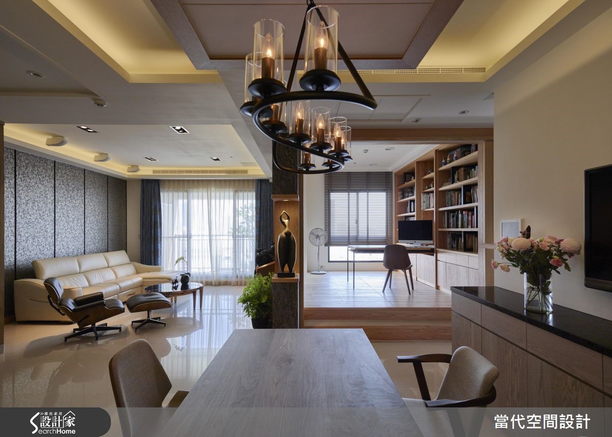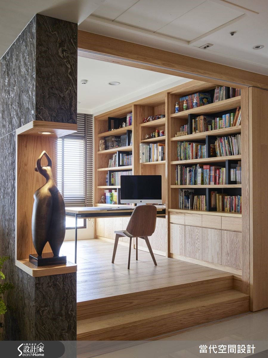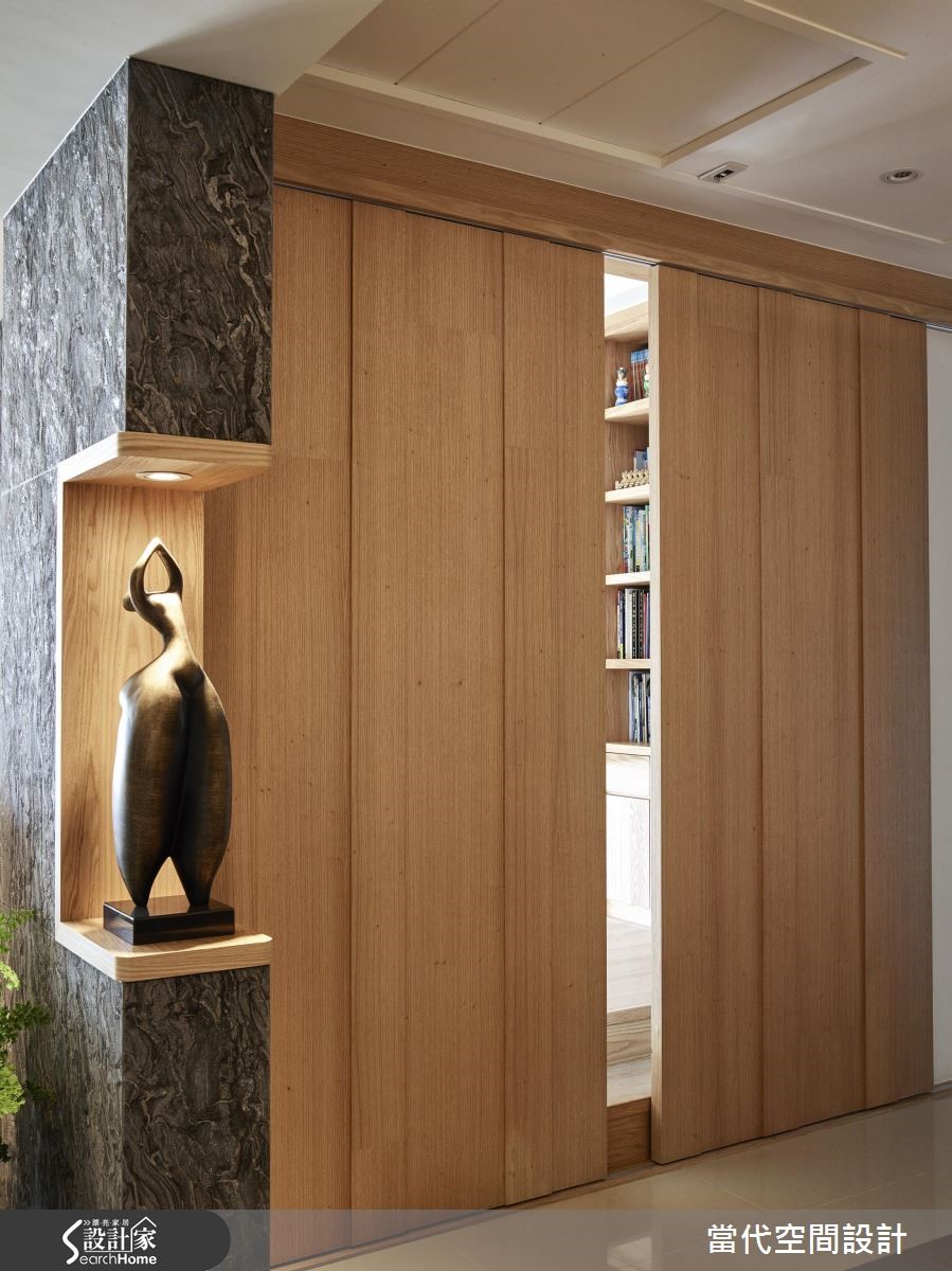 屋主自预售屋客变(客户变更;建设公司在施工阶段依照屋主需求,预先提供变更格局、设备等服务)就开始与设计团队合作,设计师鉴于屋况优良、格局方正,仅微调部分空间,将主力放在吻合屋主需求的人性化设计上打造定制宅! 【运用巧思让神龛和风格不显突兀】由于屋主有神龛需求,特别将佛桌安置在玄关处,并利用镂空屏隔作出空间区分,将传统元素对现代风格塑造的影响降至最低,同时也利用L型柜体维持充裕的玄关收纳、并巧妙区隔用餐空间。【利用双层天花板化解横梁】针对餐厅横梁的问题,设计师以双层天花板拉伸层次、虚化大梁,并搭配流线造型餐灯营造时尚氛围。多功能和室则垫高地坪,纳入隐藏式收纳,佐以大面积书墙与拉门,随时可收进柜子的书桌,使和室身兼书房与客房机能。