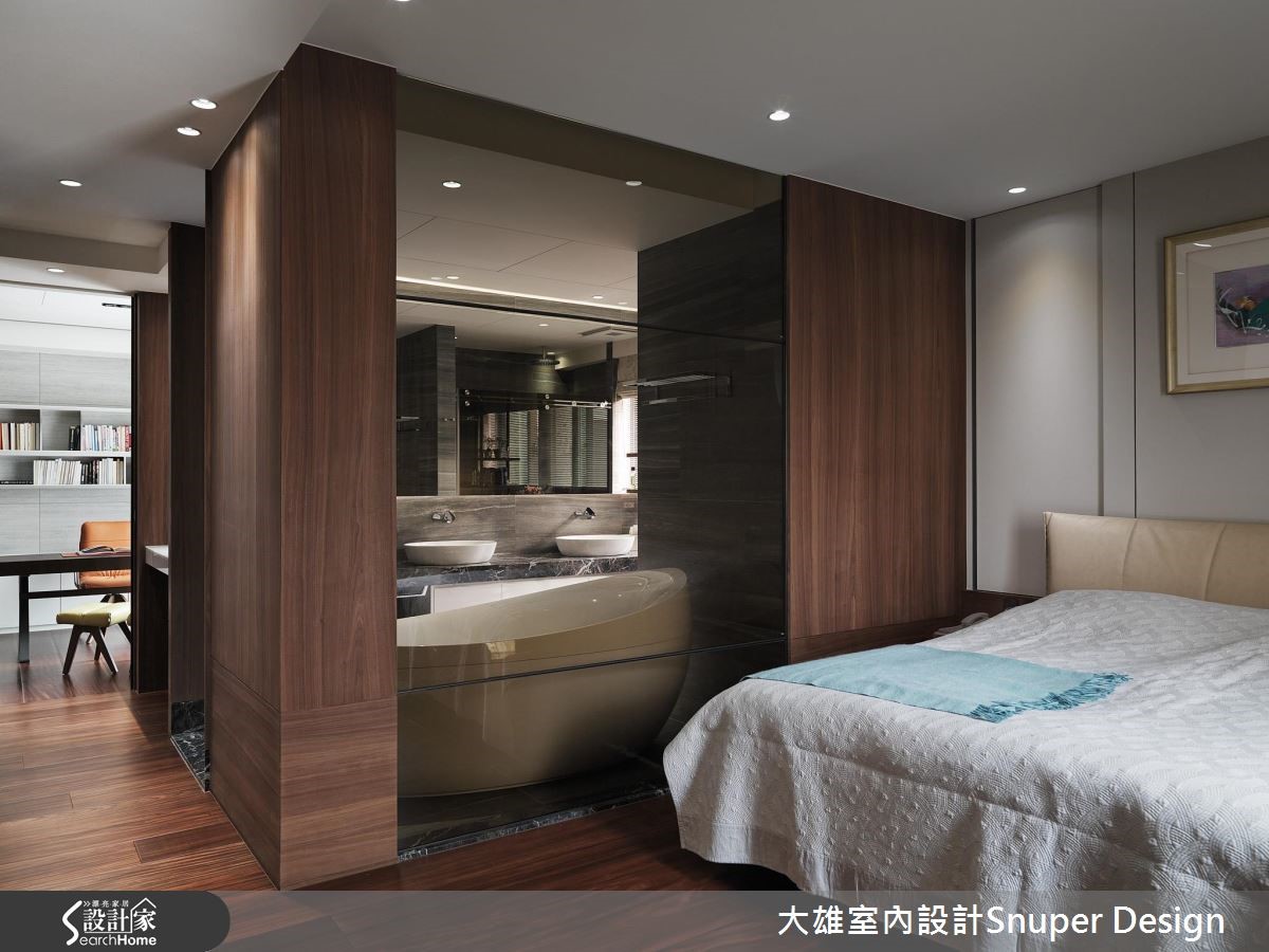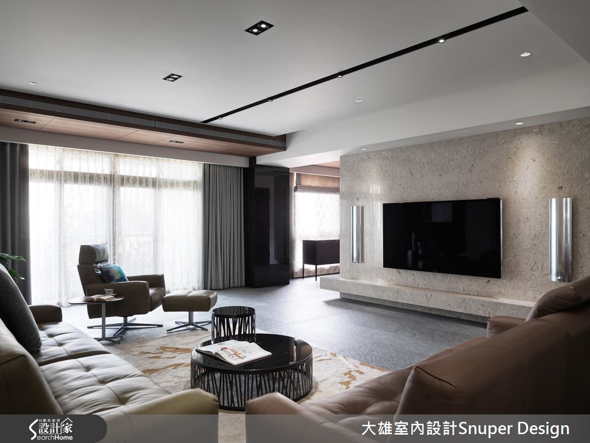 走进221平方米的现代风大宅,像是漫步于德国黑森林般的庄园居家,既沉静而舒适,设计师卸除多余的色彩和装饰,保留了温润的自然色调,并以不同温度的石材,大方地切分、堆栈出不同的接口层次,在呼应户外景貌的同时,也在都市生活与自然之间取得和谐平衡。【全开放设计,享受宽阔视角】客厅、餐厨及阅读区,采用全开放的方式,设计师将公共空间置于十字轴线之上,并对应两处阳台空间,使景深得以向外延伸发展,无论身处于何处,皆能拥有优良的宽阔视角,顺带也引入窗外的自然绿意,形构与生活的对话互动。【木质与玻璃,浴室也能成风景】私领域则分布于轴线的左右,将自然光线尽可能地引流至每个空间,创造明亮的采光效果。而卧室规划则在浴室墙面结合木质和玻璃材质,让未使用的浴室也能成为卧室区的独特风景,带来虚、实之间的视感转换。
