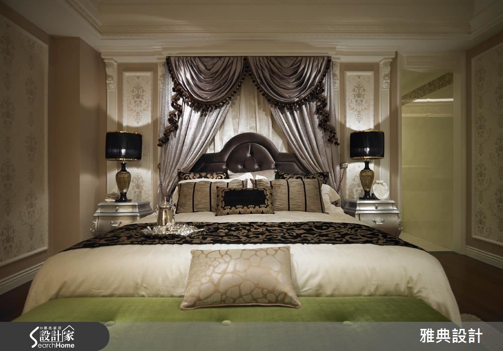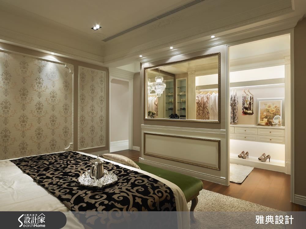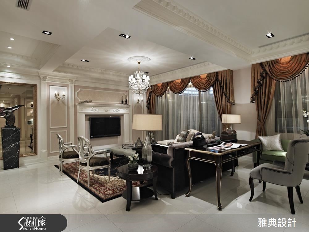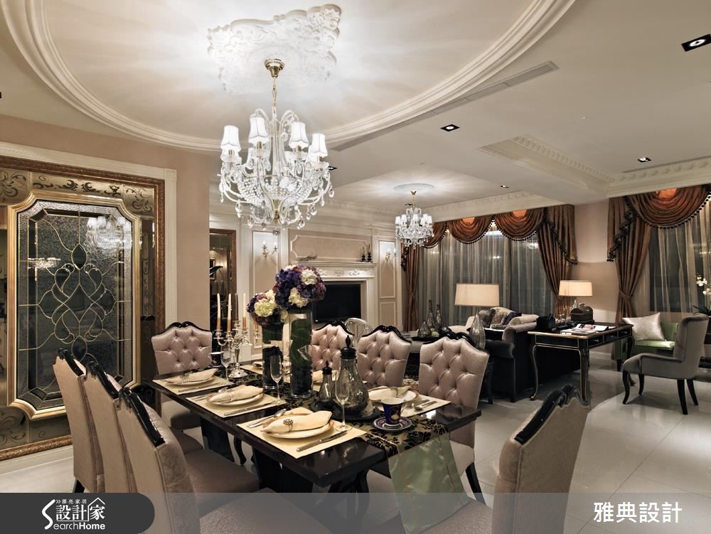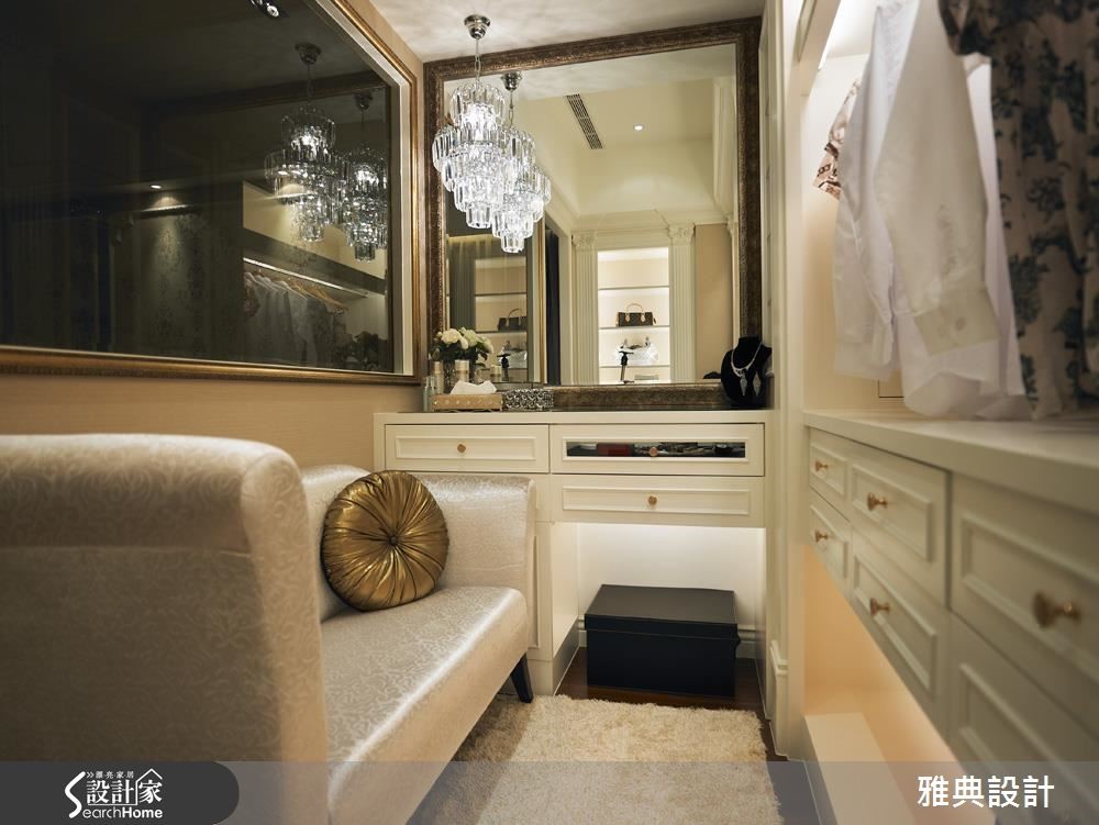 在女设计师的笔下,新古典风格除了大器奢华,还有著优雅与细腻。264平方米的大宅中,不仅藉由材质、家具铺排华丽气场,更在细节中体现巧思,满足女性们的豪宅美梦,快跟着小编一起走进来看看吧。【灯饰和家具,铺排古典气质】空间采以白色为基底,带入金银的穿插运用,并于天花及壁面揉入雕花线板,刻划着柔美细致的居家线条。布置上,则给予带有分量的温暖,搭上水晶灯撒落的层次光影,阐述迷人品味。公领域以开放式布局强化空间延伸感,藉由大面对称展示柜陈列画饰与瓷器,与电视墙形成唯美的对话。餐厅天花做出圆型线板,与吊灯的晕柔光氛相得益彰。并与客厅的主灯形成呼应,产生远近深浅的视觉意趣,下方搭佐古典餐椅,促成柔美的用餐气氛。主卧床头则加入独特设计,透过布幔线条彰显布料的滑顺质地,搭配着光影折射,奠定有如宫廷般的雍容视野。而绿色床尾椅的跳色聚焦,亦让整体视觉更形丰富。更衣室则采用清玻璃呈现穿透视野,并让衣物、配件、鞋包等妥善置放,体现设计师细腻的女性思维。