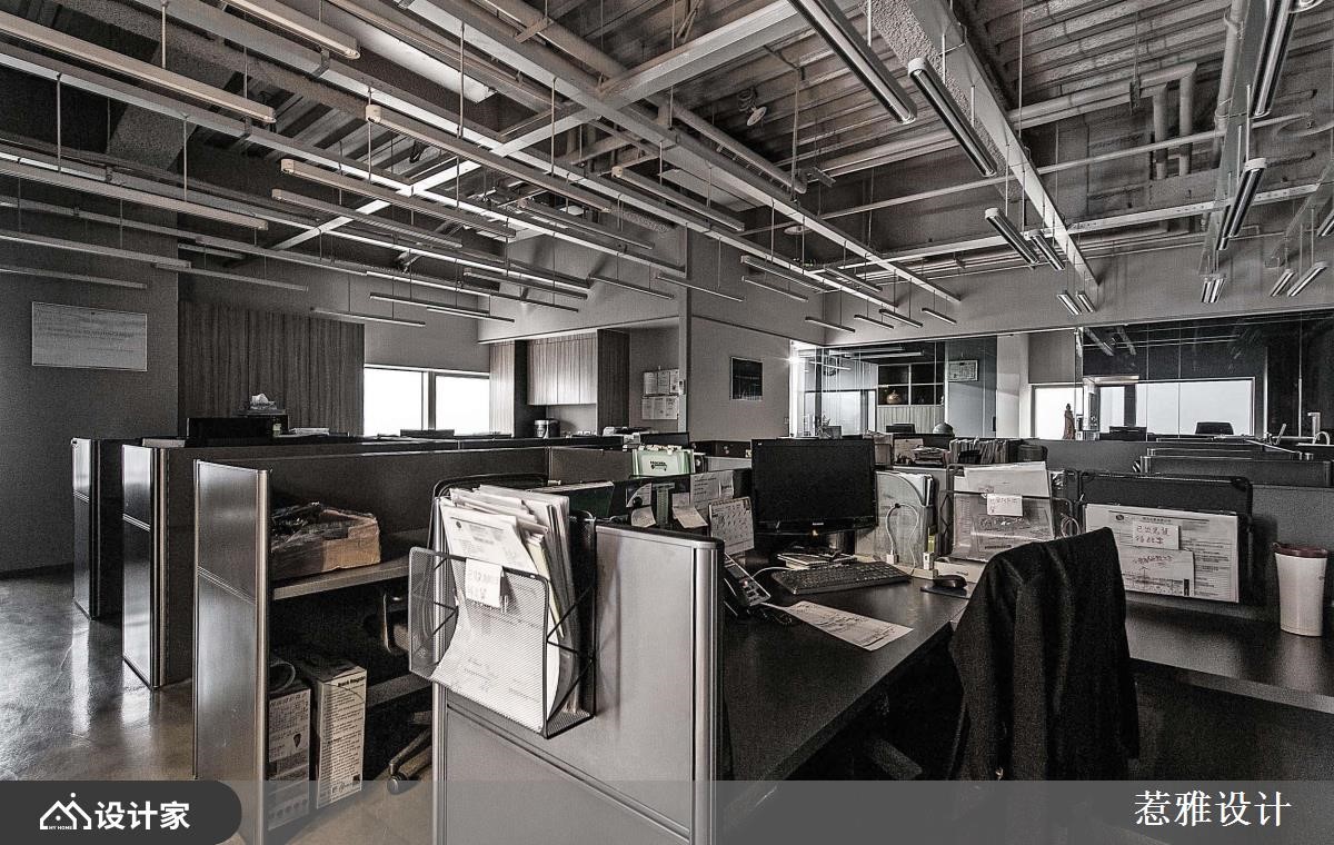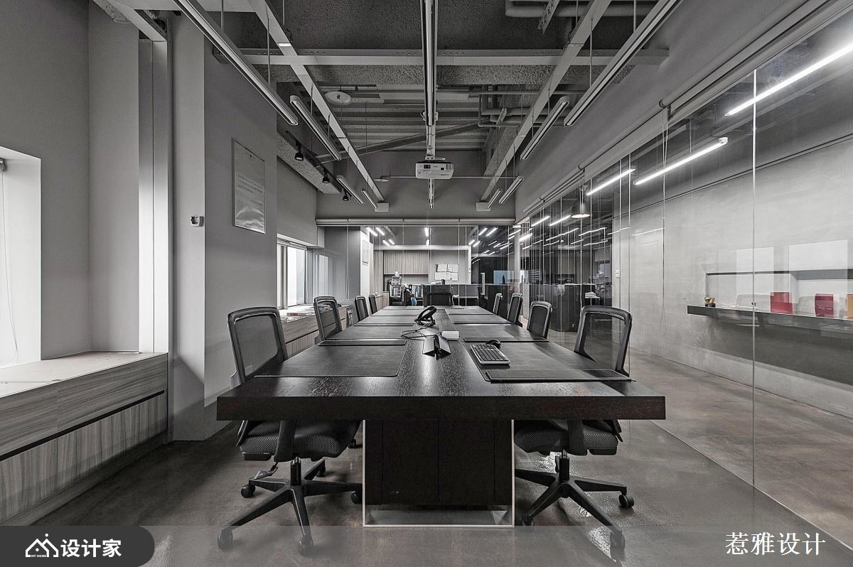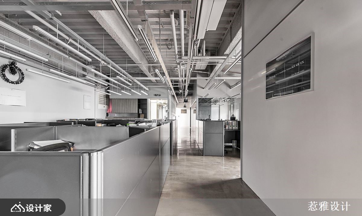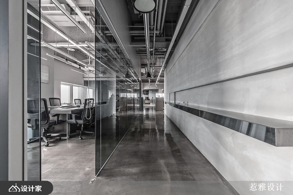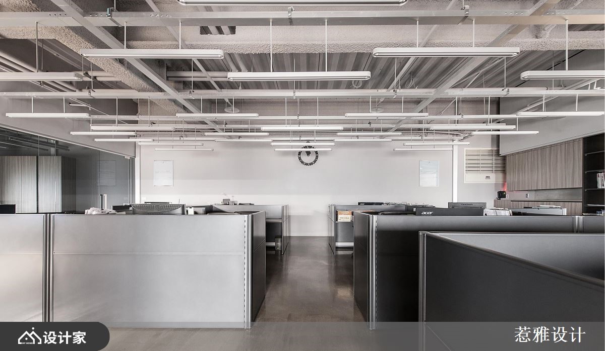 销售工业用机械及相关产品为主的公司,设计师针对其企业属性,运用光亮的金属建材植入经典形象,并结合粗犷Loft元素、利落的线性语汇等,打造出阳刚中带有微奢华的写字楼新风貌。【异材质混搭,阐述摩登品味】入口有如空间盒子的隧道开口,大面积金属面材、圆型灯饰的摆置,凝聚方中带圆的端景意象;办公场域则以裸露天花板,带出Loft风精神,且加入带有纹理的雾面石材、木皮,与玻璃、金属、镜面等形成对比,阐述着工业风的摩登品味。【线性灯饰,勾勒理性线条】梁体以大量而重复的线性灯饰、勾勒利落的理性线条,底下对应工作座位的稳重块体,形构充满趣味的平衡画面;格局安排上,除了利用开放布局、赋予大器场景外,亦以深色玻璃界定会议室与公共区域,在保有隐私,也具采光与视觉互动!
