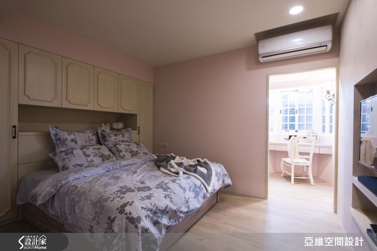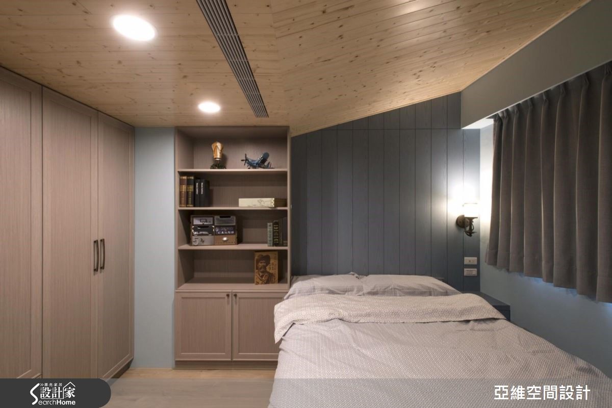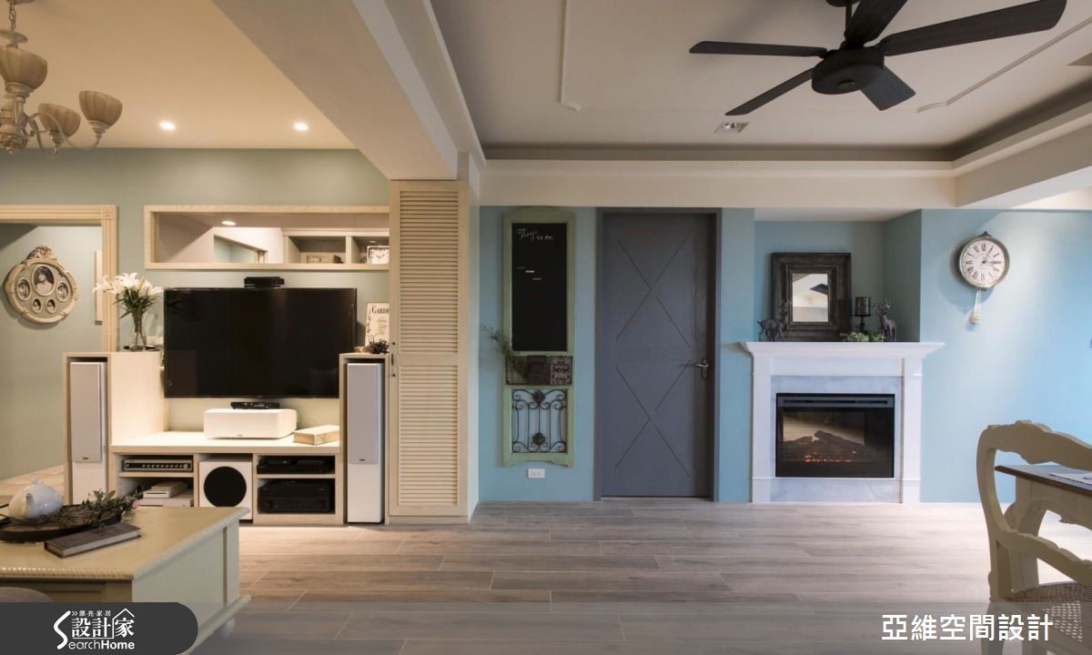屋龄35年的165平方米老屋,虽具有漂亮的绿意风景,但屋内却遇到老屋常见的采光、漏水,以及动线机能不佳等,在设计师的规划设计下,除了彻底改善老屋体质,也重整庭院空间,打造出适合全家享受日光、喝杯下午茶的休憩角落。【线板细节,展露欧式优雅风情】以温雅的浅蓝色为色彩主调,客厅和餐厨呈现宽敞舒适的开放式关系,并藉由门廊、天花板处的线板细节以及预留的电子壁炉,显现优雅的欧式调性。餐厨区正迎户外绿景,沿着窗畔设置飘窗,让居住者随时都能感受到清新的自然气息。【厨房延伸台面,增加料理空间】采L型配置的厨房,外部延伸台面,可作为平时的备餐台,下厨时可以享有更宽敞的料理空间,并与餐桌区划分领域归属,厨房墙面贴饰复古花砖,搭配乡村感十足的柜体门片,营造出悠闲浪漫的异国风情。
