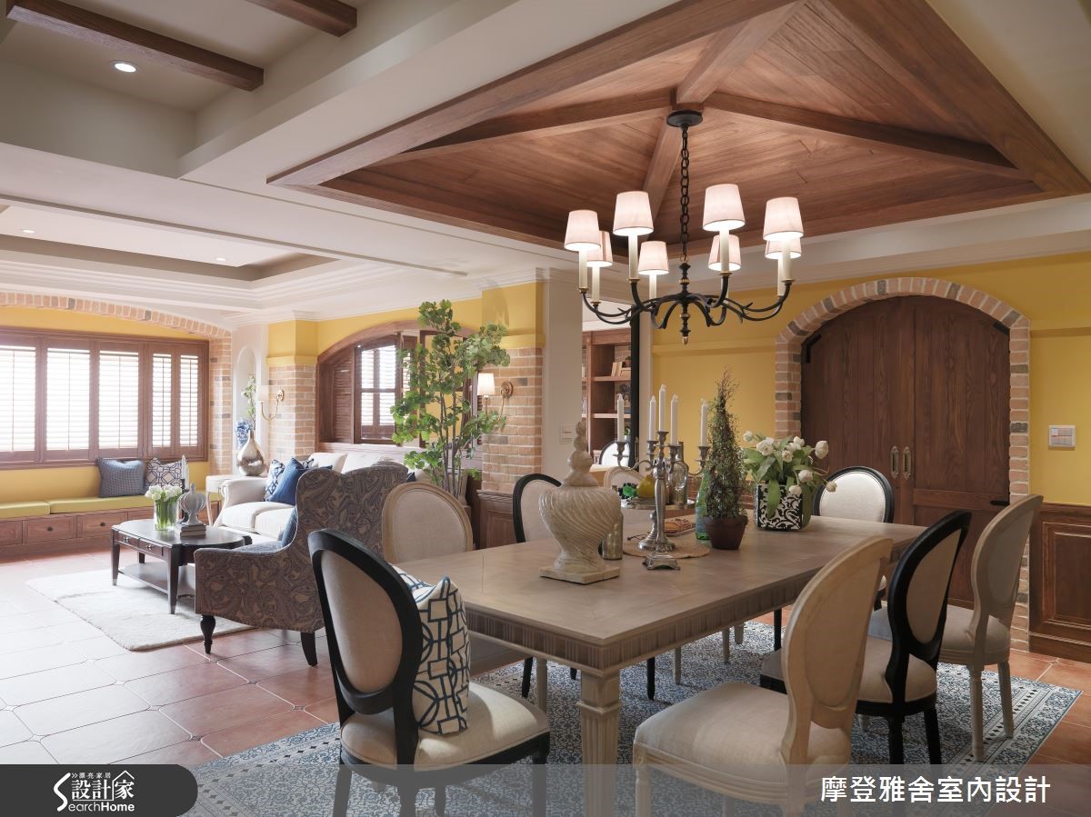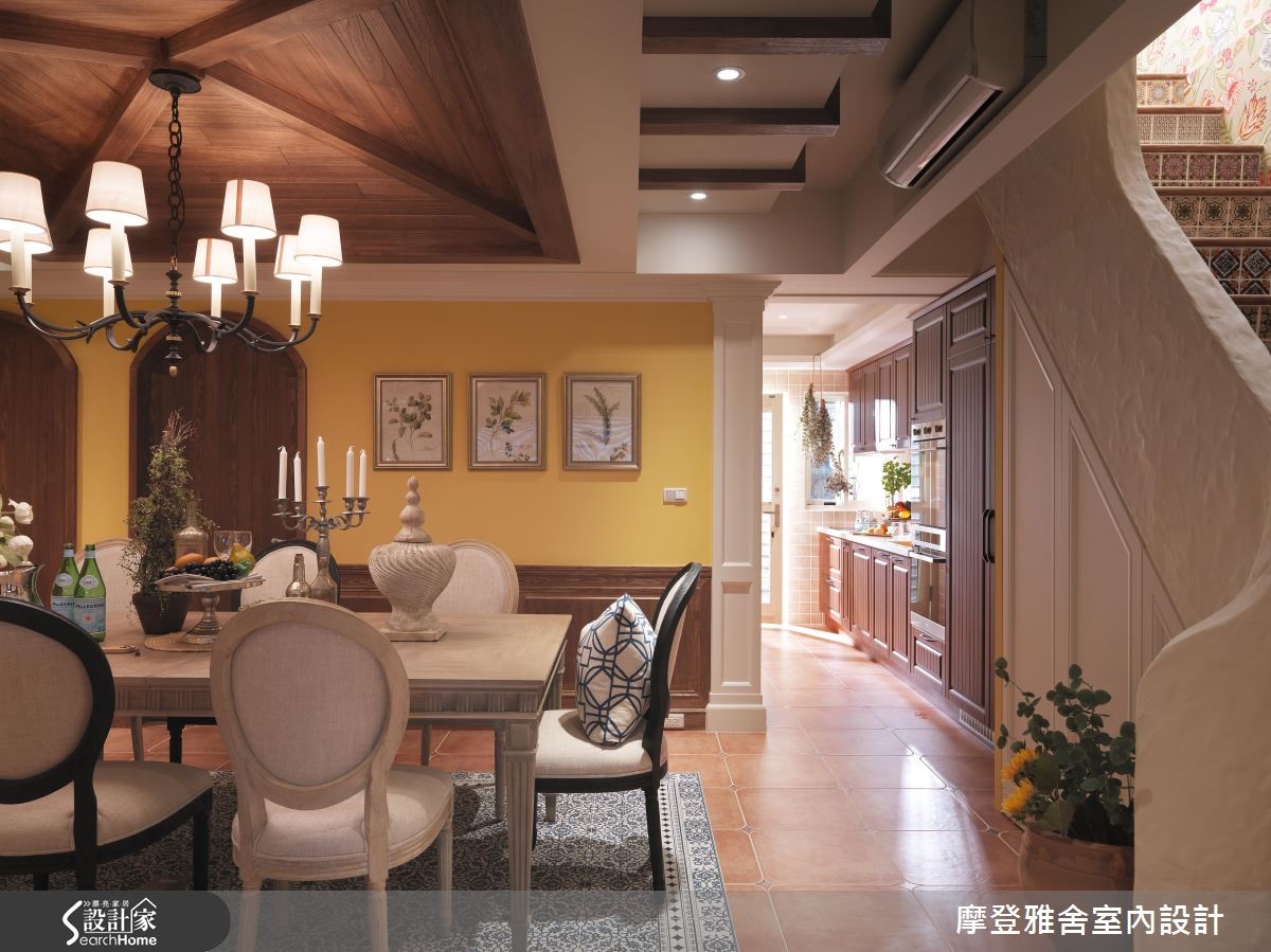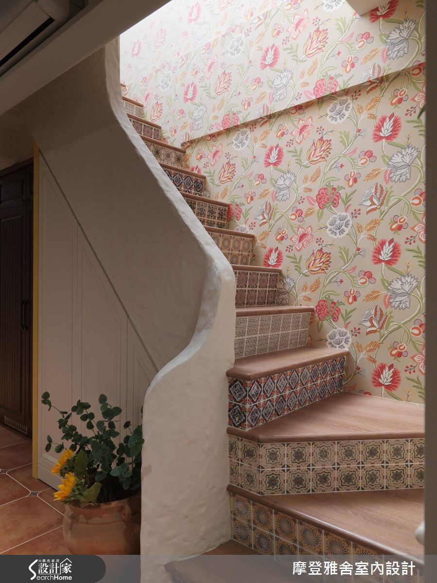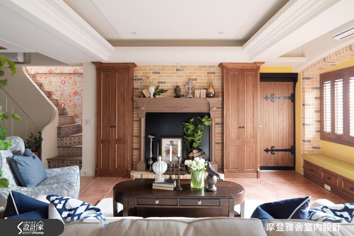 198平方米的复式楼,是喜欢旅行、热爱艺术的男主人新居,设计师将不同国情的乡村风融会贯通,把多种元素挹注于空间内,让生活即像度假,一次满足屋主环遊世界的异国梦,快跟着小编一起走进来看看吧! 【木纹与艺术色彩,谱出生活质感】客厅陈设南法情怀软件家具,电视墙引用温润铨木皮、搭上可可色仿壁炉与刷色文化石,演绎西班牙的温暖情调;沙发后方开设室内窗,让书房、厅区衍生连结;餐厅以斜屋顶天花,打开一旁别具风格的木作门片,就能看见美丽的洗手台。【美感与机能兼具,创造交流天地】厨房旁巧妙将冰箱隐于柜体内,一旁楼梯底部更善用空间作足收纳,把机能隐于无形;二楼呈现出峇里岛的度假风格,採仿洞石瓷砖铺贴电视墙,并透过圆弧收边缓和锐角,配置吧檯与阳台,让起居地成为三五好友相聚的绝佳场域。【东西文化相融,处处是浪漫风景】楼梯,是空间的过度地段,将每一踏阶都贴上不同款式的瓷砖,映衬着墙面聚焦的壁画,让梯间洋溢着希腊情怀!主卧用线条搭配浪漫纱帘,带出东方风格的氛围,床头则利用柱体深度作出三座拱门,以设计巧妙化解空间缺陷!