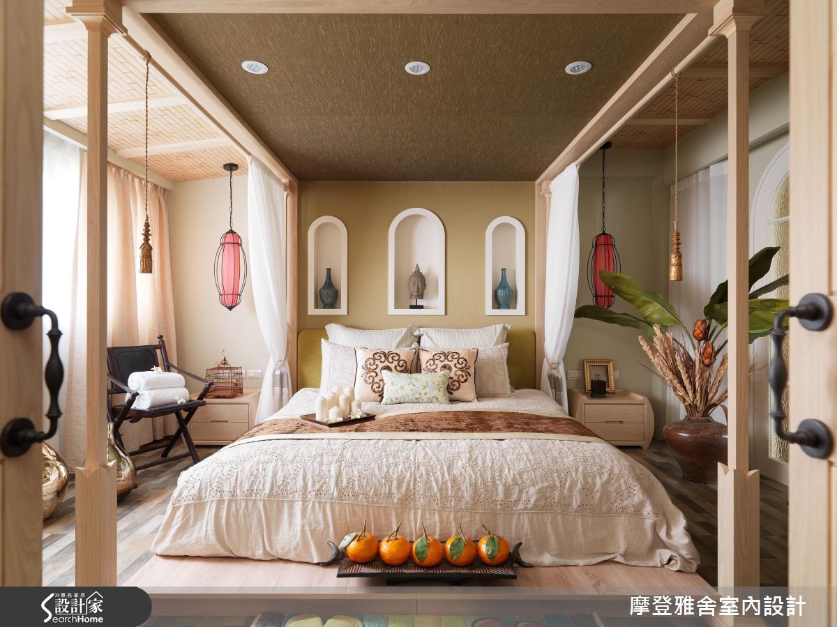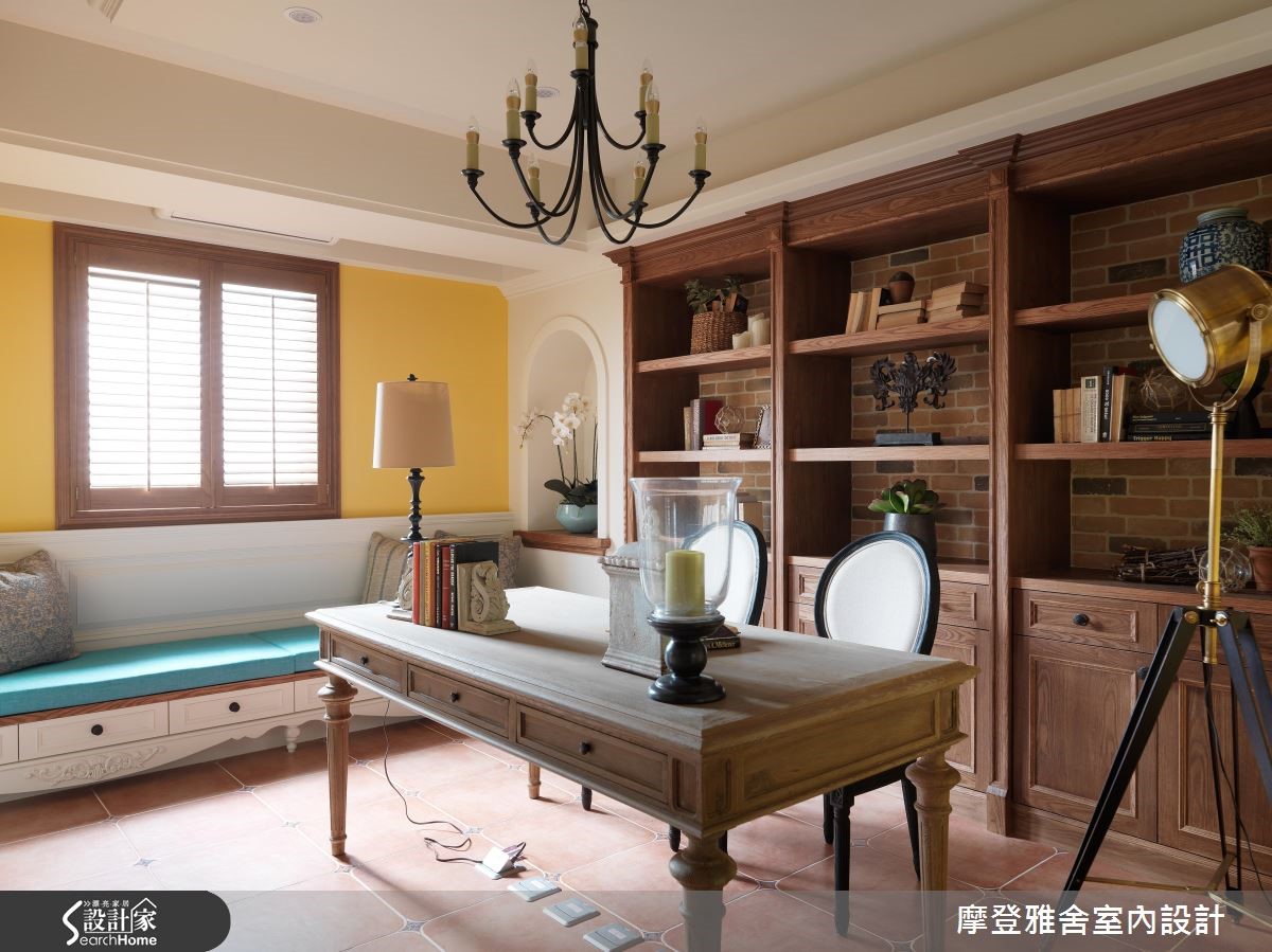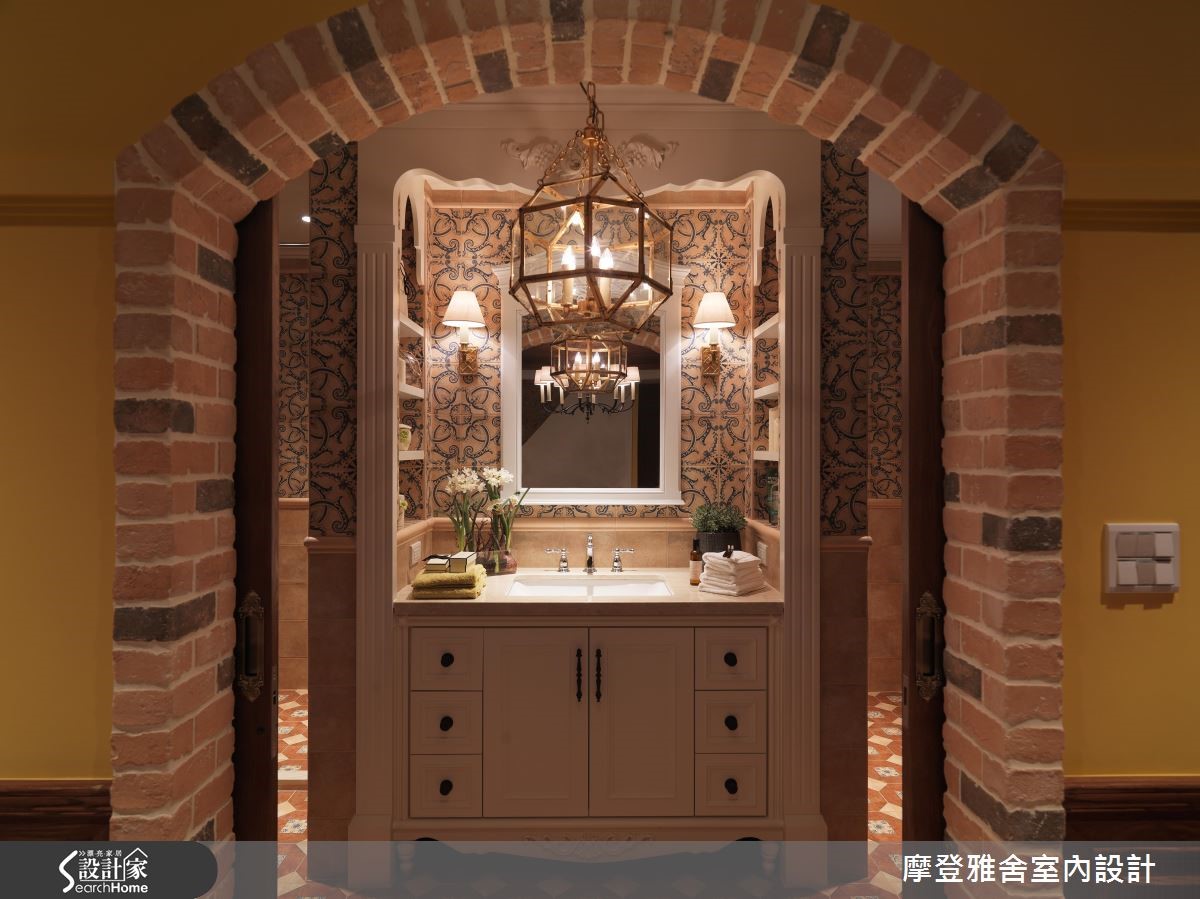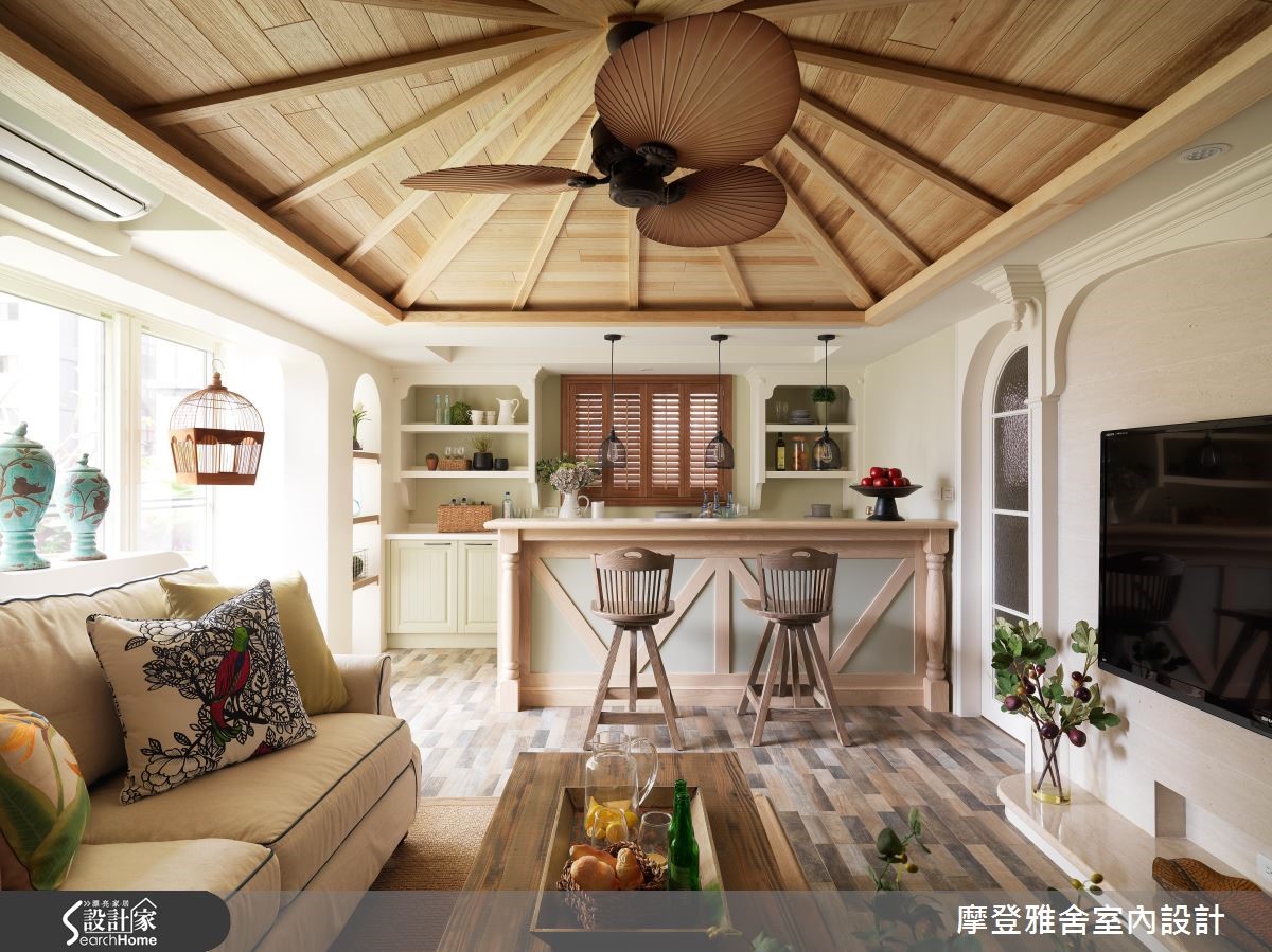 198平方米的复式楼,是喜欢旅行、热爱艺术的男主人新居,设计师将不同国情的乡村风融会贯通,把多种元素挹注于空间内,让生活即像度假,一次满足屋主环遊世界的异国梦,快跟着小编一起走进来看看吧! 【木纹与艺术色彩,谱出生活质感】客厅陈设南法情怀软件家具,电视墙引用温润铨木皮、搭上可可色仿壁炉与刷色文化石,演绎西班牙的温暖情调;沙发后方开设室内窗,让书房、厅区衍生连结;餐厅以斜屋顶天花,打开一旁别具风格的木作门片,就能看见美丽的洗手台。【美感与机能兼具,创造交流天地】厨房旁巧妙将冰箱隐于柜体内,一旁楼梯底部更善用空间作足收纳,把机能隐于无形;二楼呈现出峇里岛的度假风格,採仿洞石瓷砖铺贴电视墙,并透过圆弧收边缓和锐角,配置吧檯与阳台,让起居地成为三五好友相聚的绝佳场域。【东西文化相融,处处是浪漫风景】楼梯,是空间的过度地段,将每一踏阶都贴上不同款式的瓷砖,映衬着墙面聚焦的壁画,让梯间洋溢着希腊情怀!主卧用线条搭配浪漫纱帘,带出东方风格的氛围,床头则利用柱体深度作出三座拱门,以设计巧妙化解空间缺陷!