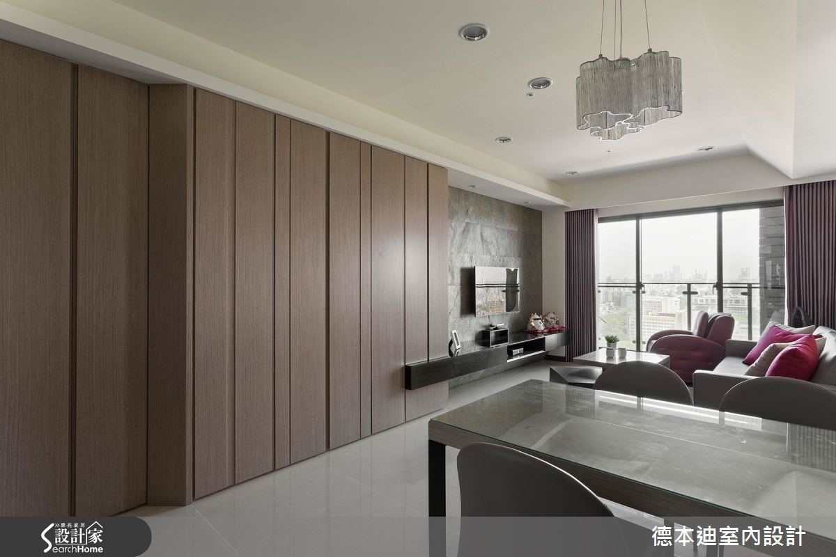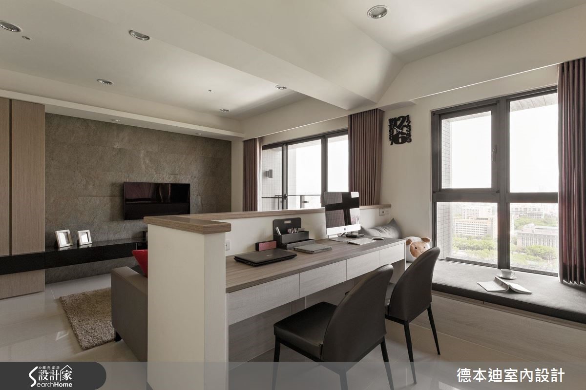 76平方米的空间,设计师考虑小家庭的人数简单,于是将原有3室重新拆解,改造成实用的开放式书房,并融入更多的收纳与更衣机能,让格局分布符合使用者所需,搭配现代风的清新演绎,满足一家三口的居家梦。【收纳不外露,营造清爽居家】设计师以深色大理石铺陈玄关地坪,与客厅形成自然的区域界定,同时规划木质柜面,运用立体的垂直线条,虚化柜体的深度落差,并与石材电视墙完整串接,塑造自然俐落的立面表情;天花则透过斜面设计增添变化性,柔化原有的压迫感受。客厅后方以矮墙区划出客厅与书房,展现更为广阔的开放尺度,除了大面积书柜,更在靠窗处作出飘窗,于底部暗藏储物空间,落实清爽收纳;卧室内则将既有卫浴变更为更衣室,扩大整体使用范围,而小孩房亦在床底下增设置物抽屉,充分利用空间。