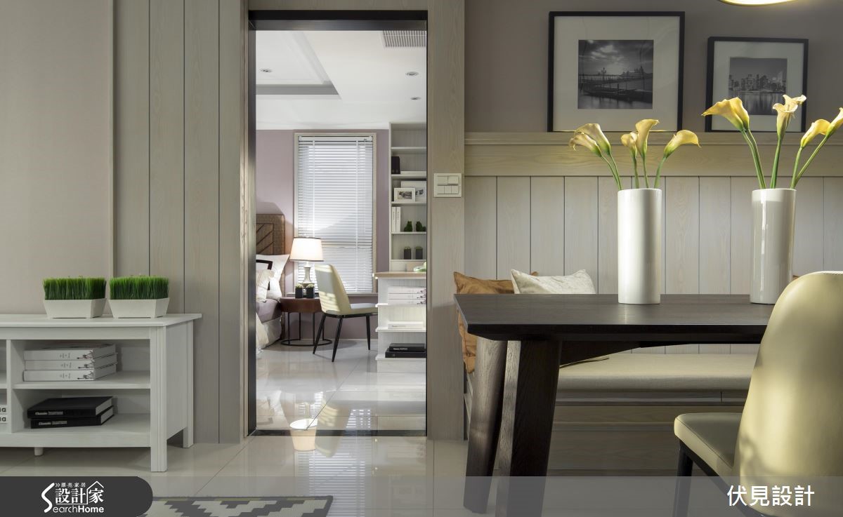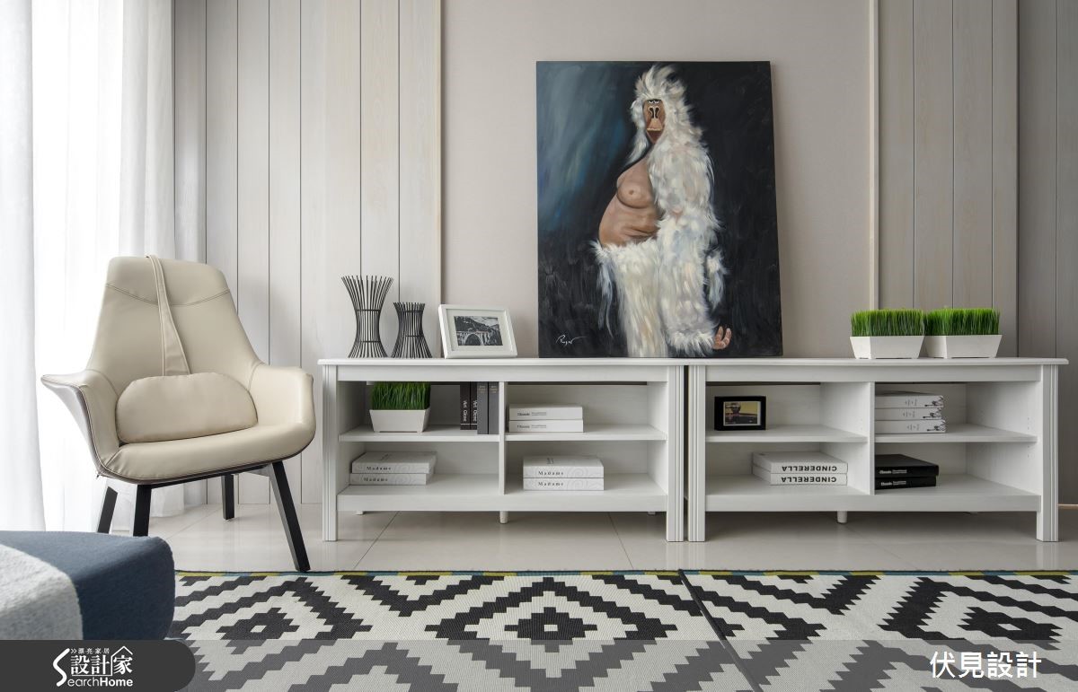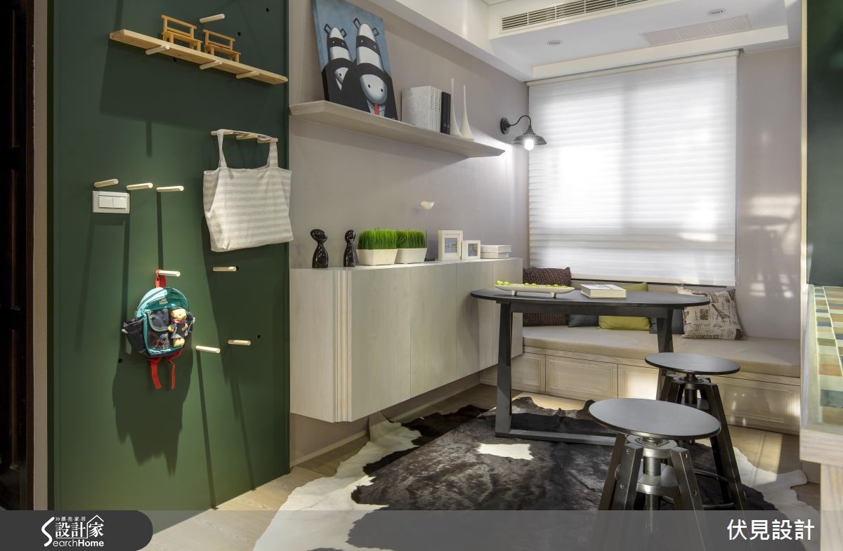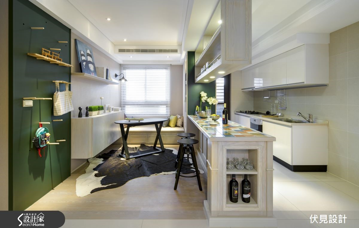 不同于一般美式风格成熟、浓重的印象。由于屋主偏好清新质感,因此设计团队改以缤纷、活泼的色彩与充满童趣的单品配件,为居家空间营造截然不同的美式风格。【黑白空间点缀七彩吧台更吸睛】将明亮的窗边位置保留给客厅,并设置飘窗,依序将长型公共区域切分,依据生活习性排列客厅、餐厅、休憩区域及厨房。针对风格营造,设计师颠覆美式风格的既定印象,采用明亮的家饰与家具,搭配简约的线板与色调清爽的壁板,营造活泼的美式空间。餐厅更利用飘窗混搭一般座椅,增加了宛如咖啡厅的休閒感。利用缤纷的复古砖吧台成为厨房与书房的区隔,接着以木棒与洞板打造一面富有创意的收纳墙面。进入隐身於壁板后方的主臥入口,温柔的粉色调与飘窗注入,营造优雅的美式感受。