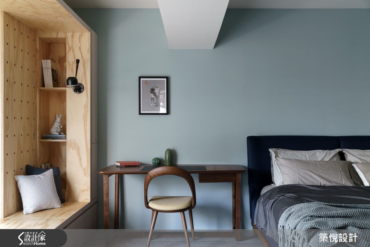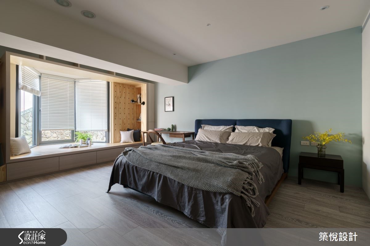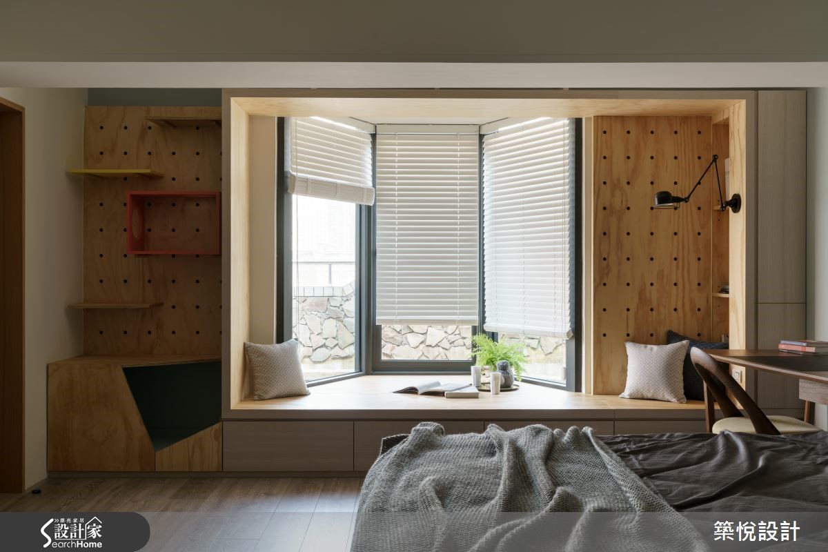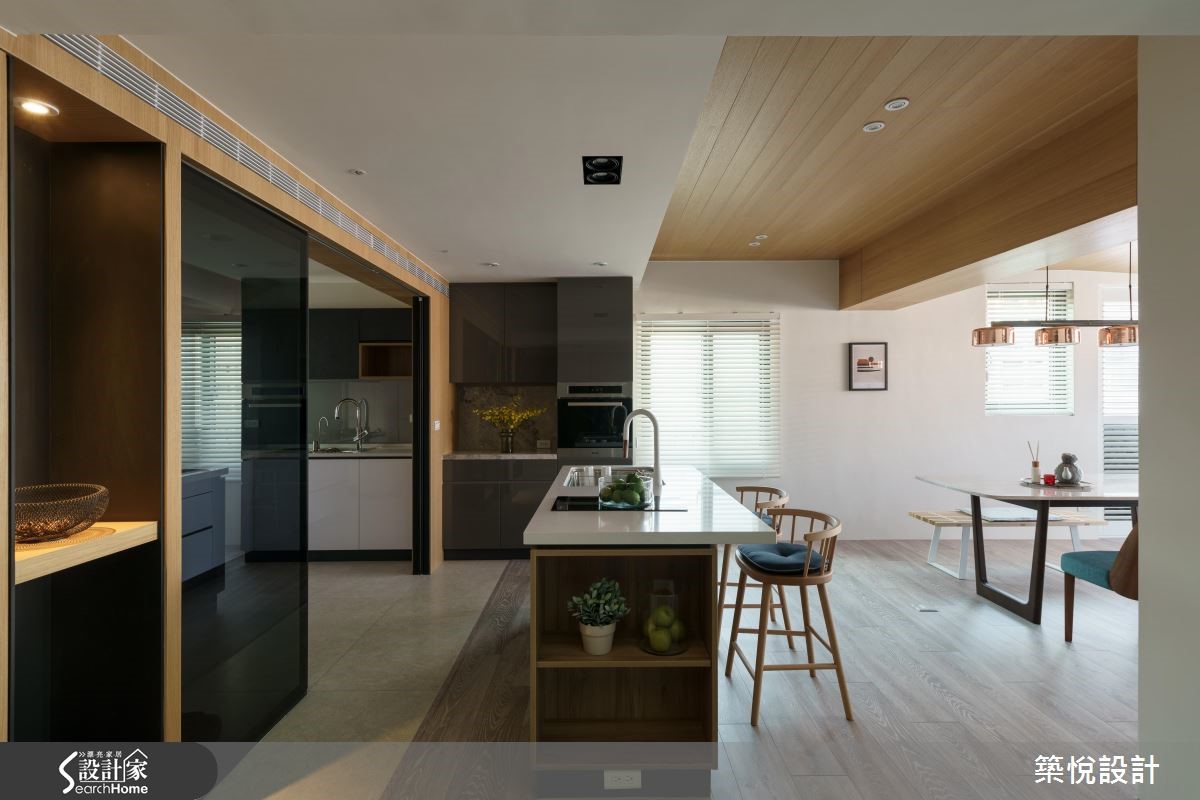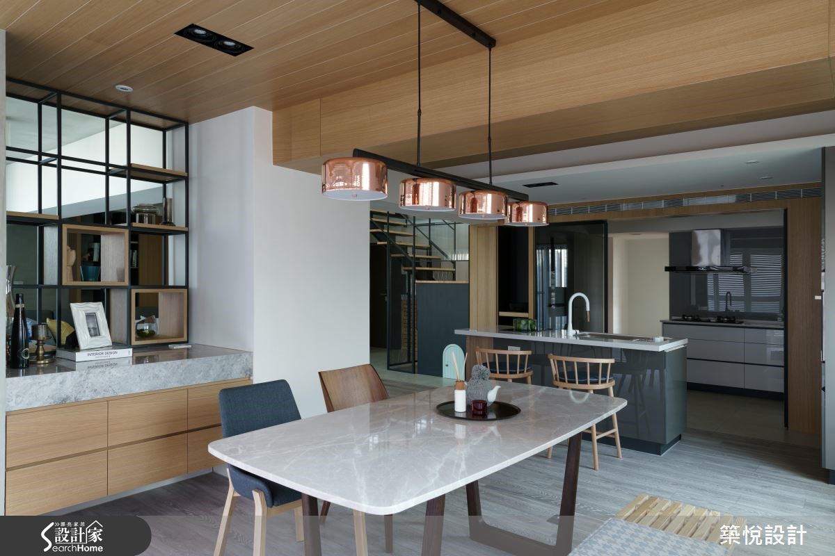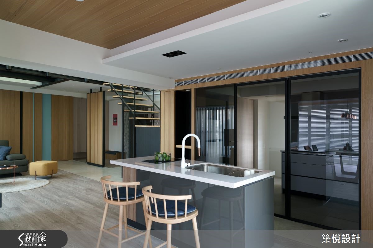165平米的复式楼老房子,原本格局略嫌封闭,无法展现原有的采光优势,经过设计师翻新改造后,利用天井设计为一楼的公领域引注光线,瞬间变得明亮又宽敞,也让新婚夫妻省去了考虑换屋的烦恼。 【旋转电视墙,双向使用更弹性】设计师以屋主喜爱的工业风为基底,运用木质、铁件等材质,型塑出利落感,并局部加入亮黄、土耳其蓝等软件,营造鲜明的色彩对比。客厅与餐厨区采开放式,可旋转的电视墙则灵活地串连两个空间,无论是平时休闲娱乐或是在吧台用餐时,皆可旋转至适合的观看角度。【去除隔断,让室内明亮通透】拆除封闭的隔断后,餐厅处变的相当明亮,厨房与吧台间铺饰不同的地坪,并加设黑玻拉门,明确划分料理与用餐的分野。进入宽敞的卧室区,床头背墙绘上温和的浅灰蓝,设计师也善用八角窗的优势,延伸出飘窗区以及几何展示收纳,打造适合休憩的舒适小角落。