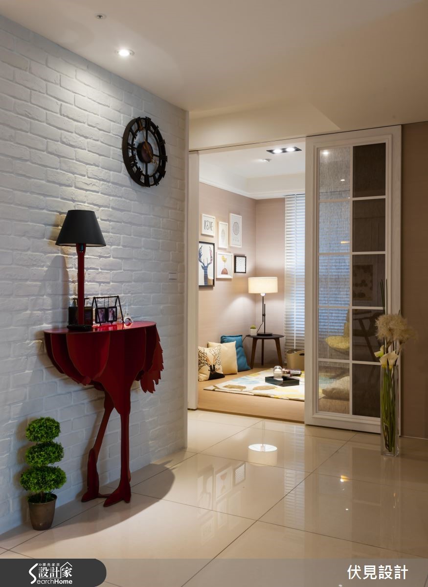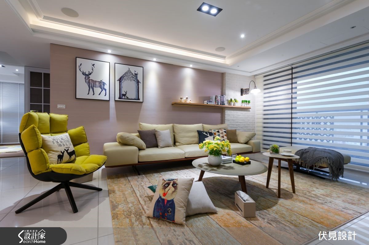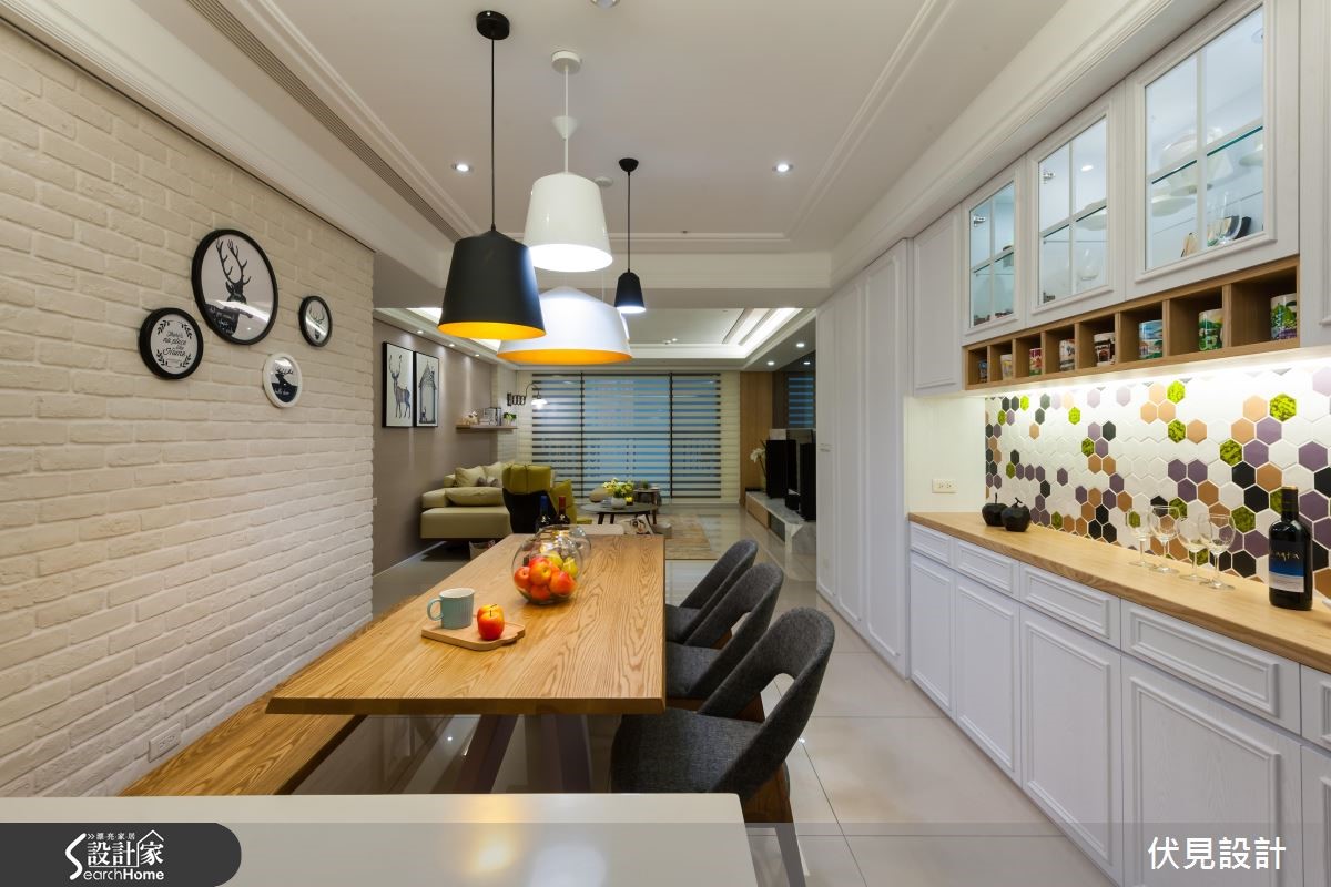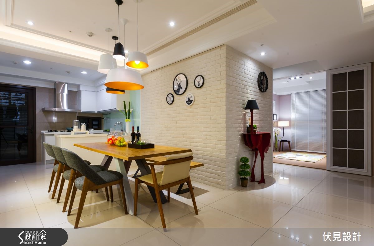 在这户新婚宅中,设计师运用文化石、墙纸等材质,并加入舒适性、实用性并存的家具,以及充满童趣感的家饰等。将美式元素、北欧风格相互交融,混搭出独特的空间设计。【电视墙不做满,扩容视觉】设计师在客厅以轻浅的调性,搭配带有童话感的挂画,表达轻松无压的感受。并配置浅灰纹理的大理石电视墙,上方刻意不做满、以深色玻璃维持延伸感,让视线可穿透至书房展示书柜,达到扩大视觉的效果。餐厅墙面运用文化石,不仅与餐柜的彩色六角砖产生对话,更成为公共领域步入臥室之间的衔接。起居室内以浅色墙纸搭配北欧风家具,主臥、次臥个別坐拥著不同的主题色彩,以画作带入驯鹿图腾,妆点出丰富的画面。