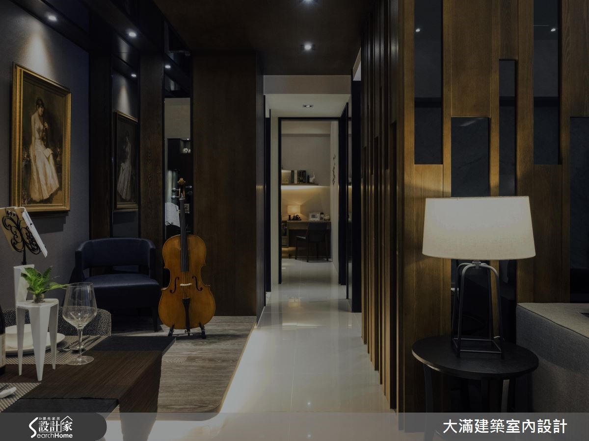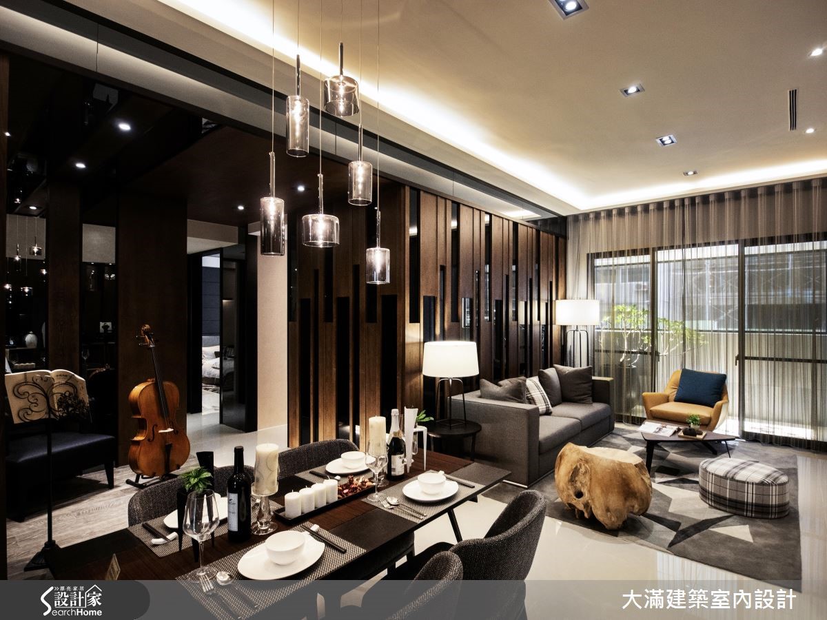 116平方米的现代风居宅,除了3室2厅的格局配置,也藉由开放式的练琴区作为公私领域的间接区分,客厅沙发背墙加入黑色烤玻材质,打造有如高低跃动的琴键概念,完美融合年轻夫妻对于音乐和艺术的热爱,营造优雅文艺的居家氛围。【开放式琴房,视觉通透更显宽敞】以音乐和艺术为主题的居住空间,设计师利用浓郁深邃的木、石色调,调制出优雅的色彩质感;公共领域结合客厅和餐厨功能,沙发背墙结合黑色烤玻材质穿插错落,彷若正在进行演奏中的跳跃琴键,为空间增添活泼的动态感。餐桌旁特意将地坪架高,作为开放式的演奏琴房和艺术画作展示区,也使廊道空间看起来更加宽敞。而卧室则延续公共区域的沉稳木质色调,并规划充沛的衣物和展示收纳空间,搭配柔和的灯光设计,营造出低调优雅的舒眠感受。