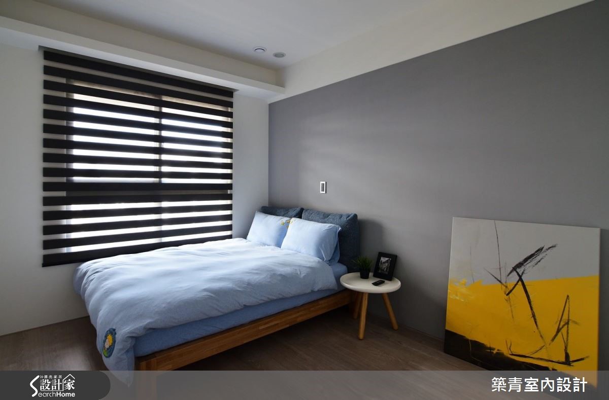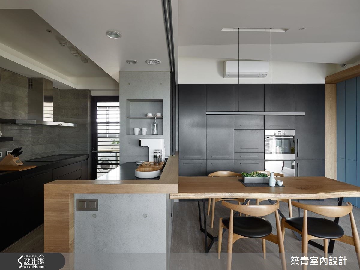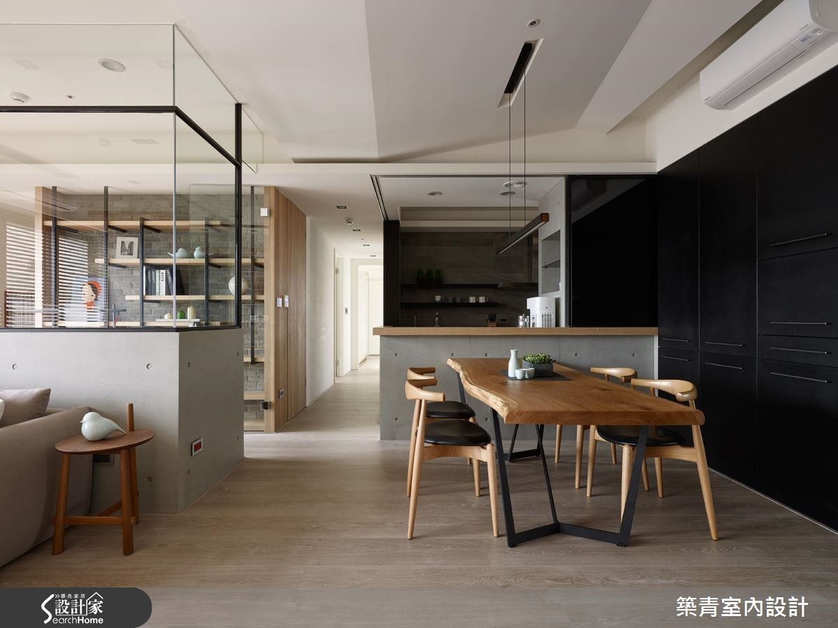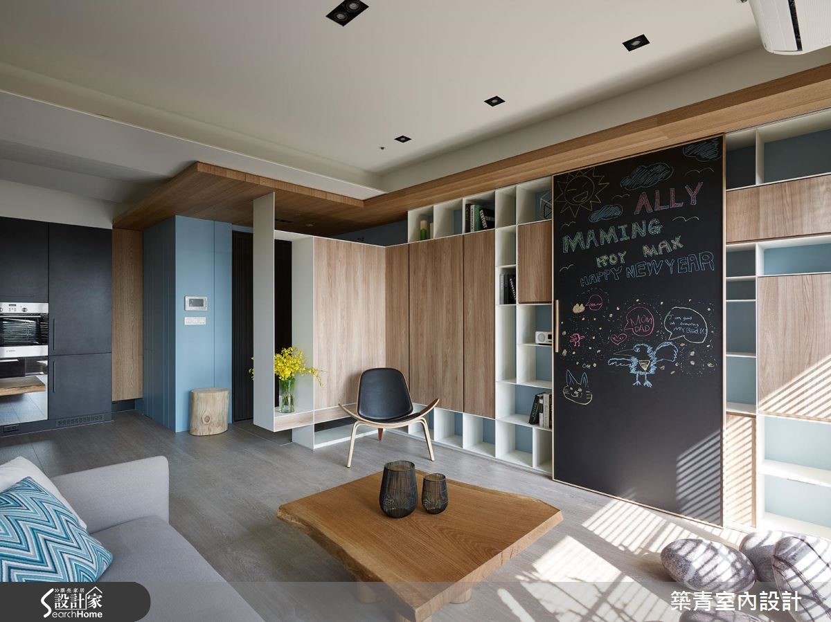 设计师以"回到空间原有的使用本质"作为发想起点,透过Living room的设计手法,结合清新自然的现代风,在空间中体现情感交流的意义,勾勒出充满情感的居家轮廓。 【弹性应用和半穿透,让家更舒适】将客厅重置回原本机能,舍弃电视、音响等设备,改以书墙、黑板墙取代,成为生活互动的核心空间。同时敲除一半的书房隔断,以清玻璃重新建构,瞬间延展了视野及自然光的通透。原先封闭的厨房经由改建变成弹性开放地带;隔断开敞时,可多出一处轻食吧台,使公领域更完整开放;若完全紧闭则可隔绝油烟。深色玻璃不会影响视线的交流,也让"家庭关系"的设计主旨能充分凸显。