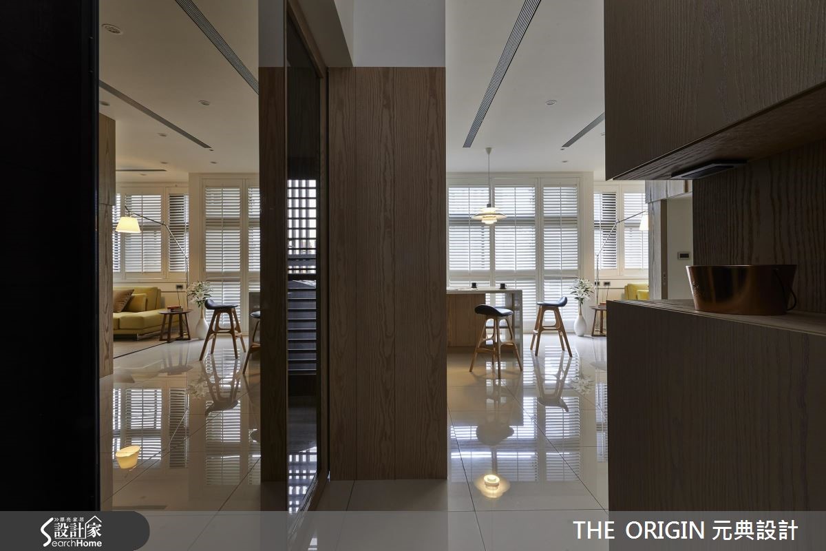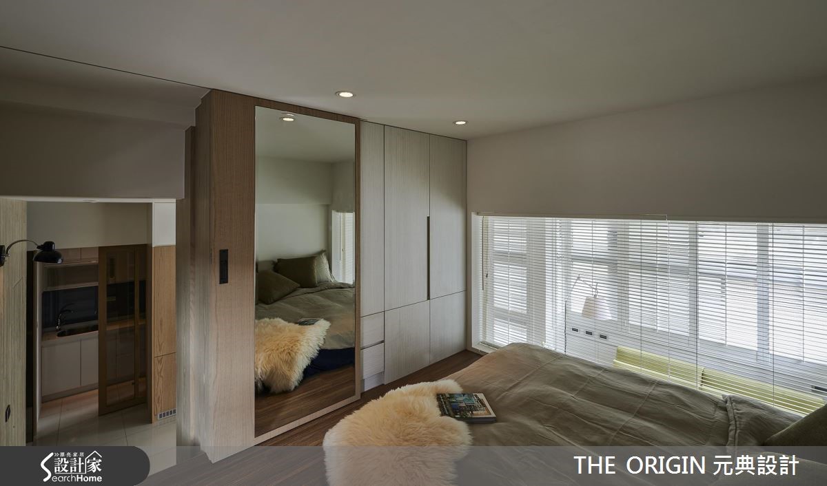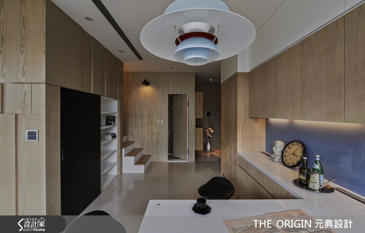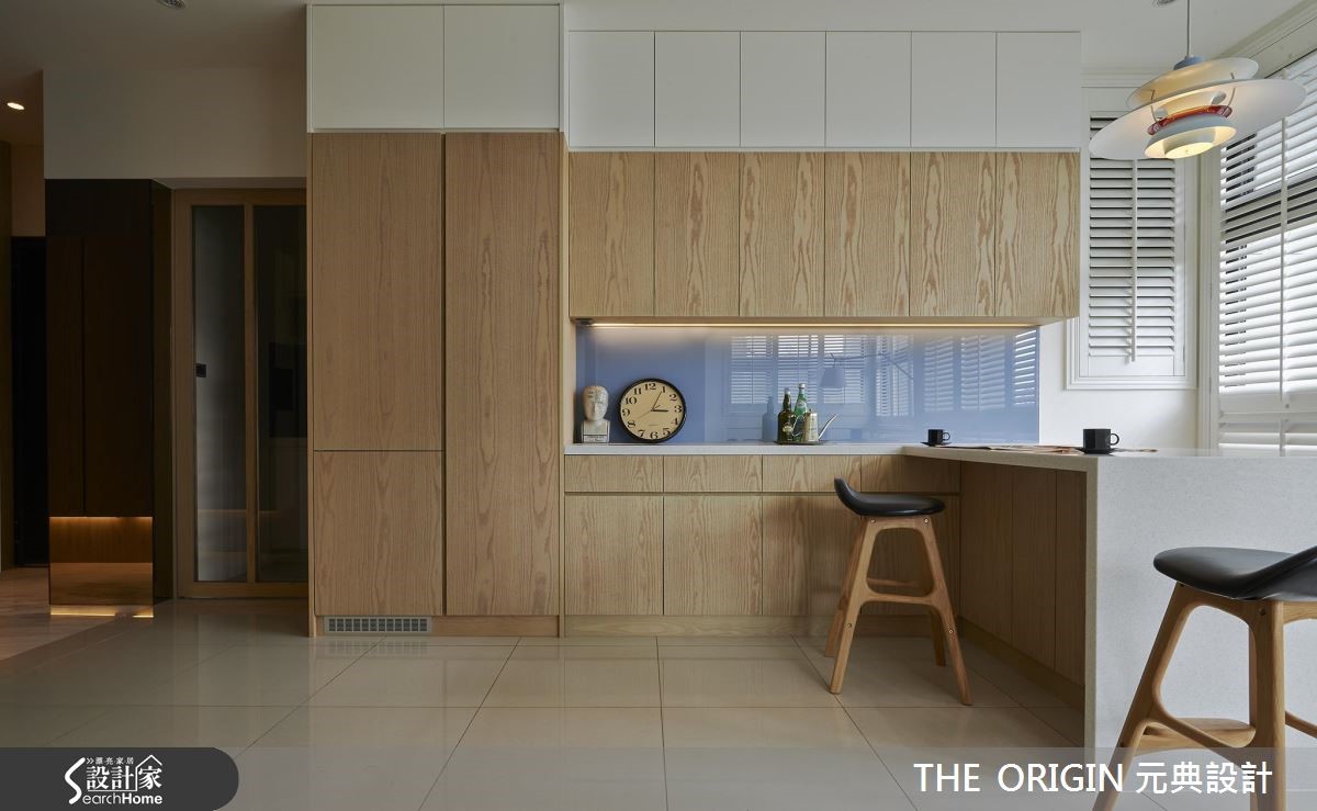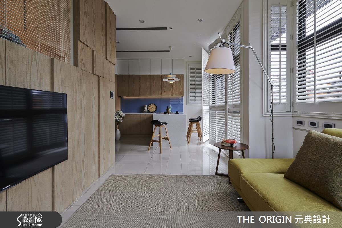 66平方米的小户型,设计师善用屋高与复合式设计,将隔断数降低,以维持宽敞通透的开放空间与生活机能,并注入温馨的北欧风格,为小夫妻打造甜蜜的新婚宅。【清爽用色,创造轻盈空间感】由于使用空间有限,设计师以玄关一路延伸至餐厅的大面积柜体作为主要收纳,并结合吧台取代餐桌,大幅提升整体的使用弹性;此外,善用采光优势,以纯白木百叶调节日光,搭配大量木质与色调清爽的家具,满足夫妻对于北欧居家的期许,也放大空间视觉感。设计师善用屋高条件将私领域区块独立,不只降低过度切割的可能性,更利用隔断墙面作为客厅电视墙,以富有层次的几何凹凸造型壁面,为空间增添有型设计;而私领域则划分为上下两层,并以玻璃隔断引入充沛日光,打造出兼具收纳与宽敞的休憩空间。