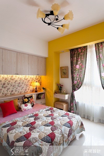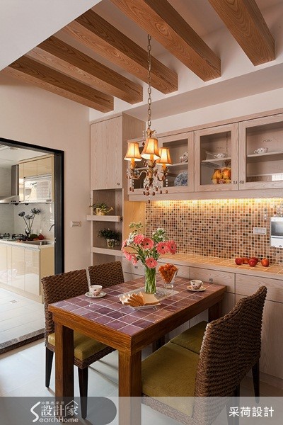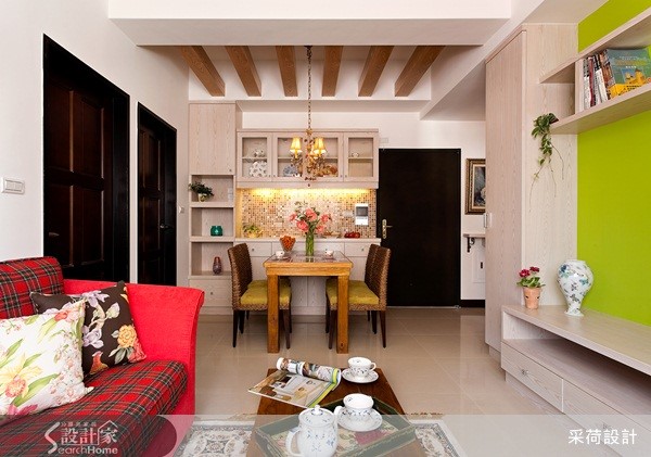 在59平方米的微型宅居里,透过浅色木作铺陈,酝酿温暖情谊,且利用局部跳色的壁面增添视觉活泼度,烘托明亮度与拉阔空间感,同时透过装修手法来加强收纳机能,成为空间的重点设计。【化畸零角落为收纳空间】面临空间梁柱多的结构问题,设计师发挥创新思维,在客厅临窗处利用柱体的深度,规划休憩阅读区,且利用大梁界定出客餐厅领域。此外,更利用凸出的畸零角落,纳入各式收纳机能,像是电视柜、餐柜、展示柜与床头柜等,加强微型空间的机能运用,美感与机能兼备。公领域里更可欣赏丰富多元的定制家具与进口饰布,餐瓷、家饰的搭配皆呼应美式风格的内在文化;餐桌以进口釉面砖和花砖铺陈,以华美精致的特色提升质感,增添些许乡村风情,天花板垂挂一盏小巧吊灯,展现华丽的时尚风情。而原本规划的一间小孩房,由于小婴儿年纪还小,因此暂时转为书房使用,不大动格局,有效保留空间的使用弹性,便於日後更动。空间内藉由粉嫩花卉墙纸的铺陈,创造出浪漫雅致的唯美氛围。