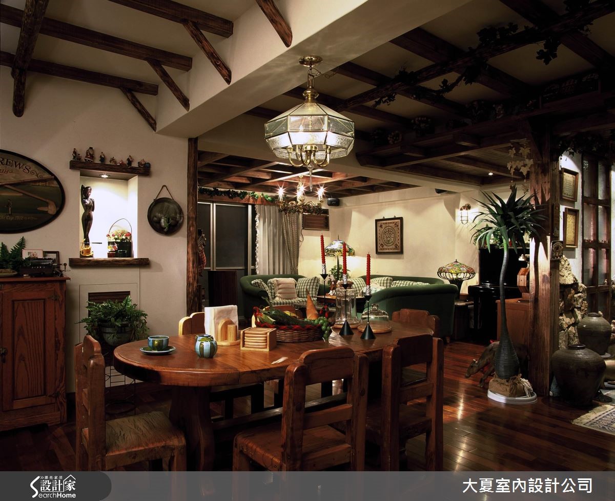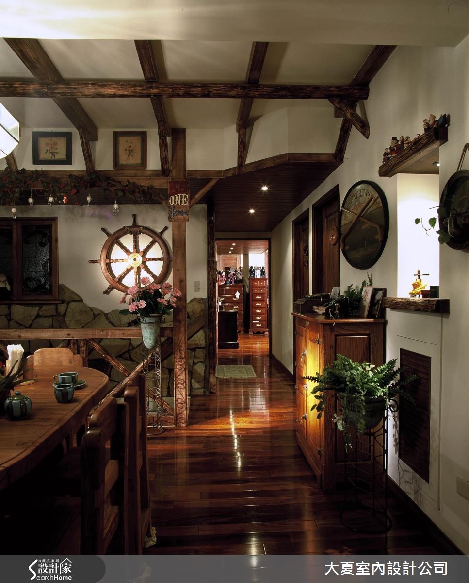 家,因为有了人、生活的点滴片段,交织出充满温度的空间。让走过人生时光的展示品妆点室内,阅读这些蕴含故事的吉光片羽,将这些生命里淬炼而成的丰盛灵感,以乡村风格为外衣,化作家的真实样貌。【大量木质铺陈,营造温暖气息】仿佛来到北欧乡村里的童话木屋,以原木质感诠释经年累月的独特味道,琳琅满目的家具配饰营造出圣诞节的热闹情境。客厅天花板以木格栅交织而成,点点光源穿梭其中,电视墙以粗犷肌理的唭哩岸石围塑。呈现壁炉造型的电视墙,以摆饰与艺术品搭配,升华空间的温度。顺着天花板大梁的结构,围出餐厅空间,原木质感的餐桌椅摆设,酝酿温馨的用餐氛围,阶梯旁的墙壁上,还挂着的木制船舵,后方墙面甚至以绿植与艺术摆饰,营造出人文美学。