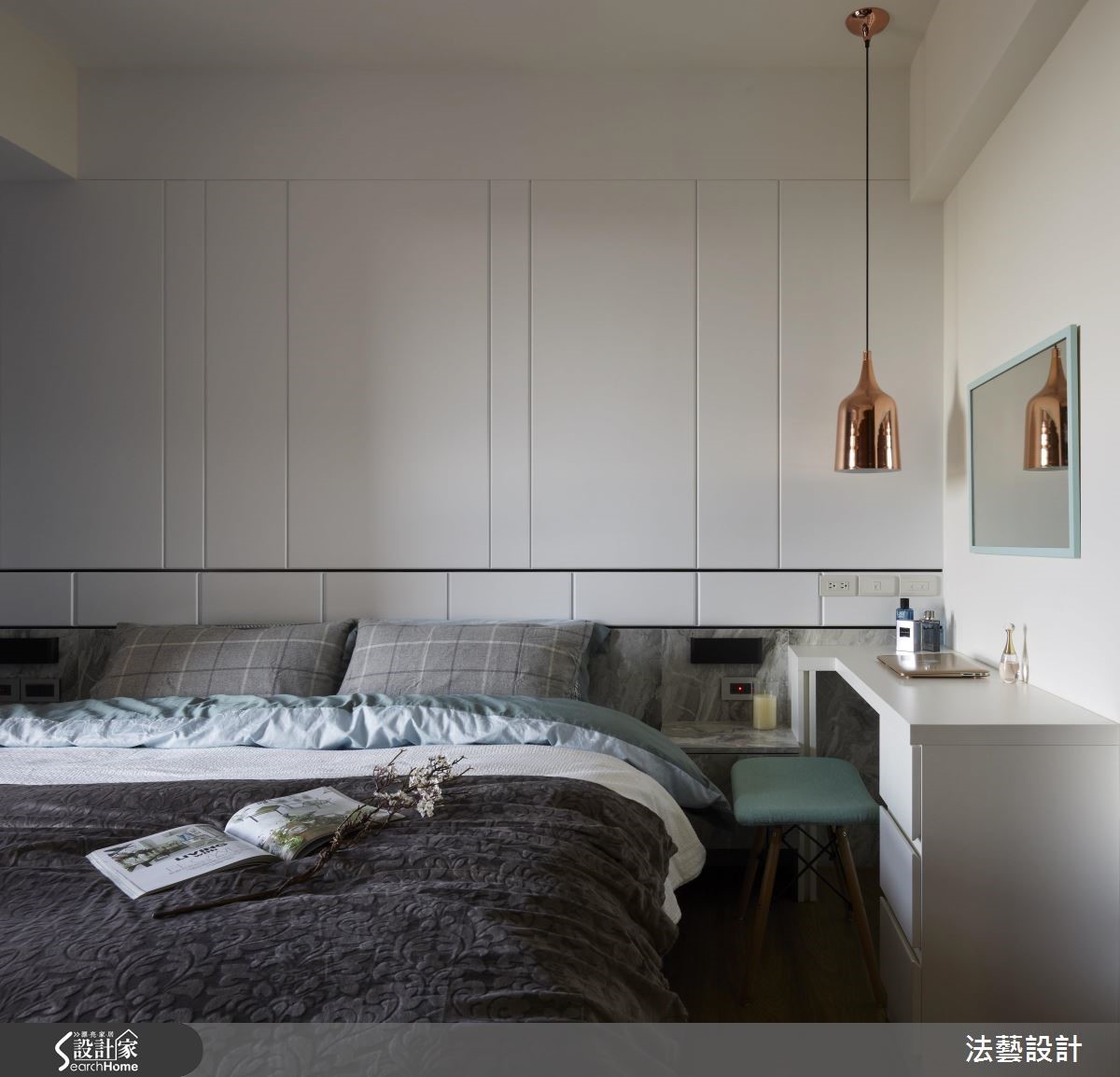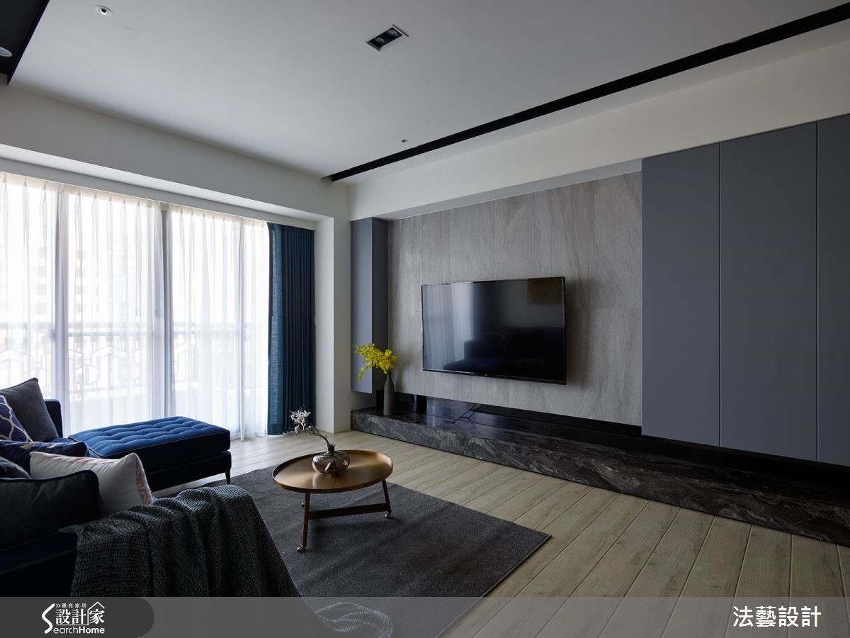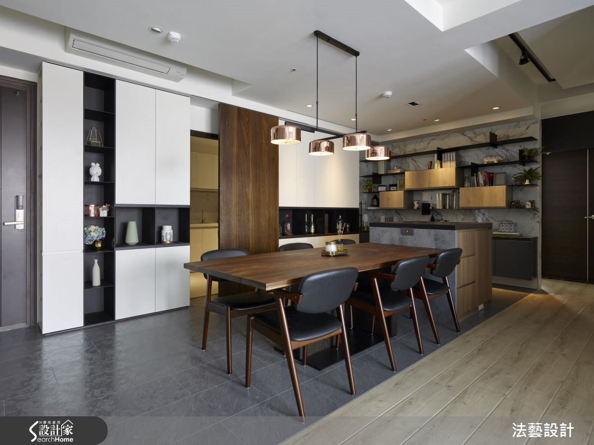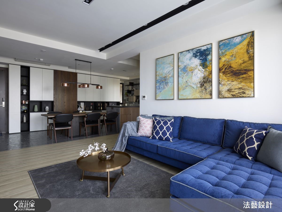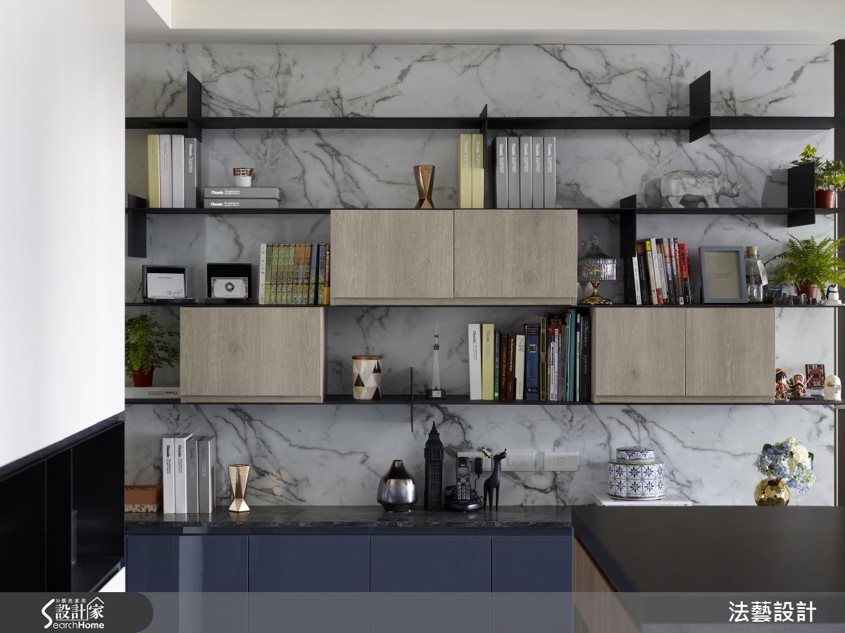 93平的新居是小夫妻的生活起点,设计师考虑屋主喜爱现代风格,于是赋予开阔的空间感,并挹注舒适典雅的整体用色。再依循夫妻二人各自的心愿,配置中岛与实木餐桌,以及结合展示和收纳机能的书墙,带来设计感、机能性的双重满足,快跟着小编一起来看看吧!【石材点缀黄铜,更显轻奢质感】为了扩容,设计师让公共空间呈开放式设定,藉由地砖、木地板区分餐厅与客厅范围,促进采光流动性。同时让色彩由深入浅,客厅选用蓝色沙发定调唯美气质,餐厅则在自然素材的铺陈下,导引温暖生活气息。餐厅区作为空间的活动中心,除了平日用餐,亦可当作亲朋好友的聚会场所。透过中岛连接实木餐桌,并于墙面规划餐柜兼书柜设计,采用木皮、石材、黄铜搭配,衬托摆放的艺品及书籍,展示着居者的不凡品味。卧室电视墙以简约的木皮铺陈,中间加入大理石材,塑造沉稳不失温暖的视觉场景。床头则给予细致的线条刻划、型塑利落视感,再搭配一旁的金属吊灯,营造出画龙点睛的聚焦效果。