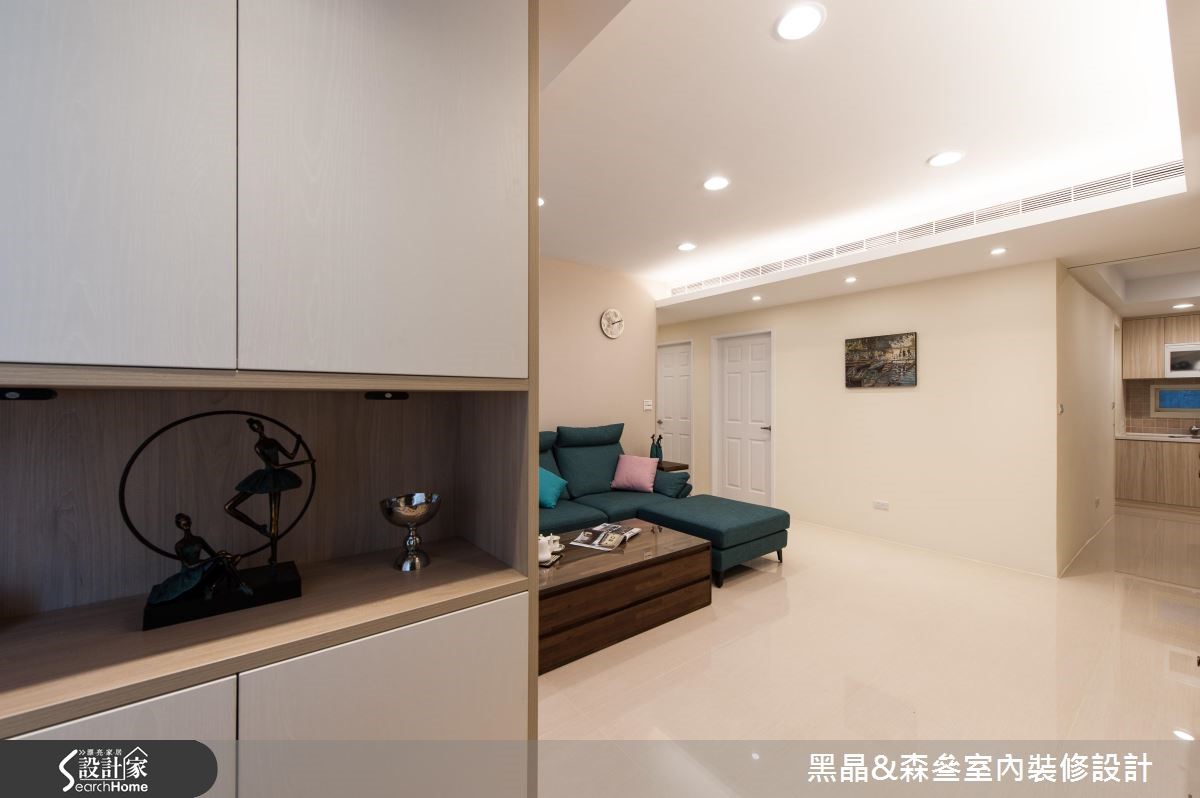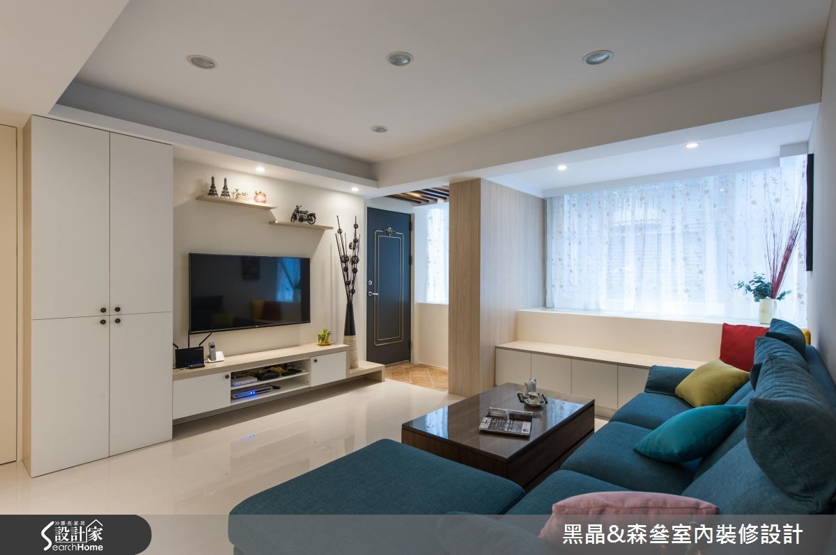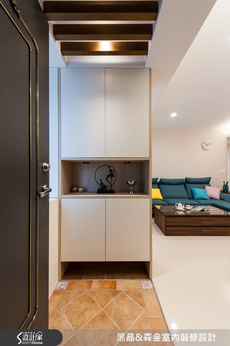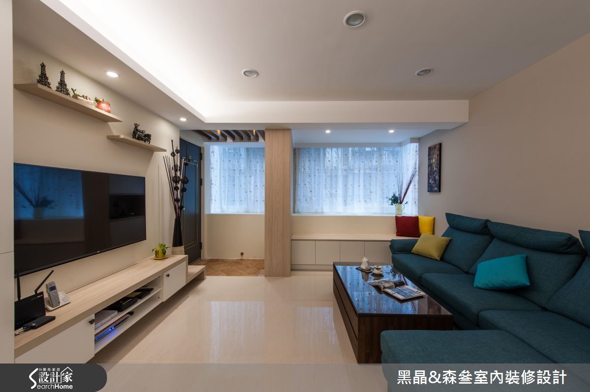 83平方米的居宅,设计师以干净、无过度装修的手法铺叙室内,随着内嵌光源的洒落,晕染一片柔美视线,搭配跳色摆件的妆点,为公共领域增添活泼气息。【跳色家具,抓住空间视觉重点】进入室内,天花板以木作栅格搭配复古地砖,并藉由入口处的鞋柜划分出玄关,替访客或家人创造缓冲的落尘空间,同时展现视觉变化的惊喜。后方则沿着窗边打造飘窗区,不仅替家居营造休闲功能,也让日光能洒落室内。电视墙以简约壁面铺陈,周围结合展示与收纳机能,藉由自然清新的色调,凸显蓝绿色沙发的视觉重点;而客厅与厨房间以铁件与玻璃拉门界定,透视的材质特色让领域自然串连,并以木质纹理的厨具,营造舒适暖心的烹饪空间。