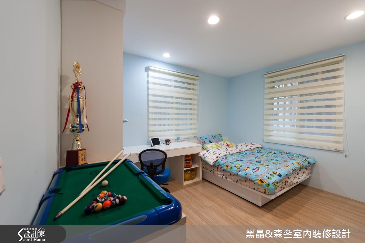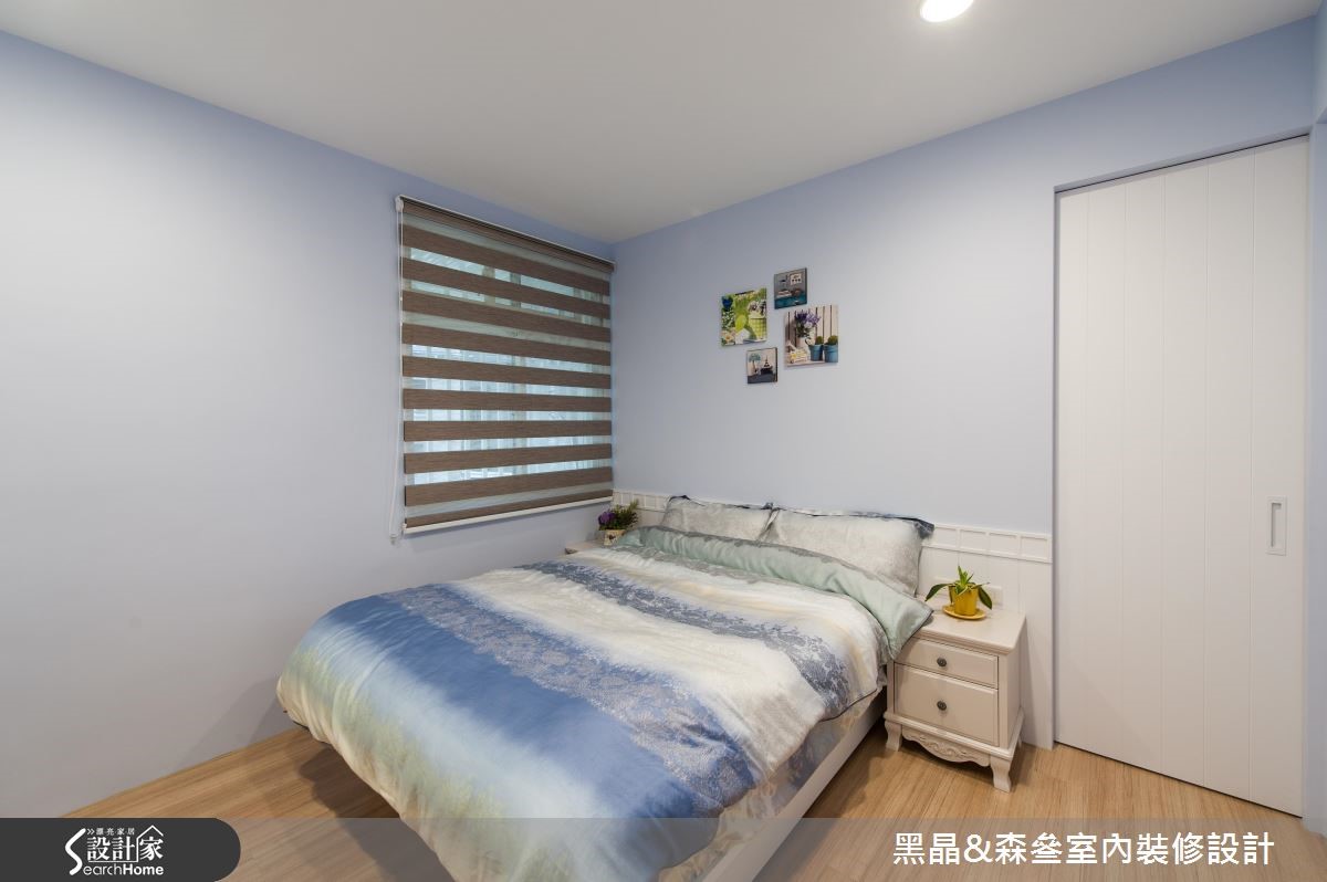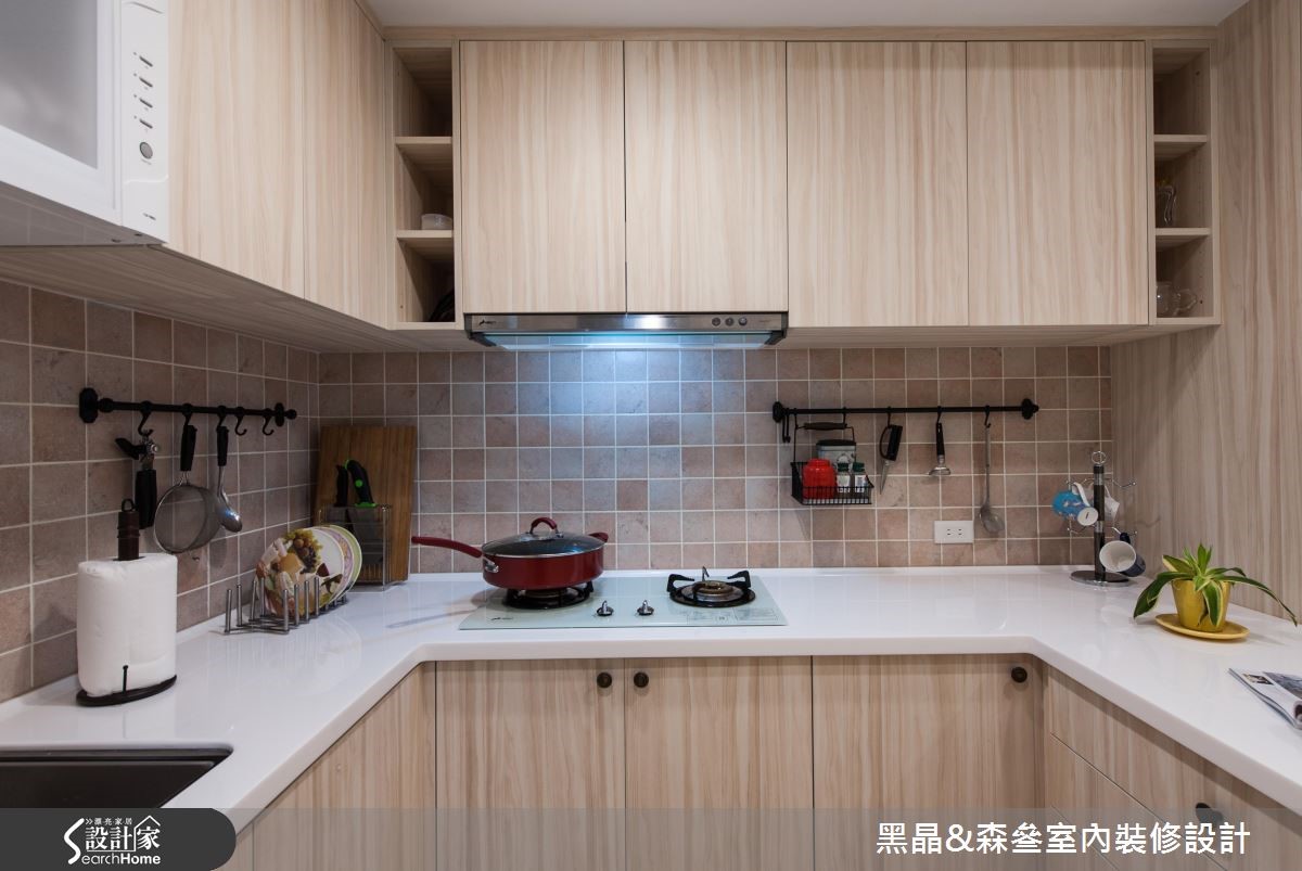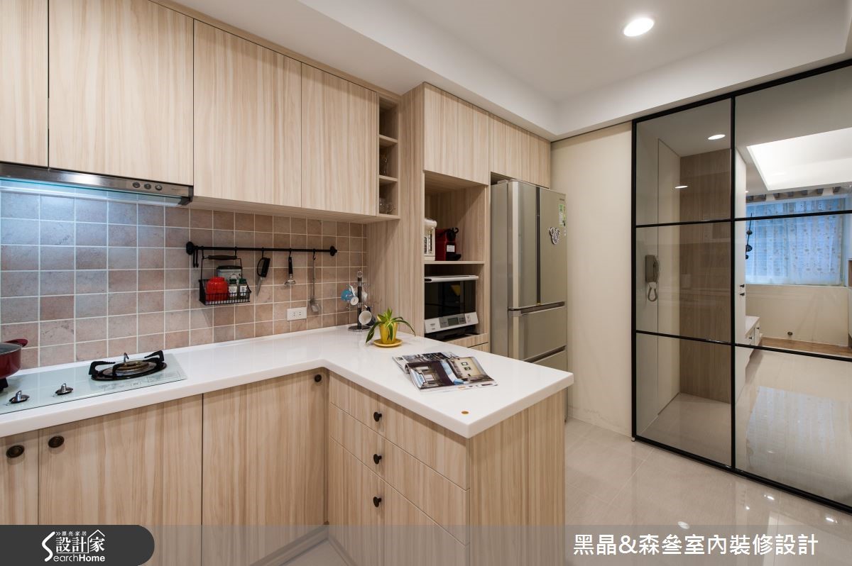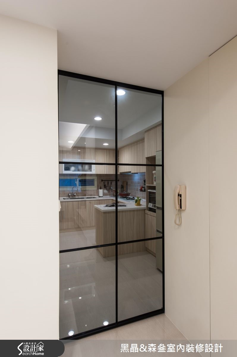 83平方米的居宅,设计师以干净、无过度装修的手法铺叙室内,随着内嵌光源的洒落,晕染一片柔美视线,搭配跳色摆件的妆点,为公共领域增添活泼气息。【跳色家具,抓住空间视觉重点】进入室内,天花板以木作栅格搭配复古地砖,并藉由入口处的鞋柜划分出玄关,替访客或家人创造缓冲的落尘空间,同时展现视觉变化的惊喜。后方则沿着窗边打造飘窗区,不仅替家居营造休闲功能,也让日光能洒落室内。电视墙以简约壁面铺陈,周围结合展示与收纳机能,藉由自然清新的色调,凸显蓝绿色沙发的视觉重点;而客厅与厨房间以铁件与玻璃拉门界定,透视的材质特色让领域自然串连,并以木质纹理的厨具,营造舒适暖心的烹饪空间。