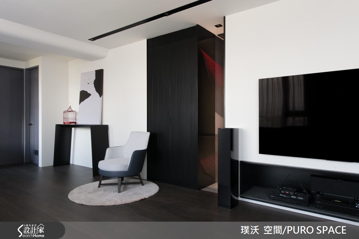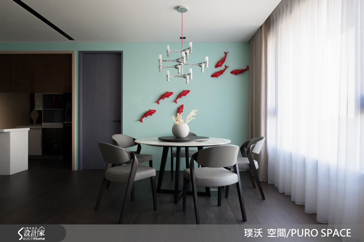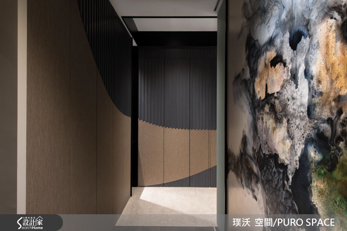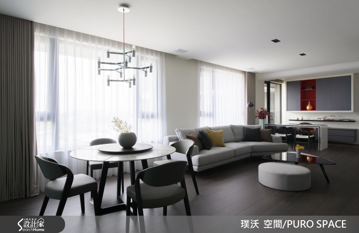 舞蹈家的165平米居宅,一如屋主背景般带着鲜明而独特的风格;设计师为改善采光问题,将既有的闲置房间打开,呈现完整向光面,化解空间阴暗的问题,再以现代风格作为基底,搭配中式元素点缀,型塑纯净优雅的格调,让家有如光与艺术的动静剧场!【以泼墨山水画与壁布展现古典美】玄关处于墙面加入整幅壁画,挥洒出泼墨山水的迷蒙意境,搭衬质感壁布与利落的线条色块,展现古韵及现代的交融,而循序渐进的弯折动线,更有如庭院回廊般,给人跨山越水后、柳暗花明的惊艳感受。【开放式设计打造舒适公共空间】公共空间内将客厅、餐厅与开放书房完整连贯,接收整排窗户的采光,倾注明亮舒适感,同时藉由简约的现代家具、体现灰色的知性优雅,搭配亮蓝、金色和正红色的局部妆点,以及带有中式美感的植栽、摆件等,调和出不失韵味,令人倍感舒适的生活场景。
