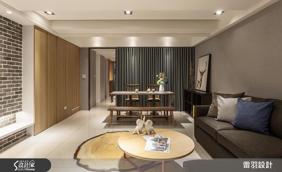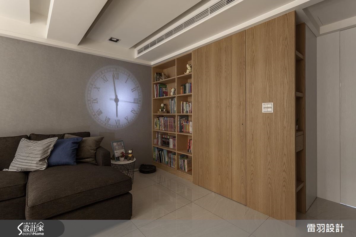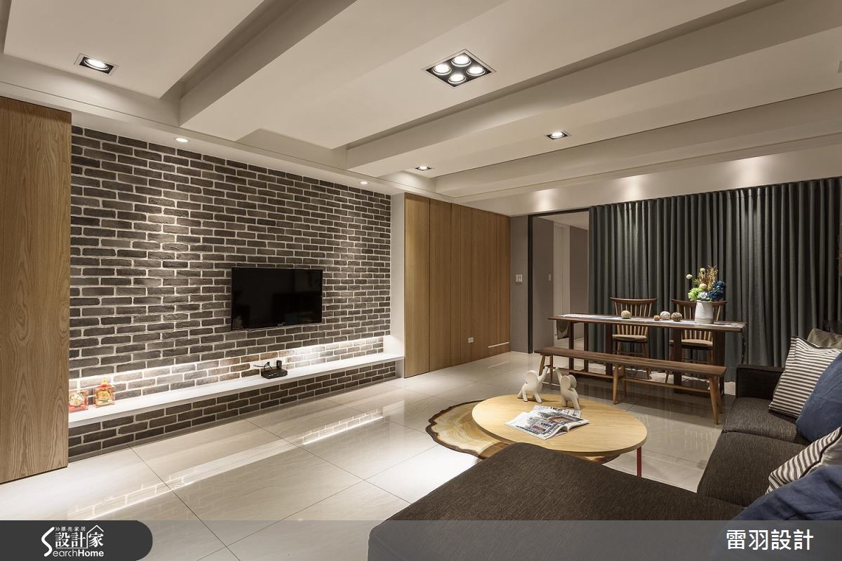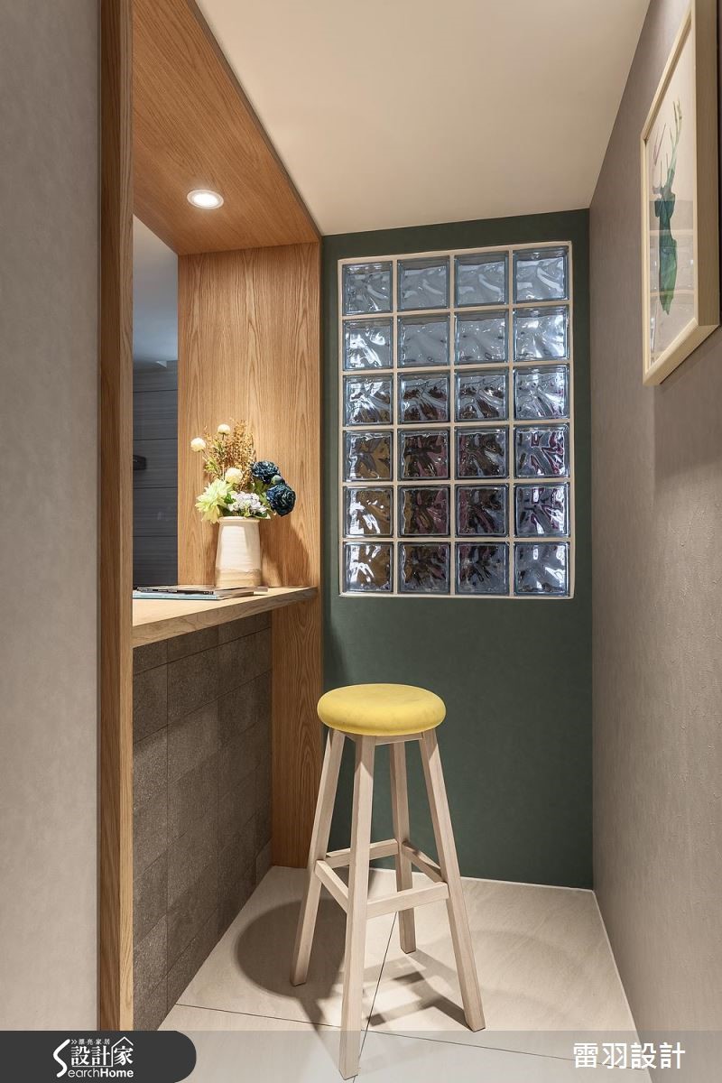 屋主为了给老婆一间新颖厨房,以及赋予孩子更多收纳书籍的地方,决心找来设计师进行居家翻修。除了改善狭长屋型导致的采光阴暗问题,更变动卧房及卫浴配置,甚至增设一处居家小吧台,使空间更能贴近一家人生活所需。 【天花高低错落,拓宽屋高视野】公共空间中设计师藉由灰阶、搭配开放留白的视野,营造和谐气氛。由于本身的屋高较低,在天花做出高低错落,达到弱化横梁存在的效果,使空间显得挑高且富有层次。电视墙则在深色石材的铺陈下,表现质朴及稳重。两侧衔接木皮柜体,妆点出舒适自然的主视觉画面,并打造一座大容量书柜,巧妙以投射灯时钟取代一般挂钟,无处不在激发着孩子的脑力创意。厨房也是改造的重点之一,利用玻璃砖将后阳台采光引至前方,再特别规划一座开放吧台,除了替廊道增添明亮外,更让女主人做菜时可随时与家人互动交流,开启更多的生活乐趣。