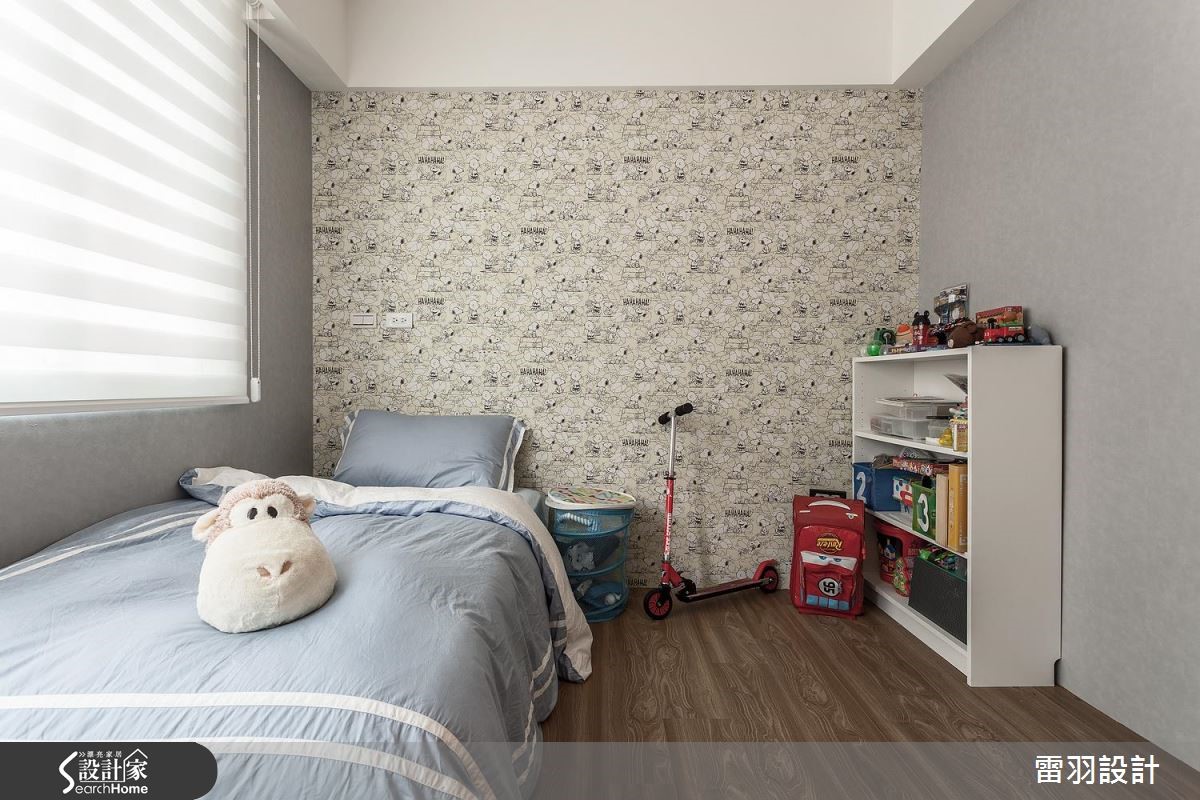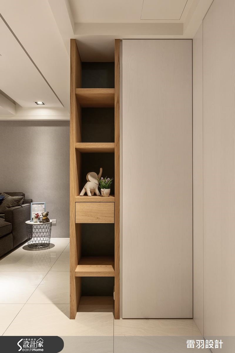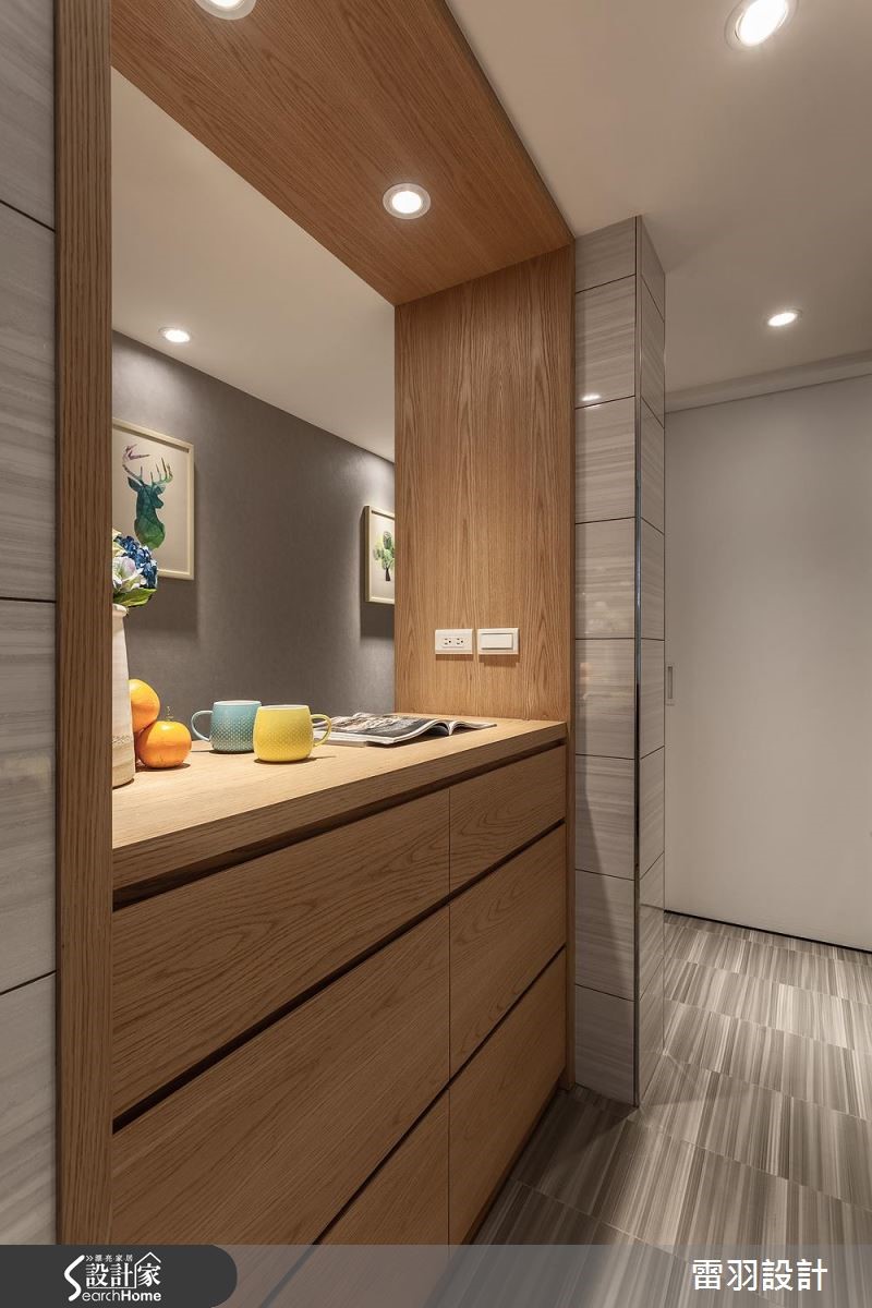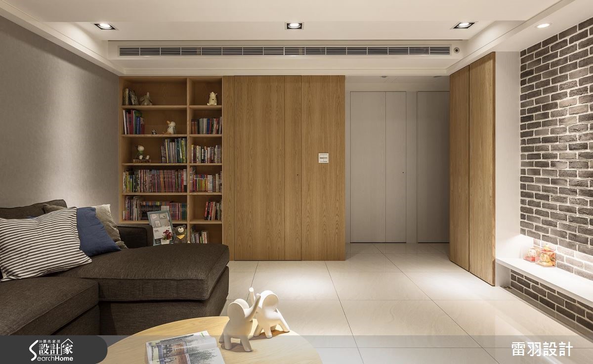 屋主为了给老婆一间新颖厨房,以及赋予孩子更多收纳书籍的地方,决心找来设计师进行居家翻修。除了改善狭长屋型导致的采光阴暗问题,更变动卧房及卫浴配置,甚至增设一处居家小吧台,使空间更能贴近一家人生活所需。 【天花高低错落,拓宽屋高视野】公共空间中设计师藉由灰阶、搭配开放留白的视野,营造和谐气氛。由于本身的屋高较低,在天花做出高低错落,达到弱化横梁存在的效果,使空间显得挑高且富有层次。电视墙则在深色石材的铺陈下,表现质朴及稳重。两侧衔接木皮柜体,妆点出舒适自然的主视觉画面,并打造一座大容量书柜,巧妙以投射灯时钟取代一般挂钟,无处不在激发着孩子的脑力创意。厨房也是改造的重点之一,利用玻璃砖将后阳台采光引至前方,再特别规划一座开放吧台,除了替廊道增添明亮外,更让女主人做菜时可随时与家人互动交流,开启更多的生活乐趣。