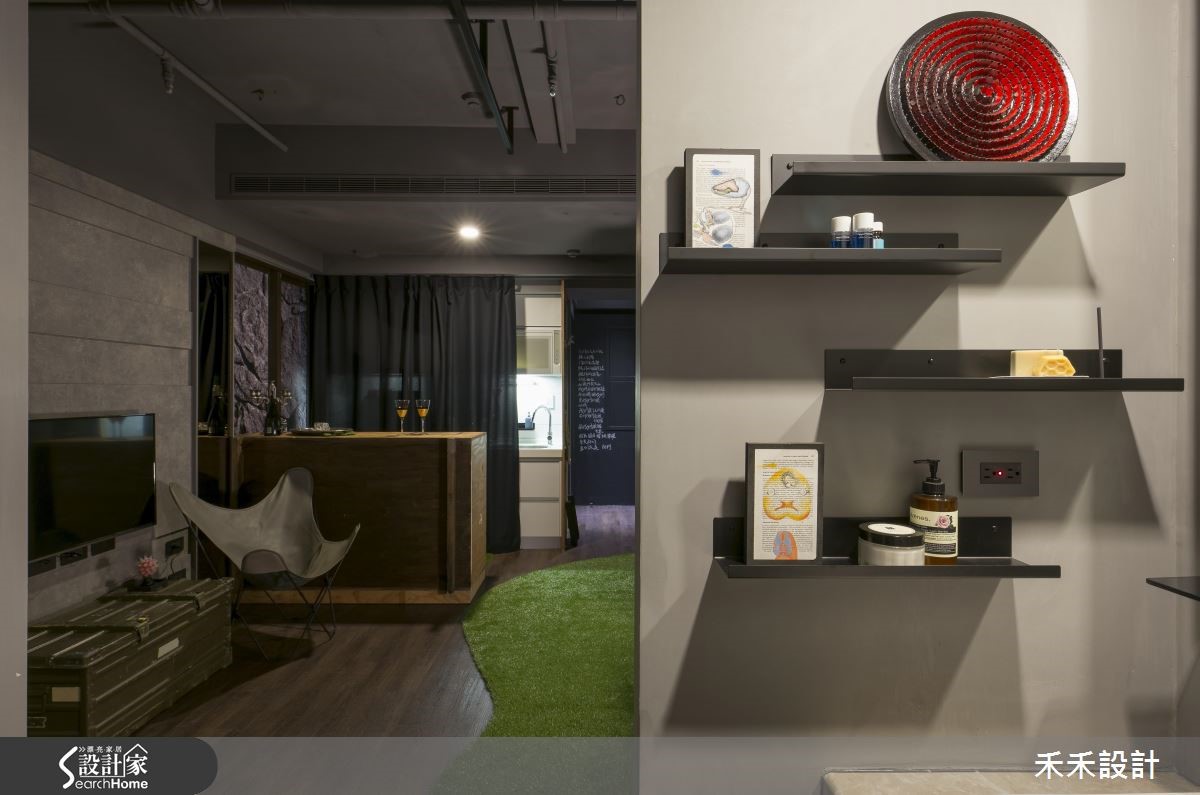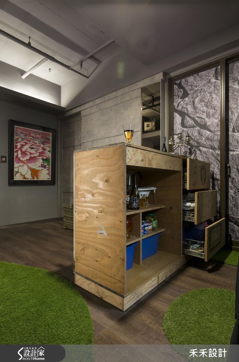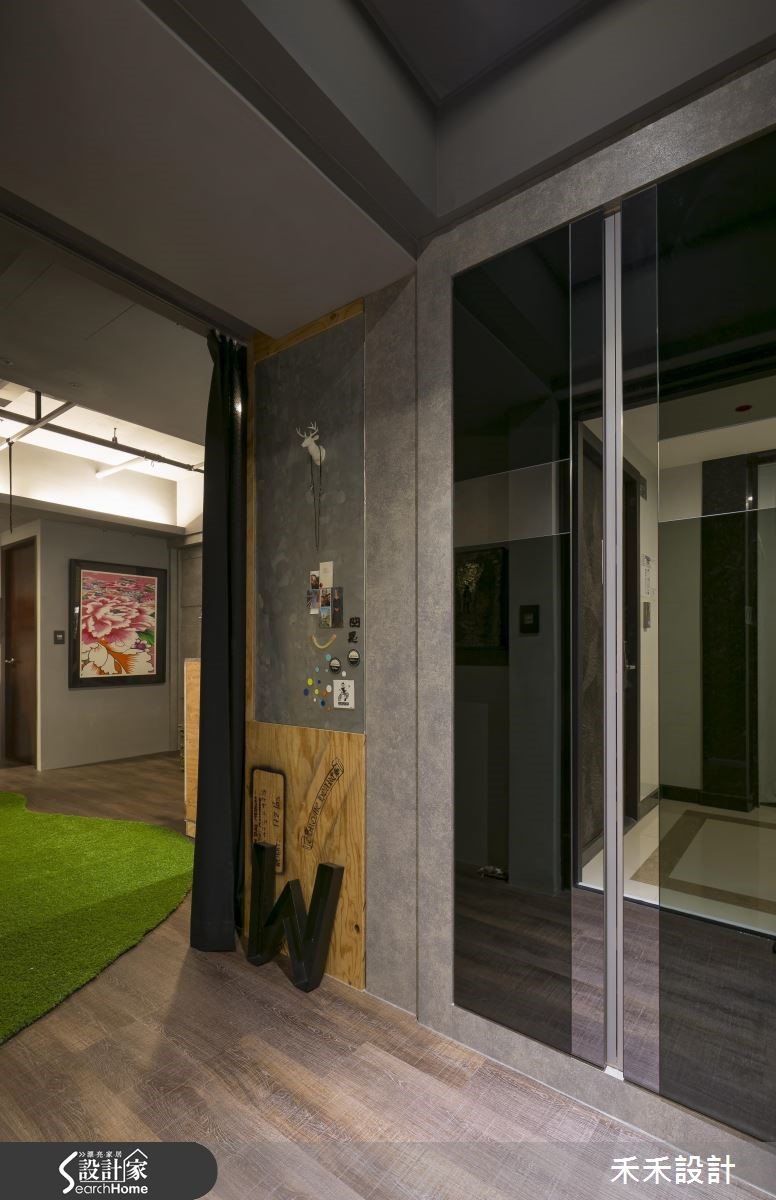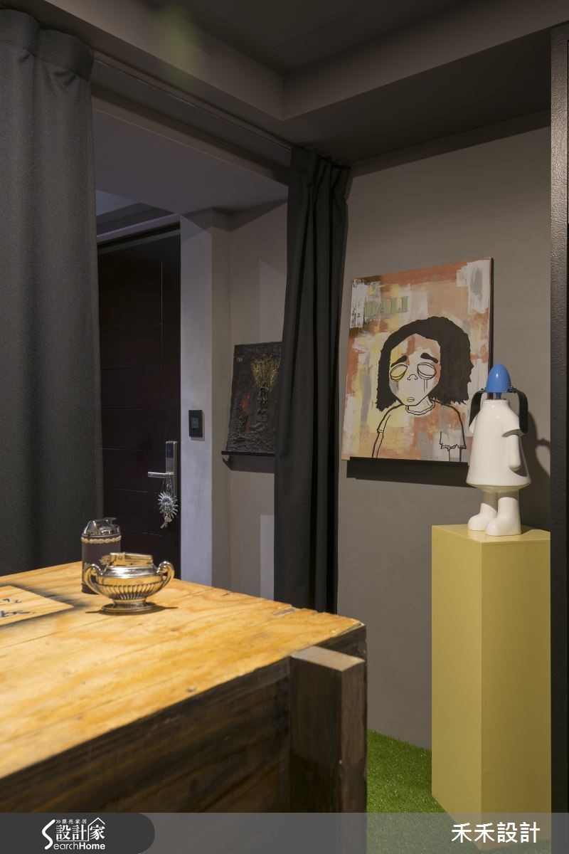 屋主在购买66平方米的住宅,发现原本的装潢风格与自己的品味差异很大,加上大楼间距过近,一开窗就能与邻居相望。于是禾禾设计重新打造,以"山洞"的概念作为设计主轴。【灰色隐喻山洞,纳入粗犷气息】整体空间以灰色作为主色,仿造山洞般的石材纹理,展现沉稳自然的氛围。由于屋主有著宗教信仰,因此玄关规划成每天祈祷的重要空间,并在墙面写上圣洁祷告词,也消弭电箱的突兀,一旁的落地鞋柜则以黑镜与灰镜打造十字架造型,也兼具照镜功能。在窗上分别贴上石头或红砖花色图腾的贴纸,避开直接与邻居相望的窘况。在17平方米的客厅采用开放式格局,并植入国外流行的"mini golf(小果岭)",舍弃桌椅仅以人造草皮充当地毯,上头摆放几颗抱枕,创造出惬意的聚会场地。吧台则以大型货运木箱搭造,下方置入滑轮的设计,可依需求随时移动。同时,铺设屋主收藏的爱马仕餐具与披毯,并在墙面妆点多件名画创作,像是玄关通道墙面的展示空间,彷佛小型的艺廊登场。