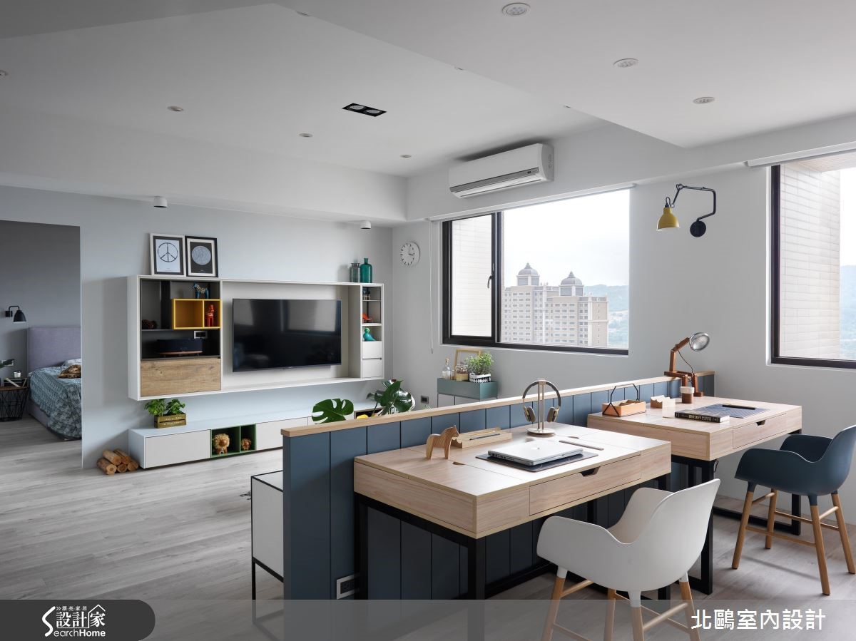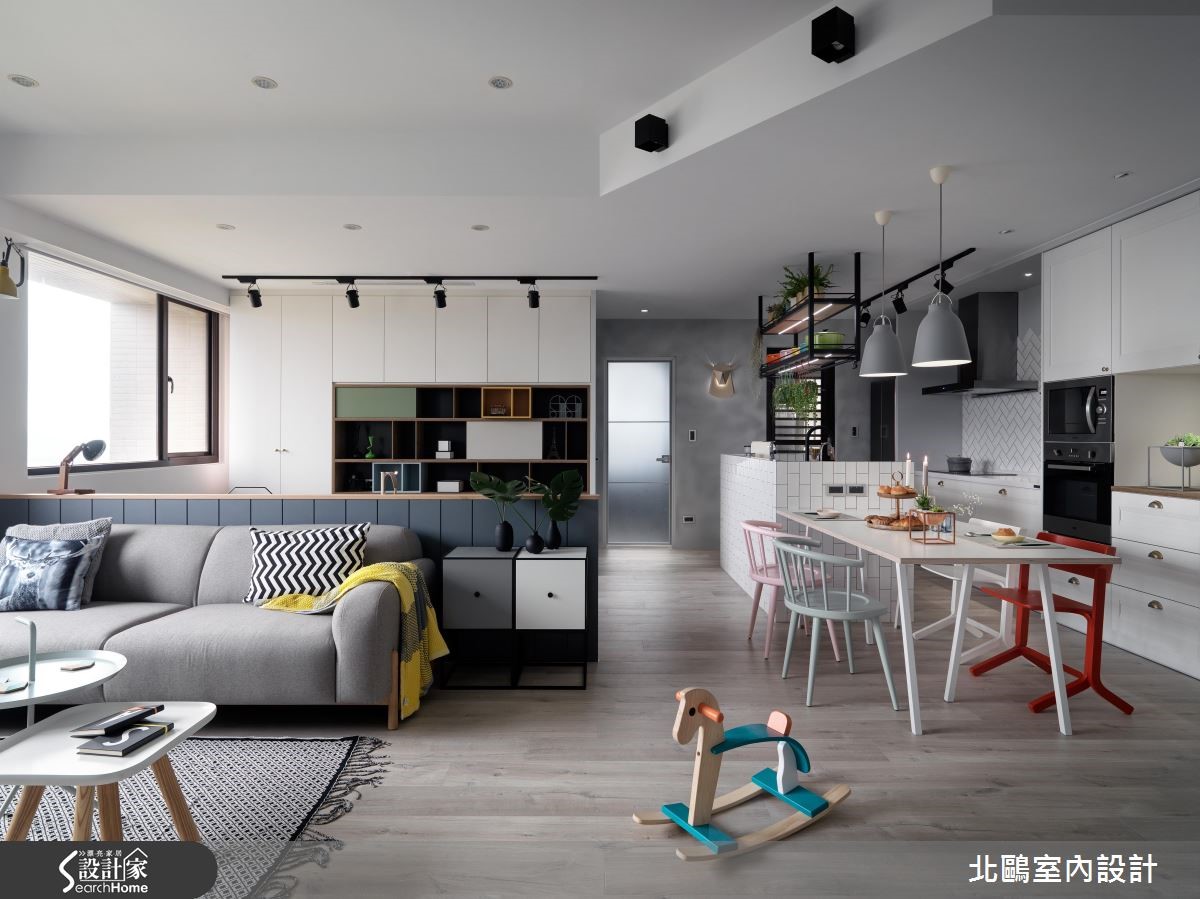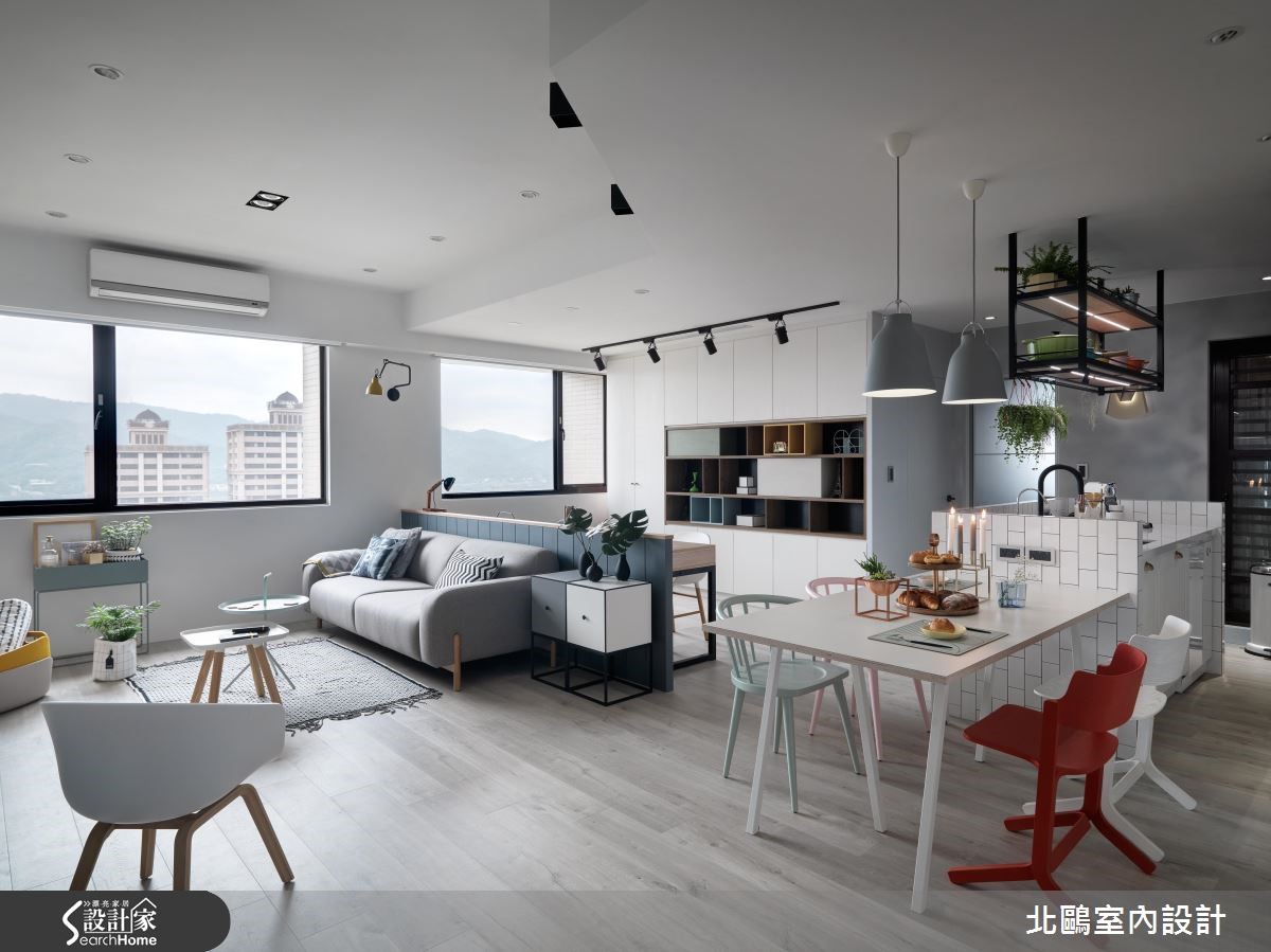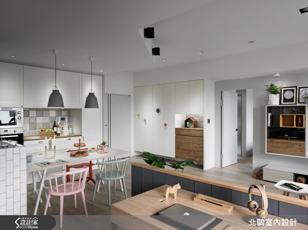 99平方米居家展现舒适放松,全得自于设计师运用家具及色彩,阐述纯粹简约的北欧风格。并藉由开放式手法,将书房、餐厅与客厅等融会贯通,搭配大量的流动采光,成就出开阔明亮的好视野。 【客餐厅既开放又独立,乐得自在】空间整体以白色贯穿,中央留出宽阔走道动线,让各领域在开放之中保有各自范围。且突破传统做法,不仅包覆横梁,更打造独特的天花线条。搭佐粉嫩家具、充足日光及绿意植栽等点缀活力,体现舒适的生活意境。在电视墙、书墙、玄关融入兼具装饰性、收纳机能的柜体,而两张独立的并排书桌、加长延伸的餐厨领域等,也酝酿着互动情境,凝聚家人之间的情感。餐厅吧台引用白色的洗炼砖面,采以趣味的交丁排列,创造视觉魅力。寝卧内,规划了专属的更衣室,内部除了提供大量的衣物及行李箱收纳,也坐拥灵活不局促的空间感,睡眠区则透过窗户引入开阔景观,借着灰色调的大面积铺叙,以及简单、有设计感的家具配置,带出理性沉稳的屋主性格。