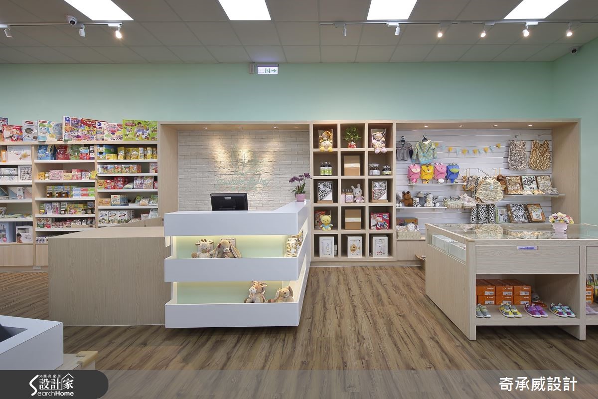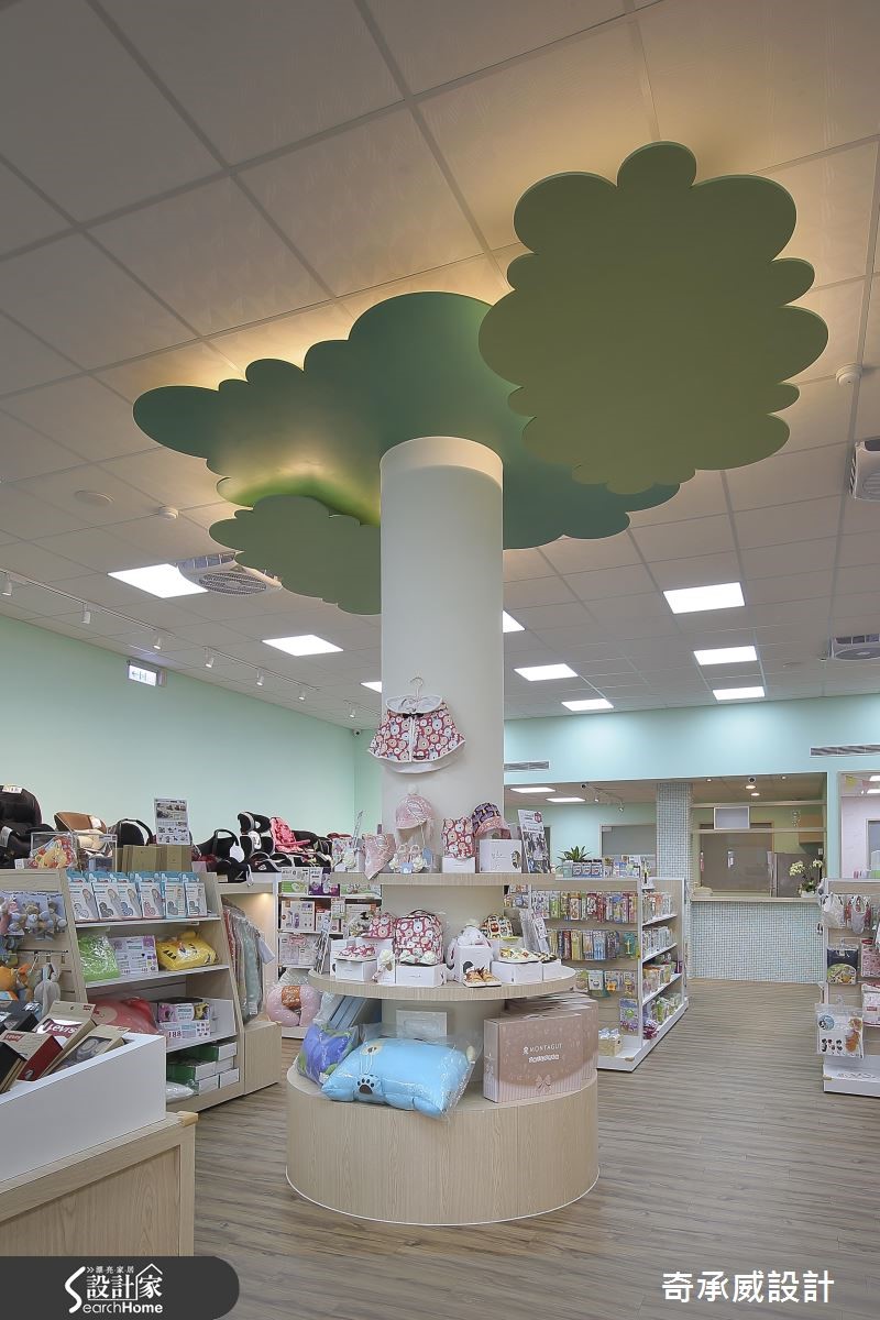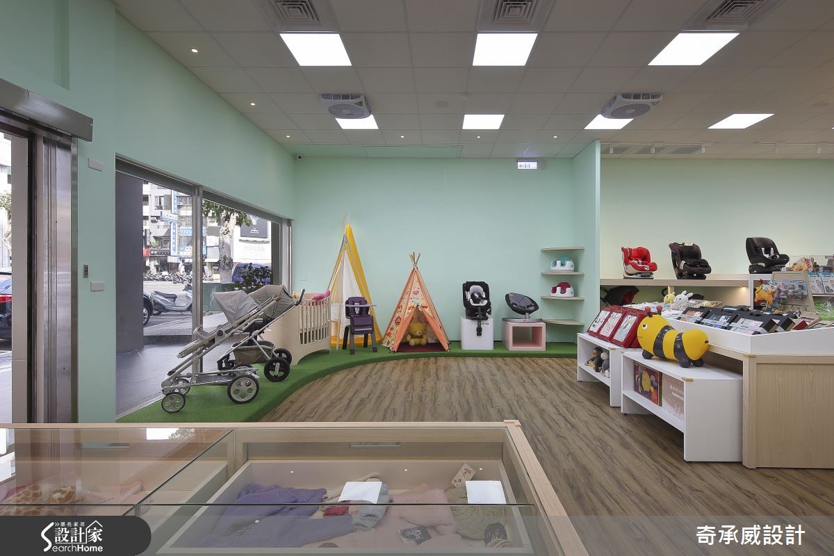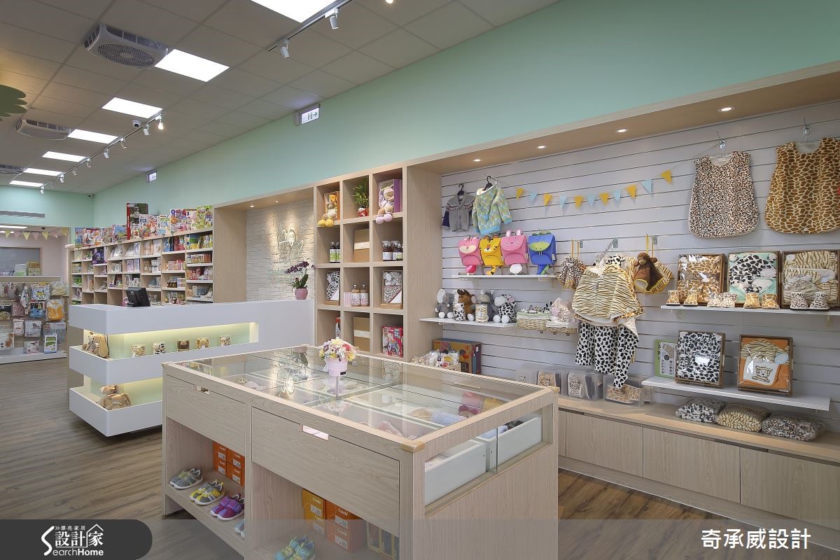 替家里的小宝贝打造一个充满童年、无忧无虑的环境,是每个父母亲的梦想,现在更透过室内设计,创造出缤纷童趣的感受。【轻柔舒服,特色品牌橱窗意象】大门左侧展示区以落地玻璃打造,映衬婴儿车、摇篮等婴儿物件,展现出品牌特色的橱窗意象,成为吸睛的视觉引领,让路过的人们忍不住目光驻留。室内空间里,透过木纹铺叙整体,粉绿色系粉饰壁面,呈现轻柔舒服的氛围。【齐全的展示规划,创造生动趣味】走道的两侧以开放式层架展示婴儿用品,充足的走道规划,带来宽敞感受;墙壁以文化石衬底,LOGO以铁件围塑的方式装饰在壁面上,藉由主视觉的营造展现柜台特色,台面则结合内嵌光源与陈列玩偶手法,创造出趣味气息。【仿造儿童乐园,自然感童趣设计】中央柱体的天花板以悬浮云朵造型展现,结合嵌灯方式,营造出阳光渗透云朵的自然意象;后方的角落还打造一处儿童区,猫头鹰地垫加上欢乐童趣的玩具,结合缤纷色块的铺陈与旗帜符号,彷佛来到一处儿童乐园。