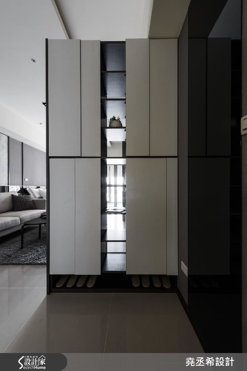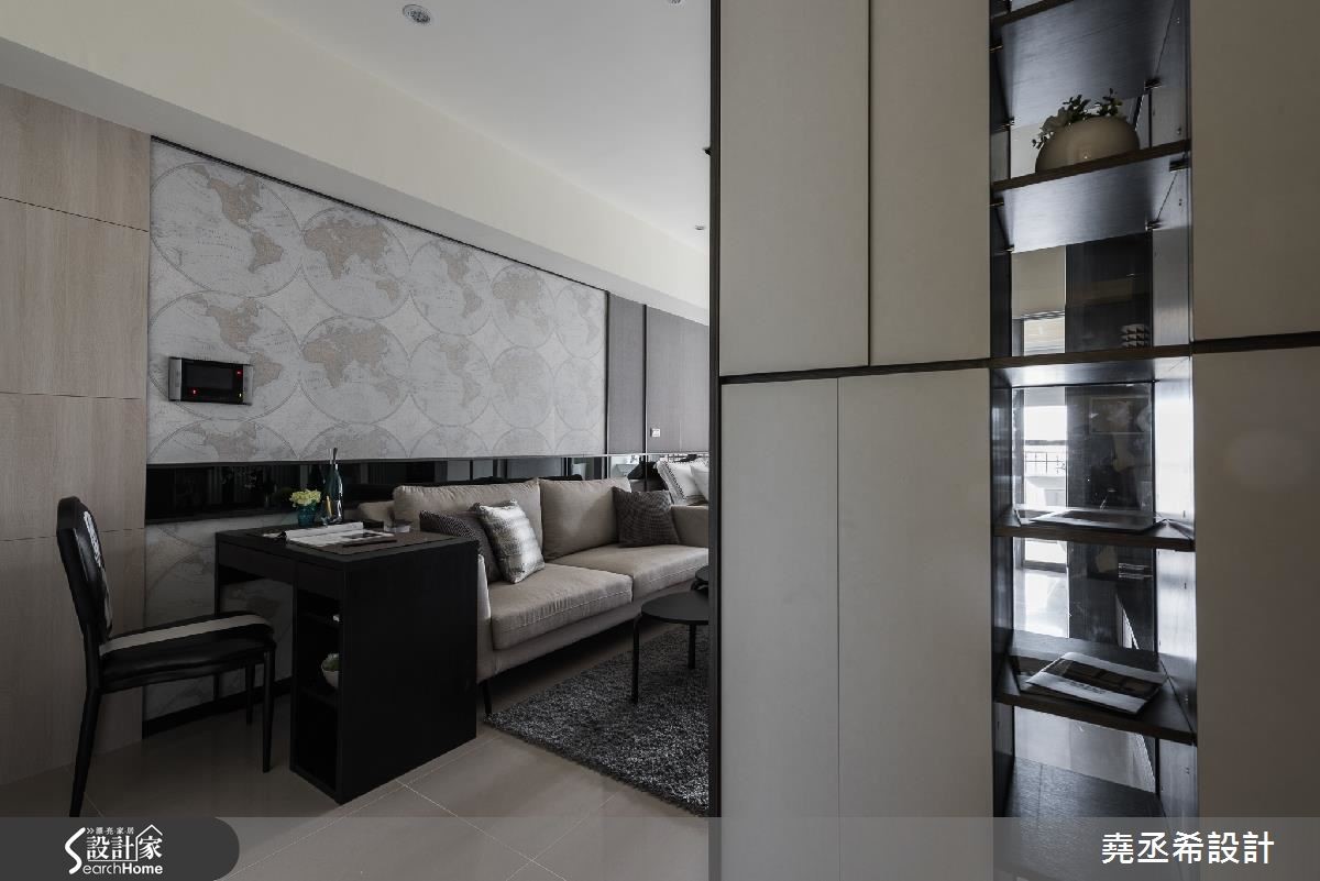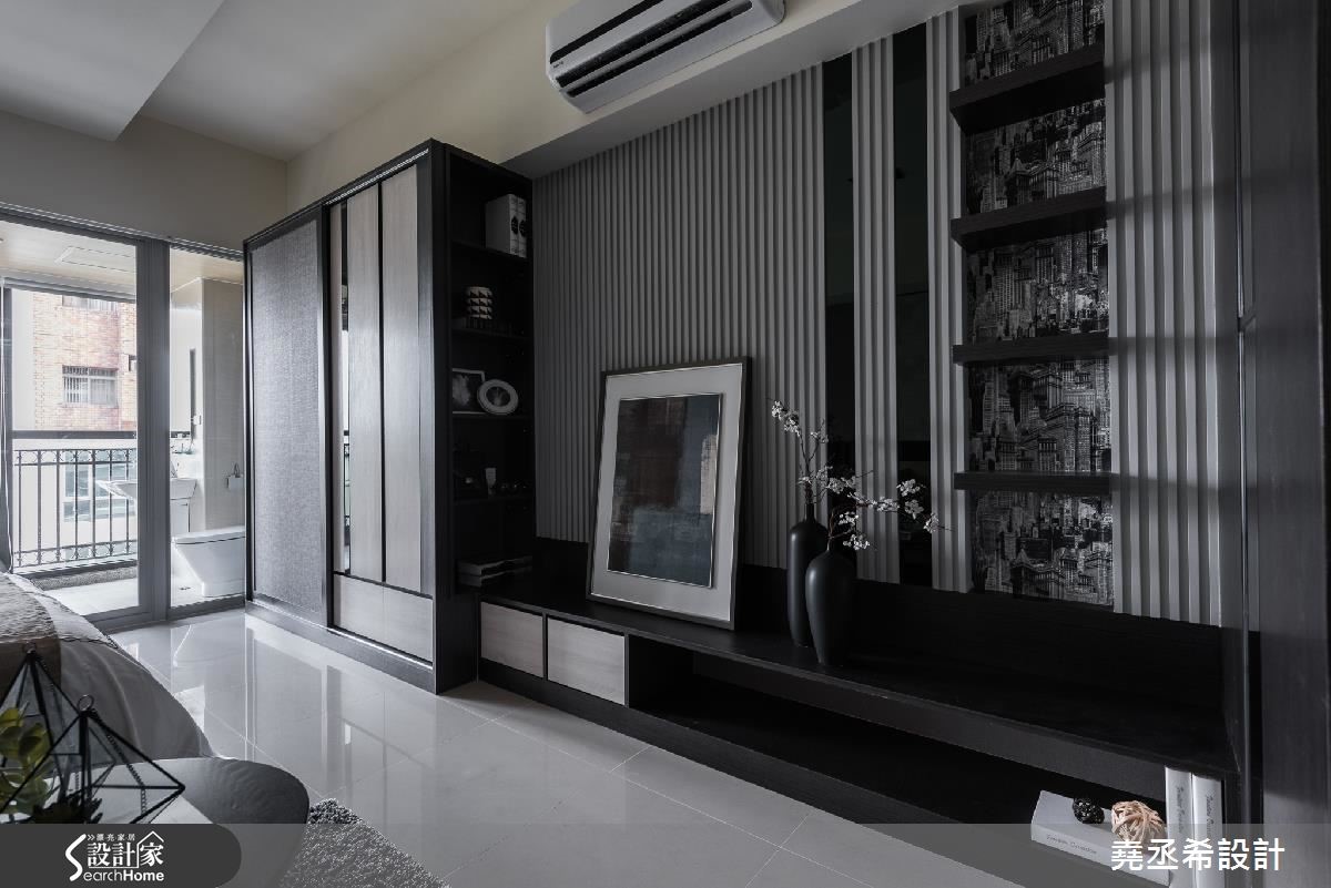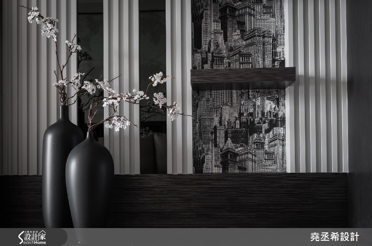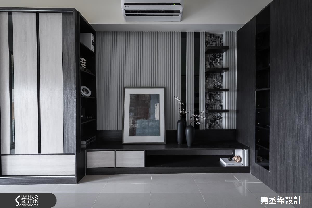 在33平方米的小户型里,全室不做隔断,为了让空间不显小,以简约的黑灰白色有效扩容,也造出高冷范。透过直条纹的层次立面、局部以镜面材质点缀,轻洒低调的时尚美感。【简约色调描绘出现代风尚】由于空间较小,且为长型格局。于玄关处打造一面局部穿透、开放层架式的鞋柜,不仅巧妙遮掩视线,避免一开门就能一眼望见卧房。透过适当的镂空设计,也让户外的光源能够延伸到玄关处,创造景深,并满足居家机能,自然界定内外领域。整体空间利用垂直水平的黑色线条串连,巧妙划分出领域机能。同时,呼应简约的风格特质,电视墙以立体感沟缝描绘,右侧壁面结合层板、城市造型的墙纸和镜面,异材质的结合让简洁干净的氛围之中,谱下丰富的视觉层次。