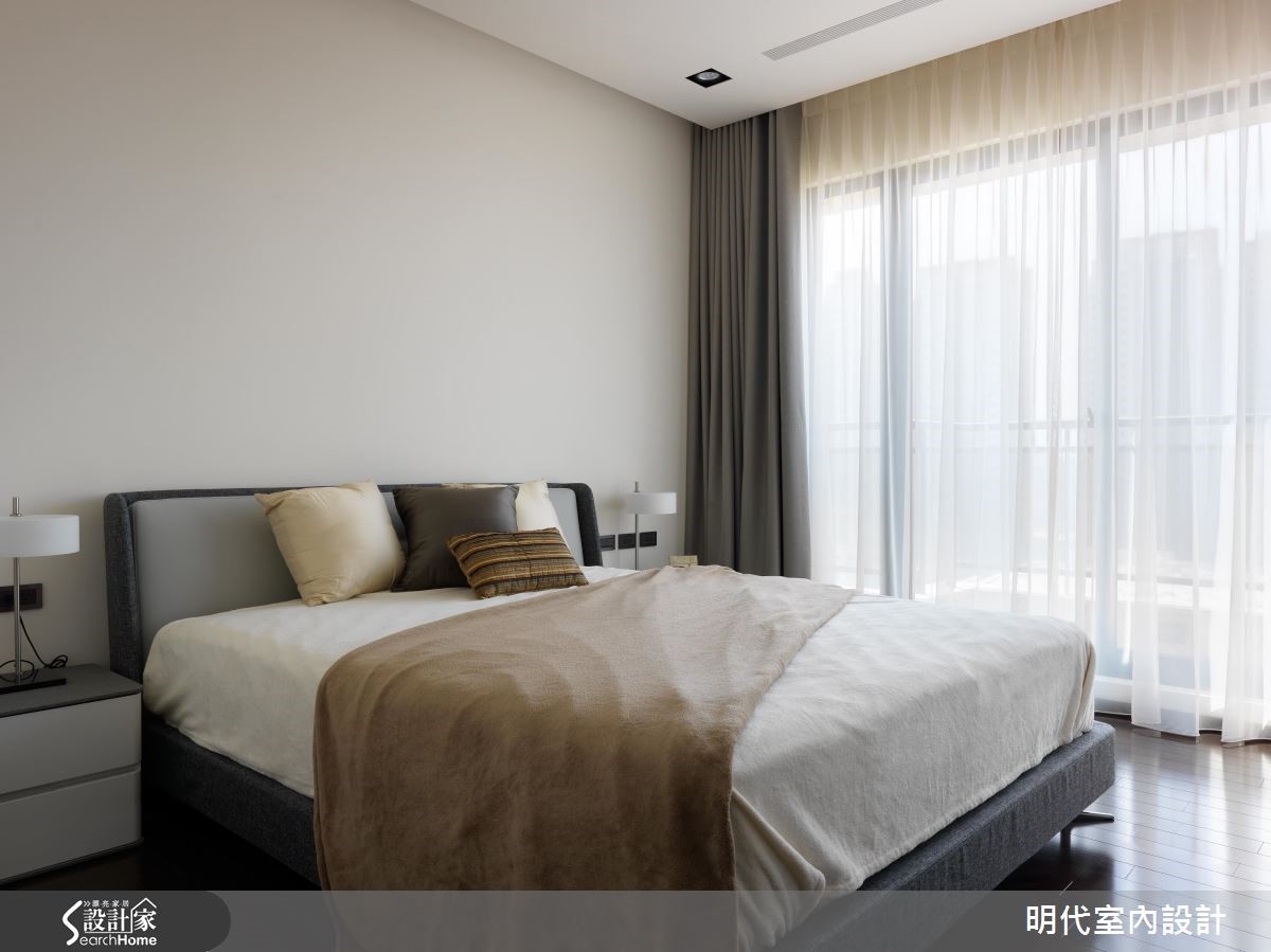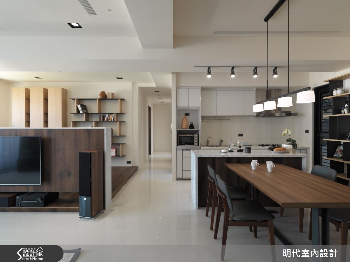 设计师在重新整顿住宅格局后,注重建材质地、减少过多装饰,以白色作为背景基调,凸显烟熏橡木皮的沉稳风范,让居家利落且不失温度,呈现屋主期待的舒适氛围。【木质营造简约自然的生活格调】入口处,设计师于玄关规划通透屏风,以铁件搭构木皮、揉合轻盈线条,适时引渡客厅区的明亮光线;不同于玄关的浅色木皮运用,客厅采以色泽较深的烟熏橡木打造电视主墙,显现自然温润的段落层次,搭配灰阶、深蓝的软件点缀,凝聚简约但不沉闷的生活格调。【在低彩度中演绎舒适本质】电视墙后方围塑成开放式阅读区,一侧墙面给予三座轻盈的量体配置、搭配层板的利落架构,兼具美观与实用机能,展现木素材的温润质地;寝卧承袭木质的温暖质韵,选配大地色床单与抱枕,呈现内敛的典雅质感,在低彩度中演绎舒适本质!