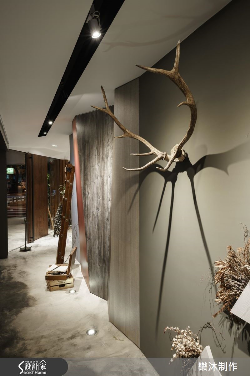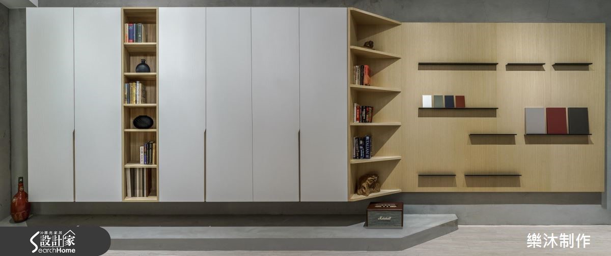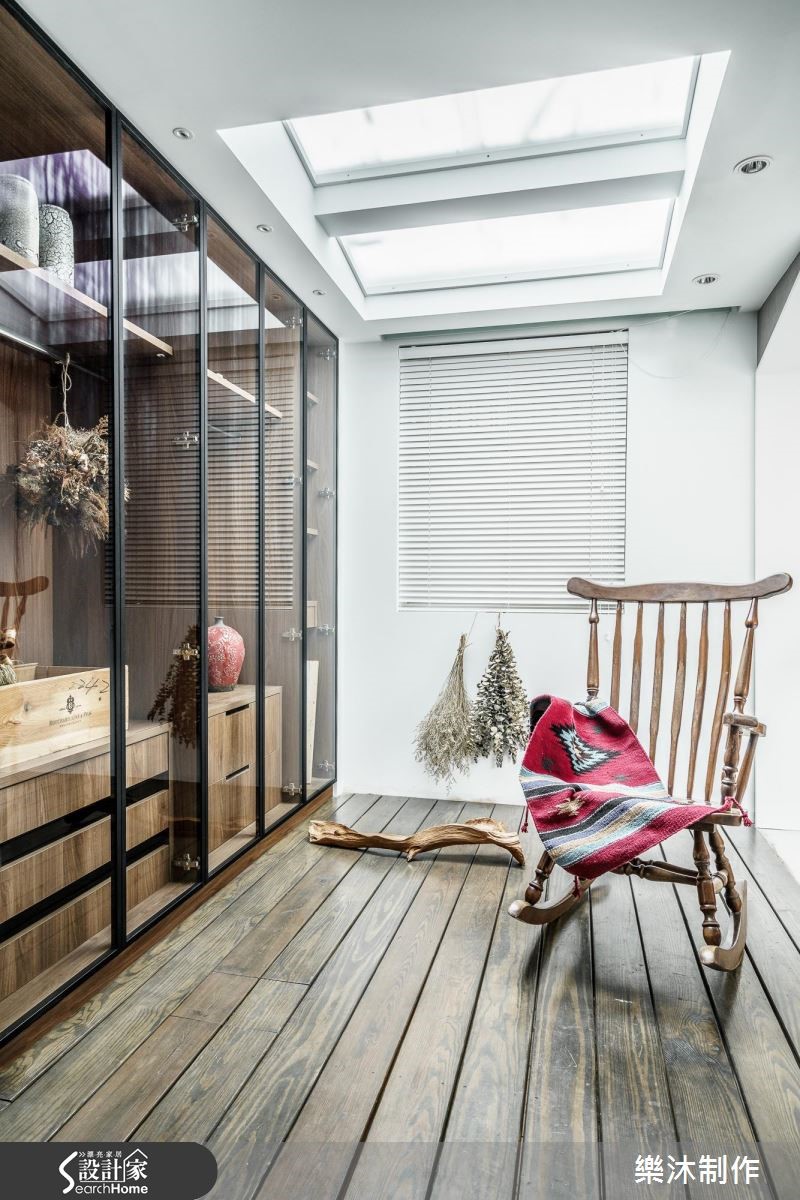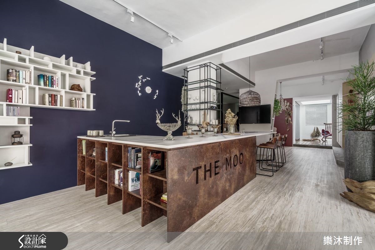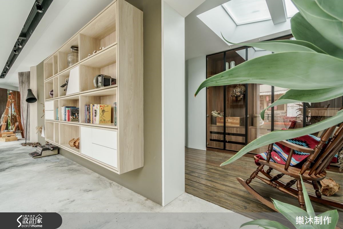 在街道转角处,由玻璃围塑出工作室的场域,透亮的材质界定,让行走的路人能够一眼欣赏室内风景,建筑外观以木作、绿意植栽妆点,伴随室内展现的惬意北欧风格调,调和出浪漫的美学色彩。【引光入室,在室内与日光共舞】大量光源穿透玻璃隔断墙,游走在室内空间里,照亮空间里的迷人细节。大型中岛结合餐桌,并利用深紫色壁面装置白色开放层架及设计感时钟,展现简约的时尚品味;领域深处,则以开凿天井的方式,让光线洒入室内,搭配木地板与摇椅,流露出惬意、慵懒的度假氛围。空间另一侧以水泥墙搭配不同质感的淡雅木纹以及白色柜体,铺陈出自然朴质的生活样貌,恬淡中不失赏心悦目之美;整体空间的柜体以系统板材为主,跳脱传统的刻板印象,大胆利用四方体板材框构出各种型体,再搭以色彩深浅变化,创造出独特的视觉美感。