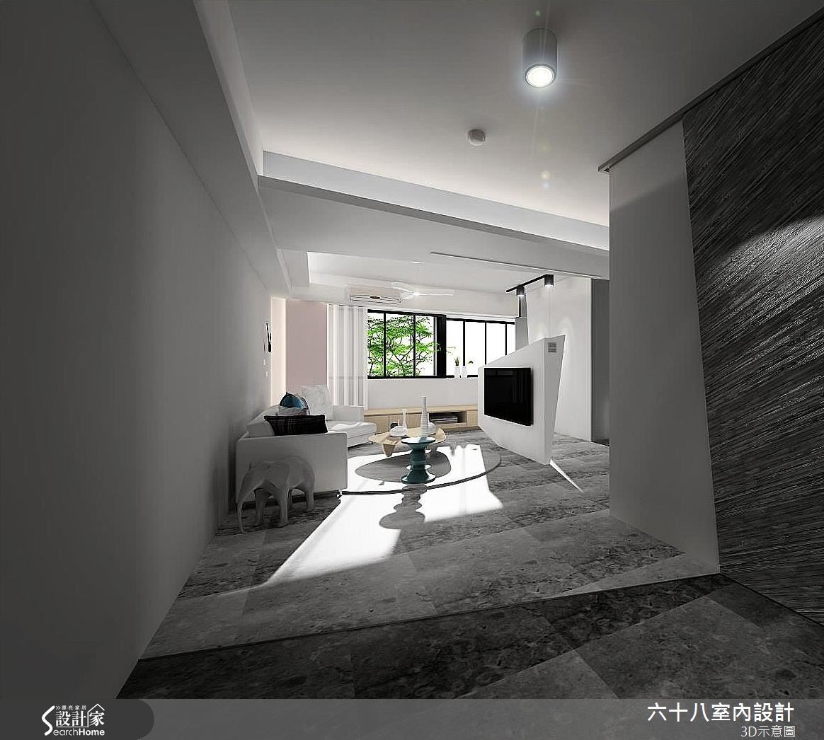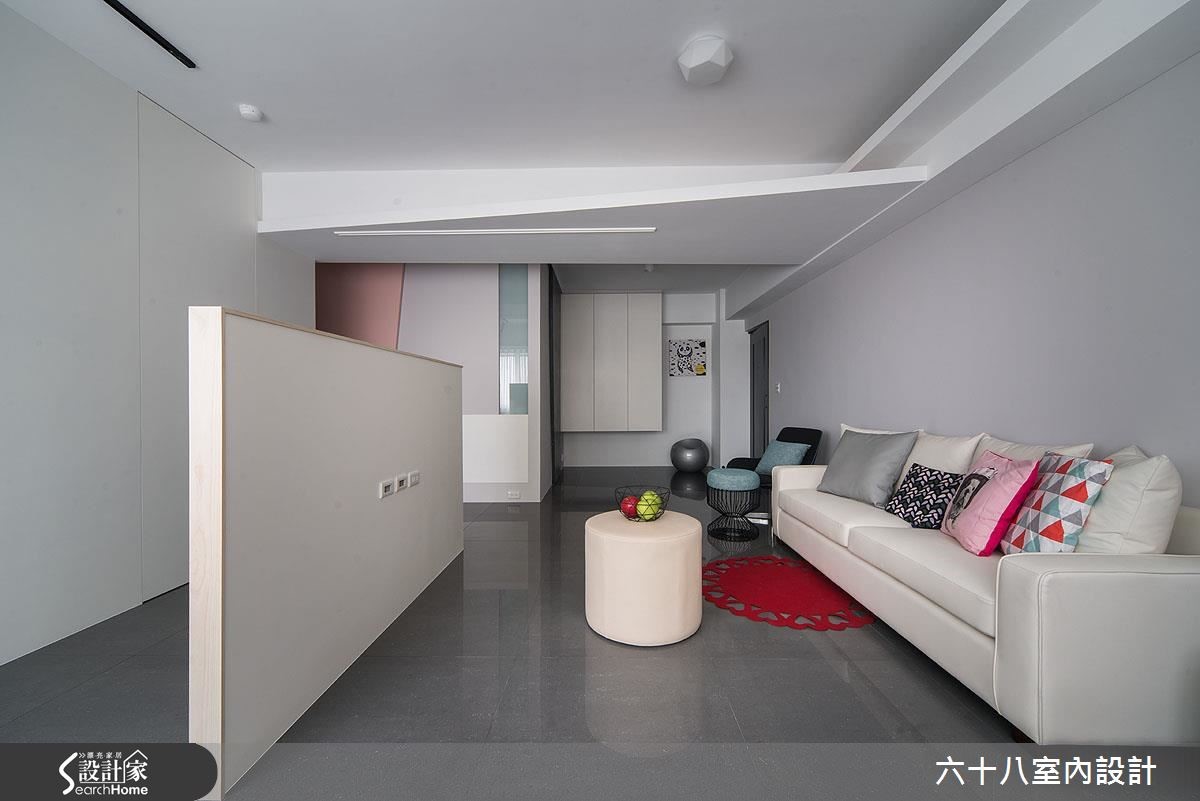 设计团队不受限于小户型的弱势,利用动线流畅的开放式设计打开原先单面采光的视野,让光线在公领域无限流转,并以多种材质巧妙区隔开放空间中的界线,除了达成扩容目的,更让居家空间层次丰富。【降低居室数量,释出空间】为了避免狭隘视觉,入门处屏除传统玄关设计,利用附有间接照明的悬柜收拢杂物,并利用延伸至壁面的几何色阶成功区分玄关和客厅。针对二手房梁柱问题,设计师运用局部吊顶营造富有层次的天花风景,并以粉嫩跳色修饰柱体,增添浪漫氛围。由于空间有限,设计师减少居室数量,并以方块设计归纳每一个空间的机能。刻意独立的电视墙,为墙面后方预留流畅的口字动线应用,并利用隐藏式门片成为卧房与客厅的分野,更让飘窗向卧房延伸,营造无限拉长的空间感受。