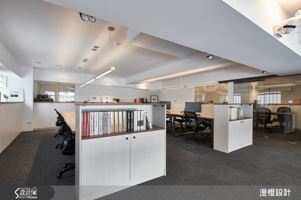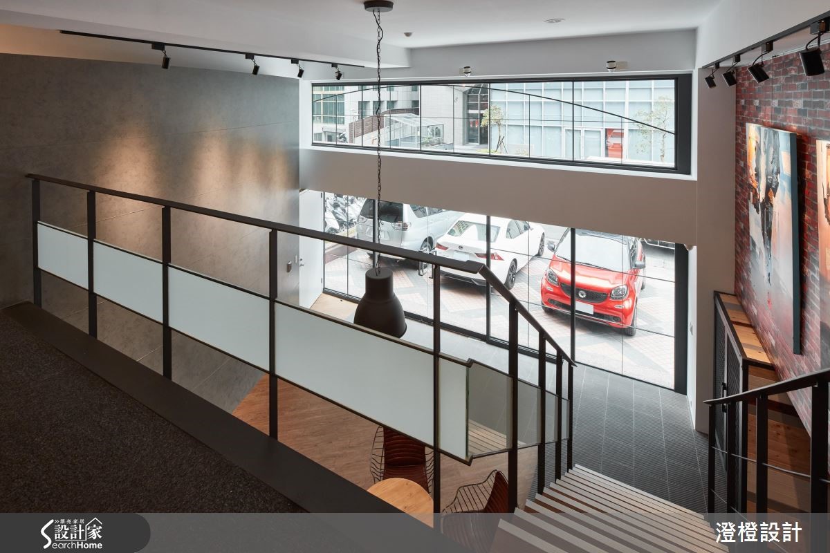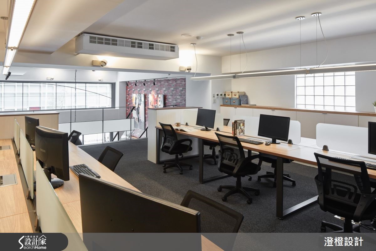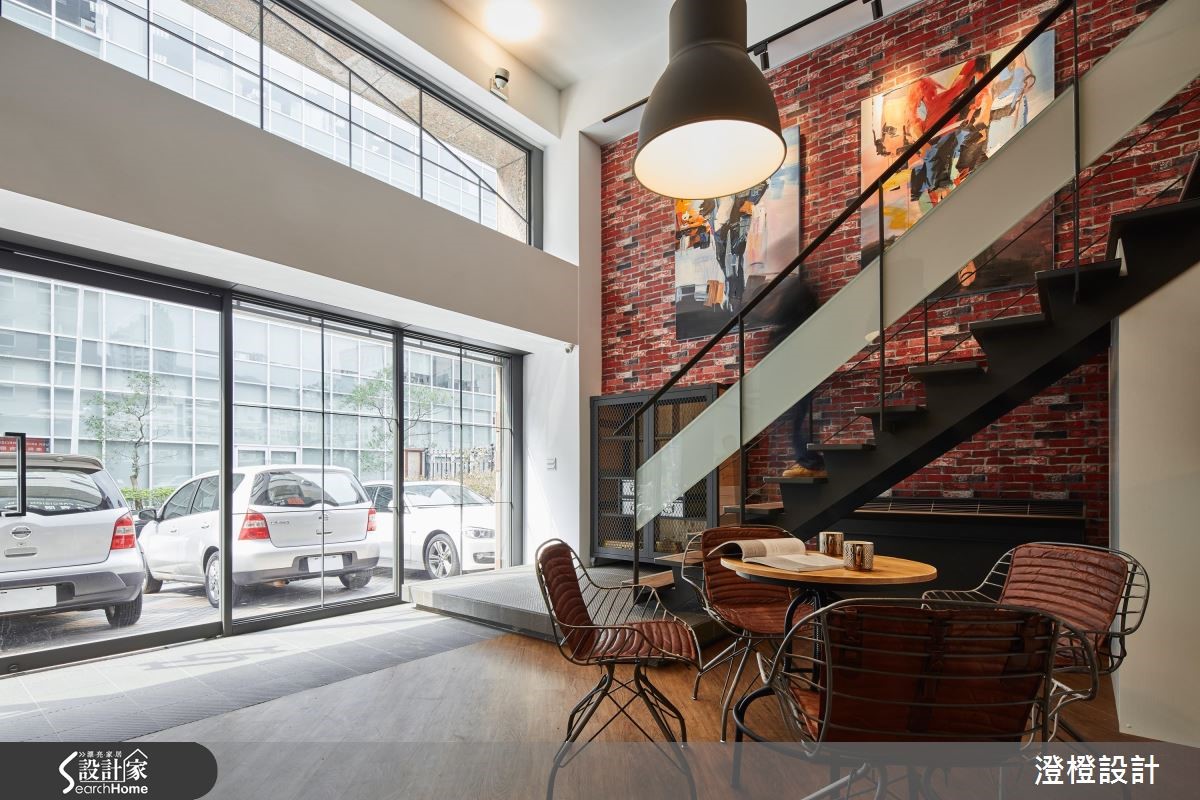 精密机械仪器公司由二代接手后致力转型,希望将利落时尚的企业形象体现在写字楼。设计团队破除二手房采光、收纳不均以及预算有限的问题,更以员工的出发点为基准,打造人性化工作空间。【善用地坪材质,营造场域分野】设计师善用挑高优势打造大面积落地窗,并以大量镂空铁件彰显利落气息,更巧妙使用仿红砖墙纸、仿清水模漆以及木纹塑料地砖,大幅降低装修预算,完成工业风格营造。以吧台巧妙分隔接待区与后方会议空间,兼具隐私与置物功用,更利用结构墙下方畸零空间规划柜体,增添收纳机能;二楼以开放设计与纯白色调一扫制式呆板的工作区印象,并将置物柜贴齐壁面,让行进动线更加流畅,而小型会议室则以玻璃隔断抹除狭小阴暗的视觉感。