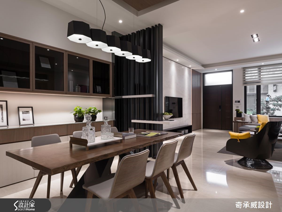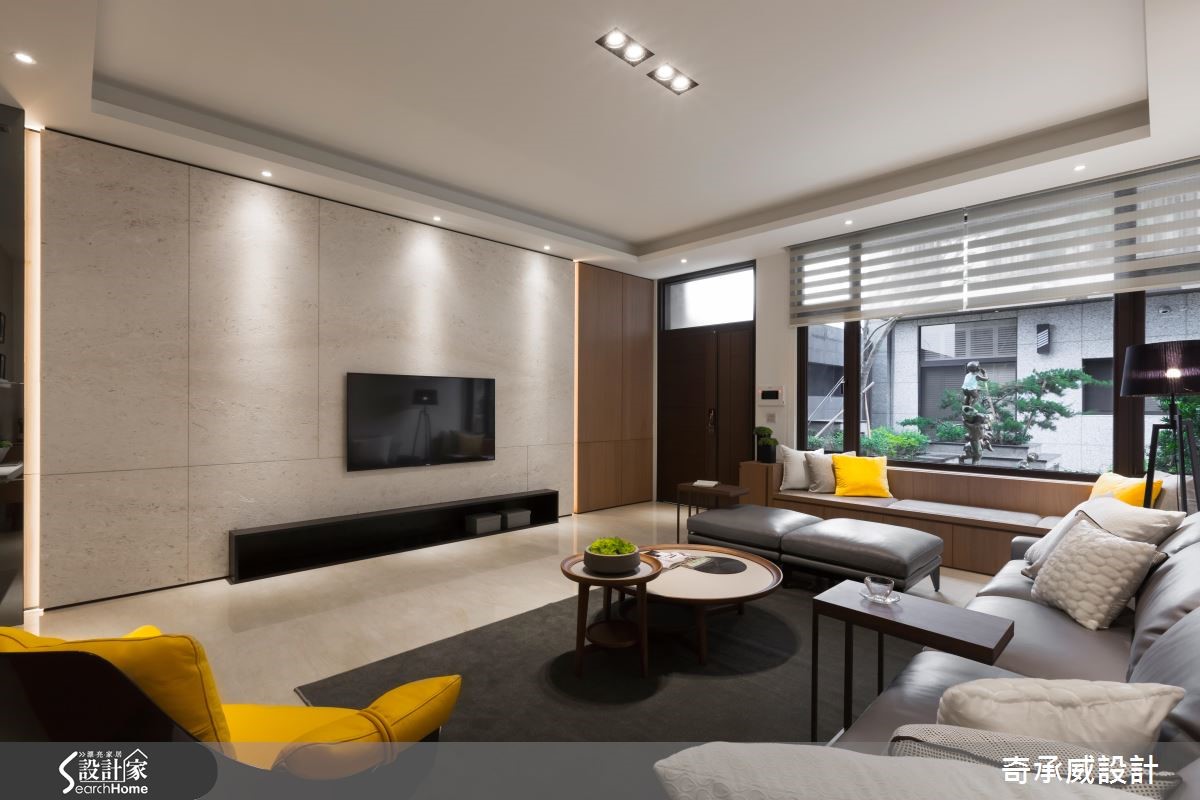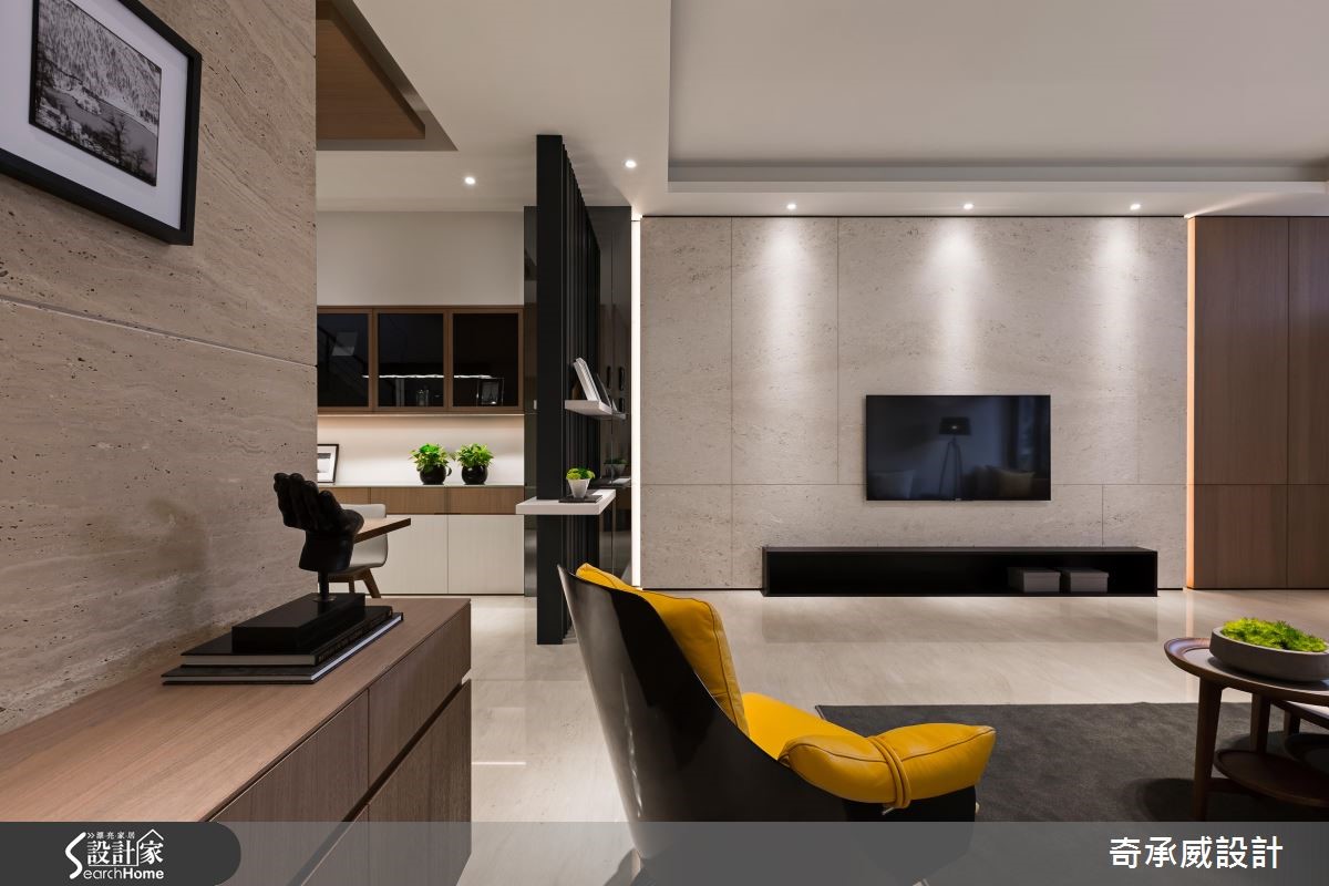 暖暖的光线穿透窗户,映照满室柔美恬静,温润芽黄色调成为室内的基础用色,结合不同深浅的木纹肌理,创造出自然的生命质感,以简约、温润的质材铺叙整体空间,内敛的设计呈现,一展新东方色彩。【闲适情调,流淌艺术的丰沛灵感】室内,宽敞舒心的公共领域映入眼帘,天花板设置内嵌照明,轻洒在石材电视墙,调和柔美光晕,而窗边设计一处飘窗增添闲适情调;黄色调单椅、抱枕的调色运用,点亮低调视感,沙发壁面饰以几何画作,流淌艺术的丰沛灵感。【简约现代,素雅干净的空间底蕴】在开放领域里,电视墙旁以隔板结合格栅的方式,打造一小片透视隔屏,且界定出餐厨区,木作餐桌椅的摆设,与空间美感相互映衬,一旁的厨房则挑选简约现代感的厨具,呈现素雅、干净的烹调空间。