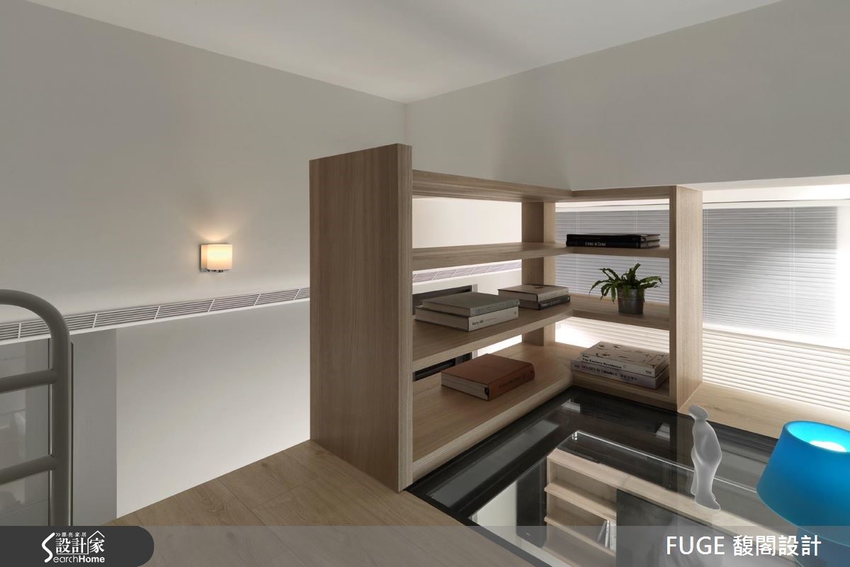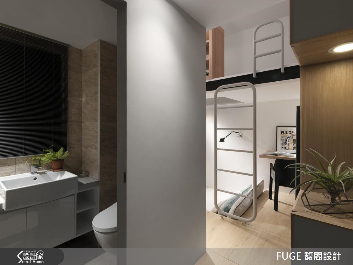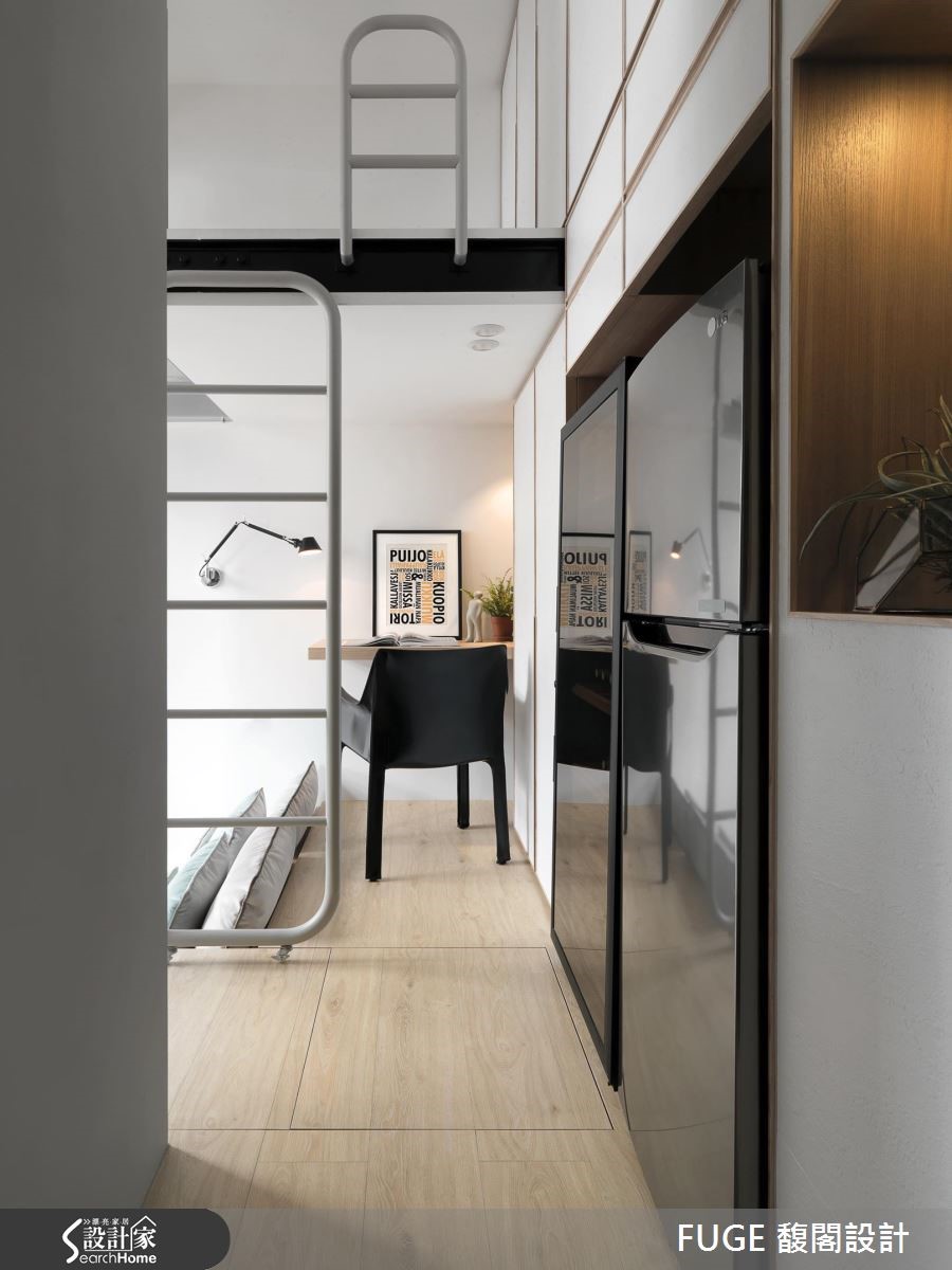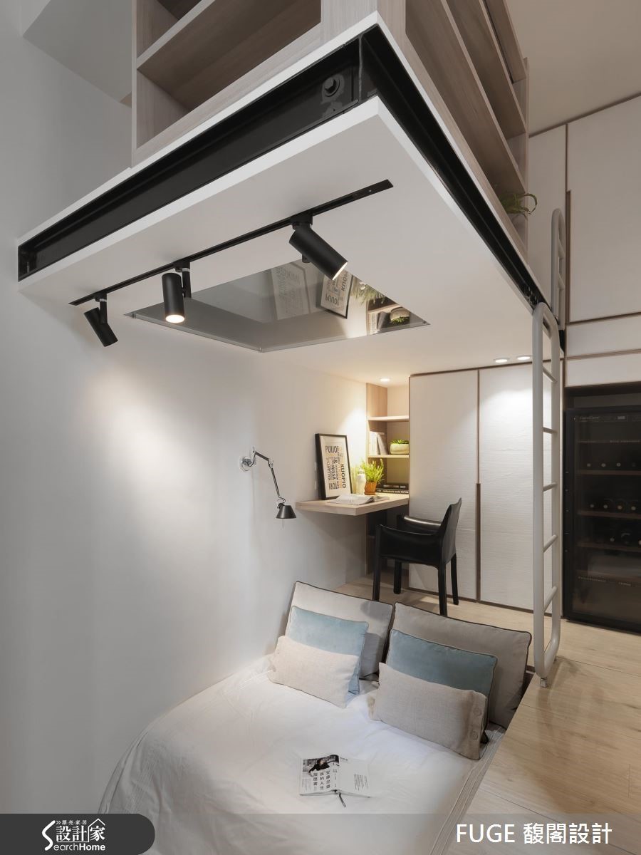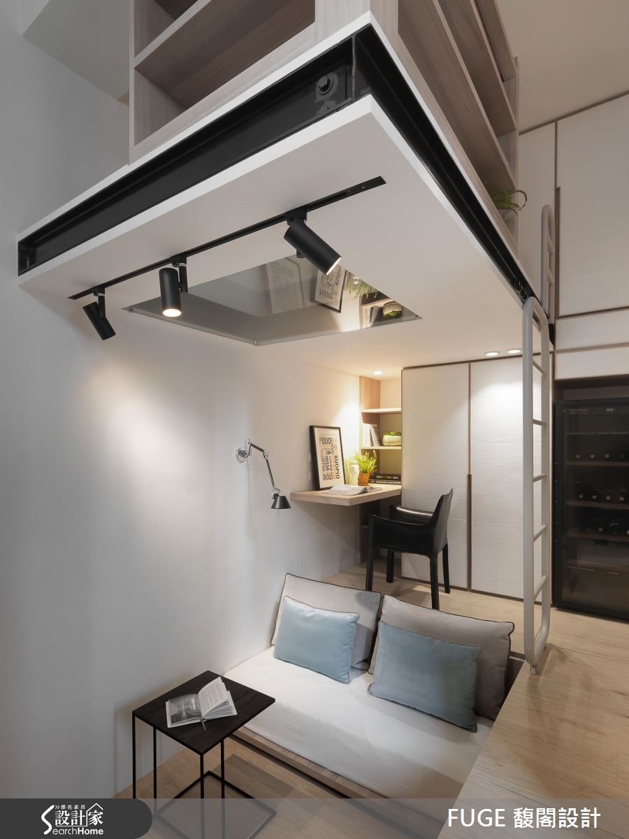位于都市中心仅有28平方米的小套房,是一对夫妻与孩子的居所,加上偶尔拜访的婆婆,同时要容纳 4 人,看设计师如何突破小户型界线,将每一平空间发挥得淋漓尽致。 【升降柜与架高地板,收纳量倍增】巧用垂直空间,玄关天花设置升降柜体,入门处左侧设置一字型厨房与卫浴,右侧规划大面积柜体与孩子的书桌,就连先生专属的红酒柜也囊括,收纳机能十分充裕。肇因空间狭小,让原格局产生大门直对楼梯、地坪高低起伏等诸多问题。设计师重整动线、接合错层地板落差,更在走道下方纳入可收纳茶几及音响设备机能,让居住者从浴室、厨房再连接到阳台的动线流畅。设计师在下方错层空间结合卧房与客厅机能,利用书桌下方的架高地坪收纳床垫,平时即可享受阅读、看电视与品酒的时光,睡眠时间时抽出即可化为卧房。空间达到多重利用,发挥小户型的潜能。
