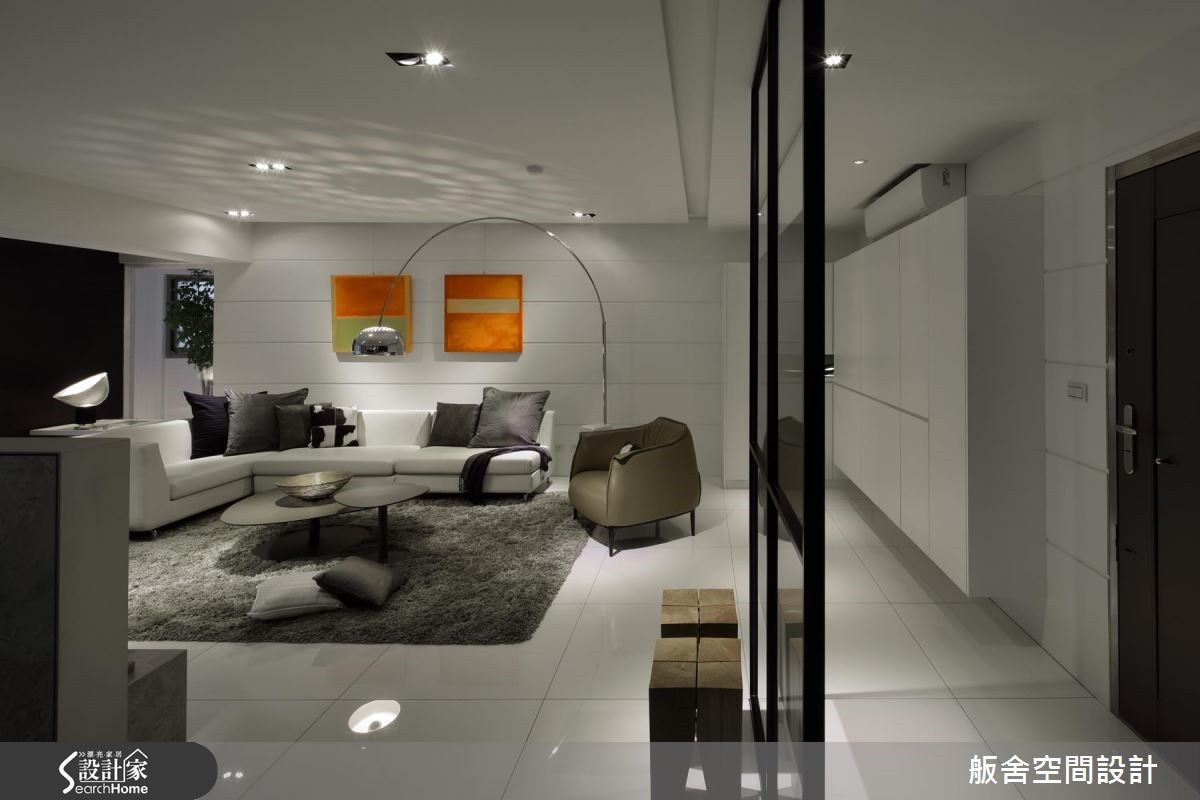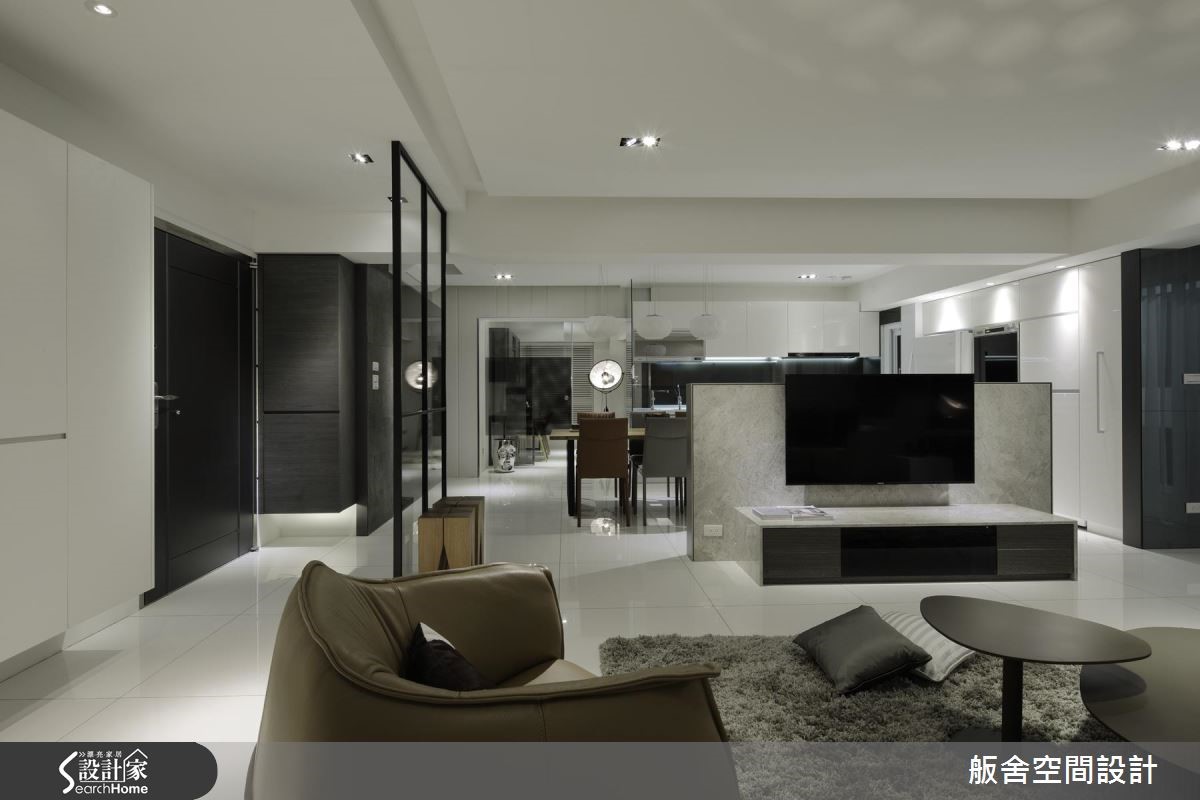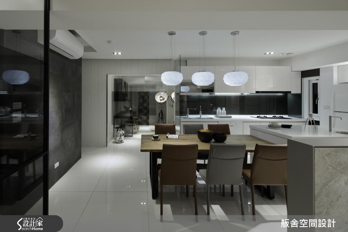 149平方米的老屋,以白色系作为空间基底,彷佛是一块创作的画布,米白、灰、黑与大地色系成为家具配色,调和和谐、静谧的自然感受,橘黄跳色的画作点缀,展现新颖的艺术风采。 【舍弃隔断,以开放设计串连感情】整体空间以通透感的设计为核心,无刻意拉出玄关区,仅以一片由铁件与玻璃打造的隔屏切割出内外界线,上半部铺贴灰玻,半透视的质材特性,带来些许隐密感受;而客、餐厅则利用半高的电视墙界定领域,增添家人互动的频率、提升情感温度。餐厅与厨房相融唯一,木作的餐桌搭配金银两色调的椅子,上方垂挂三盏灯笼造型的灯饰,引入唯美的中式优雅,而餐桌连接中岛台面,创造出两侧烹调与用餐的动线,宽敞舒适又不失生活机能。
