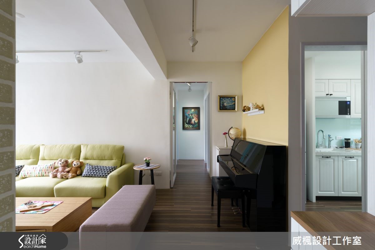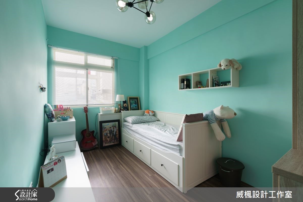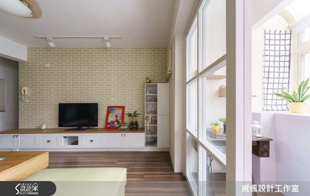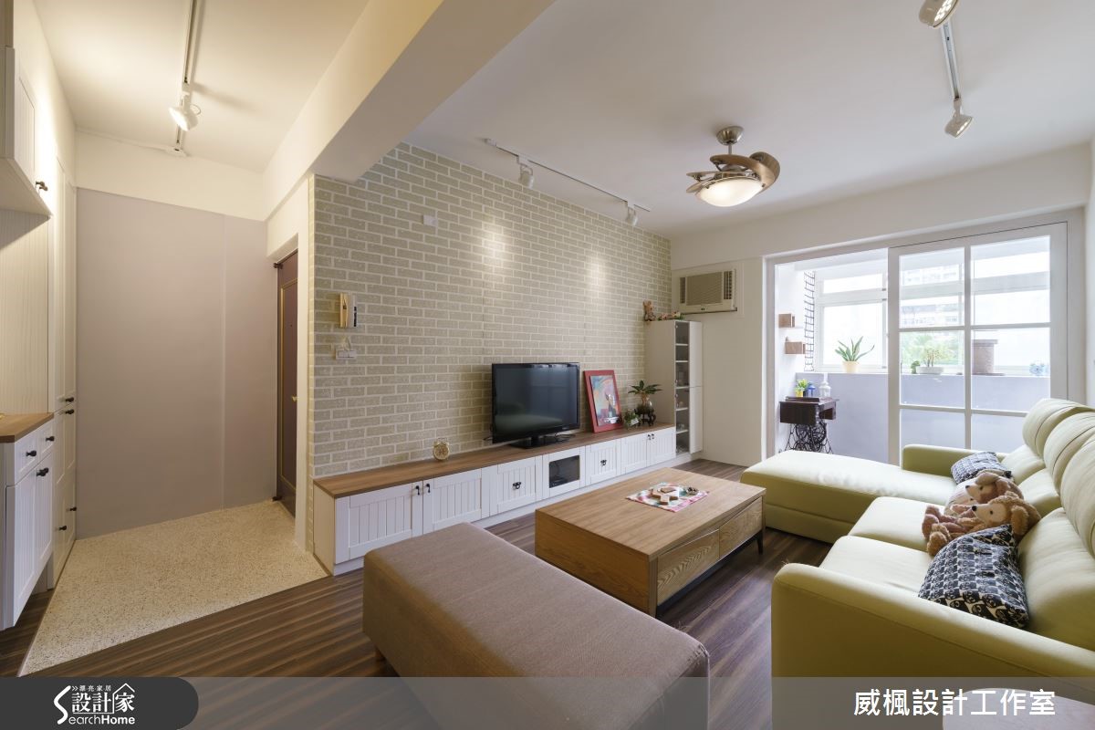 83平方米的空间,除了屋主一家3人,还有宠物4猫1狗,因此设计师以北欧风为主轴,并将宠物需求作为设计重点,为8位成员打造舒适、自然的居住空间。【缤纷壁面,营造专属个性居家】设计师以清爽色调为主轴,衬托电视墙上的文化石壁纸与跳色油漆,搭配精选的北欧吊扇增加空气对流,满足屋主偏爱自然风的希望;而针对宠物设计,选择耐磨地板保护宠物的活动安全,并将系统家具结合猫跳台,以及放置狗狗专属的弹簧垫,依照习性区分猫狗的动线。位于同区块的餐厨空间,简约的一字厨房采独立设计防止油烟溢散,用餐区则以玄关柜巧妙作出区隔,避免开门见餐厅的困扰;卧室部分,设计师分别注入薄荷绿、鹅黄等代表色,让北欧特有的缤纷色彩更加鲜明。