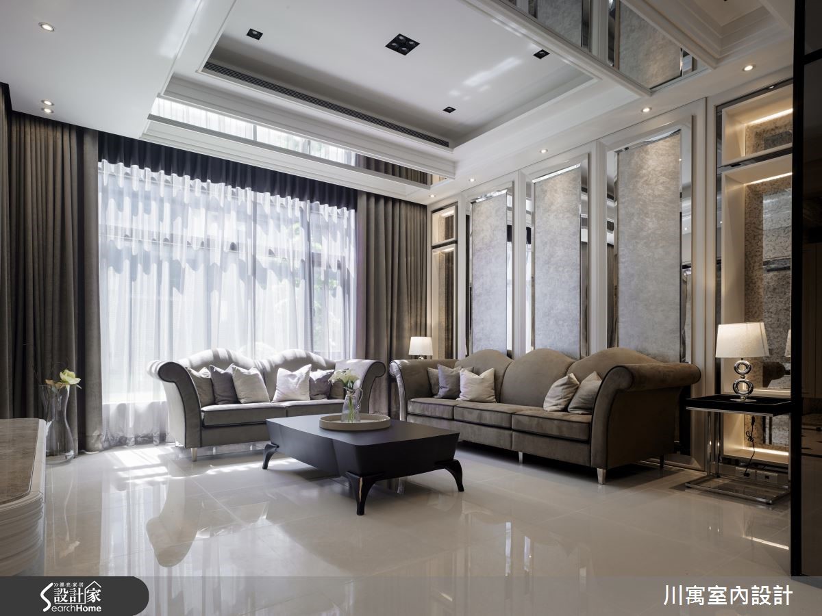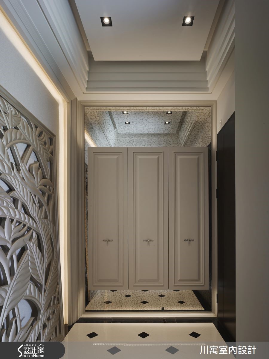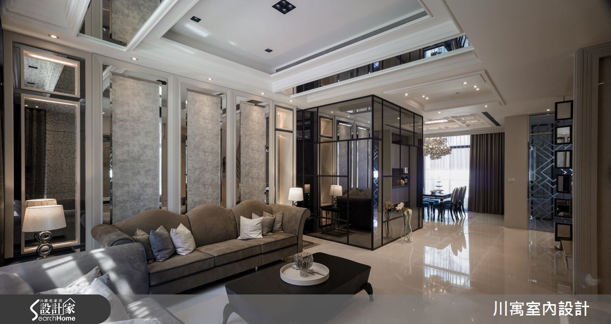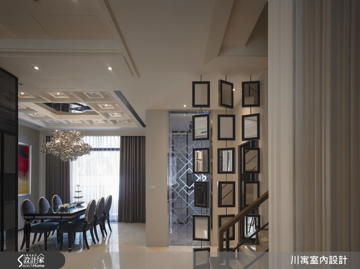 钟情于新古典的华丽质感,又希望能享有明亮温暖的生活气息,因此藉由简约、现代感的线条来描绘室内空间,尽量简化视觉层次,透过镜面与细微的立体堆叠,演绎光影相融的优雅乐章。旋开大门走进玄关,镂空金属质感的叶脉意象打造墙面造型,一旁则以镜面饰底搭以腾空鞋柜,藉由上下天地的持续蔓延,视觉展现放大之效。明亮的太阳光引援并导入整个公领域,烘托简约、优雅的内敛配色,局部以镜面点缀的空间,闪闪发亮的质感传递奢华新意;天花板饰以镜面造型,反射的光源与情境的延伸,展现大气之姿,而藉由大理石来铺叙电视墙,周围导以镜面造型为框,展现动人气势,对面的沙发背墙同样以长型镜面框出造型,相互呼应。餐厅区的壁面以五幅连续主题的画作接龙,渲染的色彩艺术,挹注人文风尚;用餐区的天花板垂挂一盏华丽的水晶灯饰,以细腻与层次感的造型堆叠,替古典的空间传递艺术美学之境,在享用佳肴时都显得格外优雅。小编的最爱让简约、现代感线条作为室内的基底造型,仅透过天花板与柜体门片上的雕琢,些微的层次表情替空间注入动人生命力。