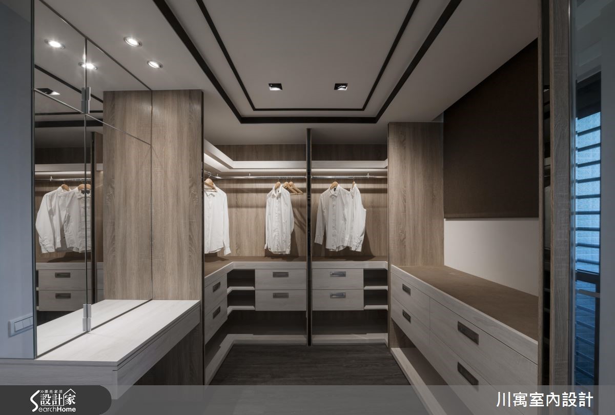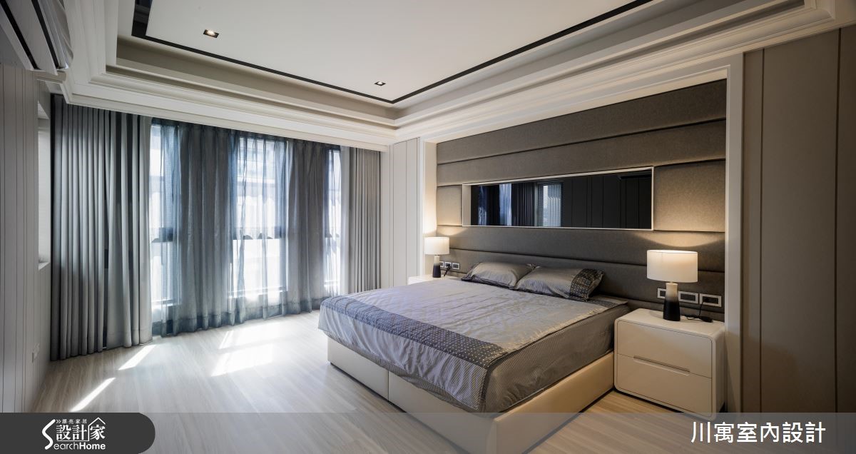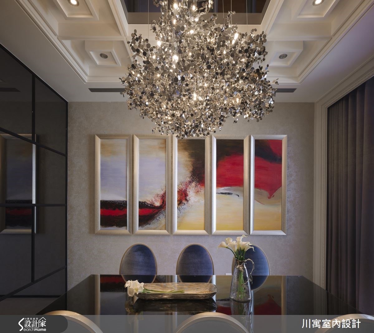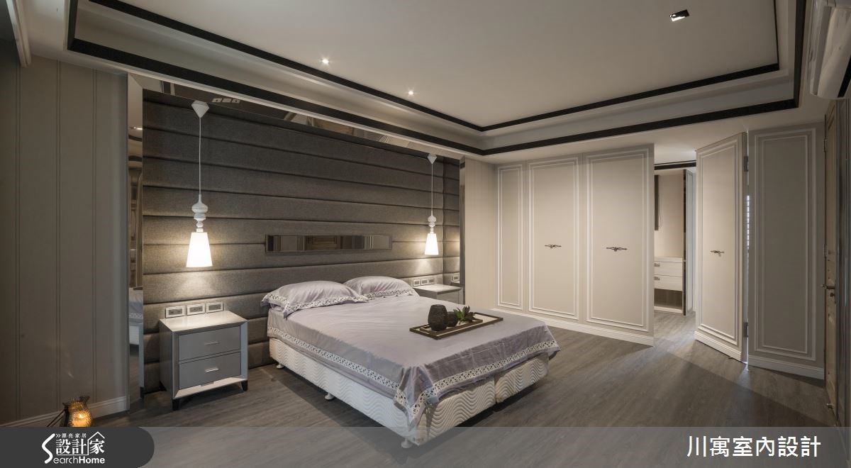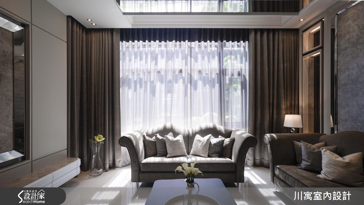 钟情于新古典的华丽质感,又希望能享有明亮温暖的生活气息,因此藉由简约、现代感的线条来描绘室内空间,尽量简化视觉层次,透过镜面与细微的立体堆叠,演绎光影相融的优雅乐章。旋开大门走进玄关,镂空金属质感的叶脉意象打造墙面造型,一旁则以镜面饰底搭以腾空鞋柜,藉由上下天地的持续蔓延,视觉展现放大之效。明亮的太阳光引援并导入整个公领域,烘托简约、优雅的内敛配色,局部以镜面点缀的空间,闪闪发亮的质感传递奢华新意;天花板饰以镜面造型,反射的光源与情境的延伸,展现大气之姿,而藉由大理石来铺叙电视墙,周围导以镜面造型为框,展现动人气势,对面的沙发背墙同样以长型镜面框出造型,相互呼应。餐厅区的壁面以五幅连续主题的画作接龙,渲染的色彩艺术,挹注人文风尚;用餐区的天花板垂挂一盏华丽的水晶灯饰,以细腻与层次感的造型堆叠,替古典的空间传递艺术美学之境,在享用佳肴时都显得格外优雅。小编的最爱让简约、现代感线条作为室内的基底造型,仅透过天花板与柜体门片上的雕琢,些微的层次表情替空间注入动人生命力。