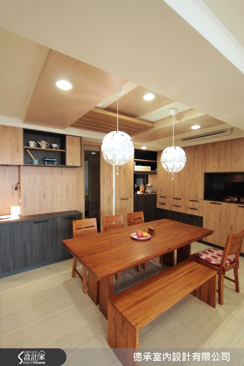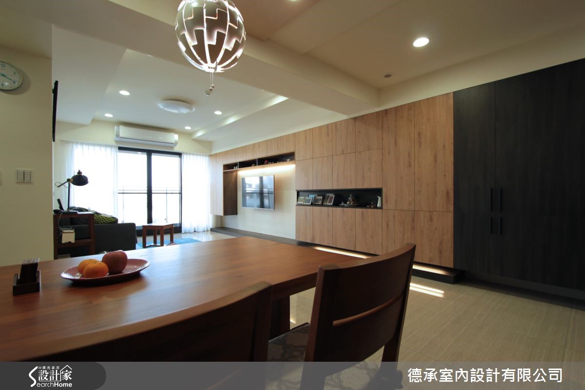 由于居住人口单纯,再加上112平的空间中设置四室,反而显得拥挤。因此设计师重新更动格局,释放一室空间扩增视野。让暖阳得以恣意穿梭在空间里,映照在木纹肌理铺陈的室内,烘托鲜明的纹路与大地色系风情,交织出暖炙人心的北欧风。【拆除一室,迎入采光有助扩容】将原有四间居室的其中一室拆除,客餐厅并以开放式的格局为规划,当户外光线映照满室,呈现宽敞舒心之意。整体以深色调作为基底,舍弃繁复的线条与细节,还以纯粹的原始味道。全室地面则以浅米色的瓷砖铺叙,电视墙利用珪璪泥铺陈,营造出朴质的生活态度。空间里更透过大量的柜体,满足实用的收纳需求。而撷取原木触感的材质,注入惬意休闲之趣。