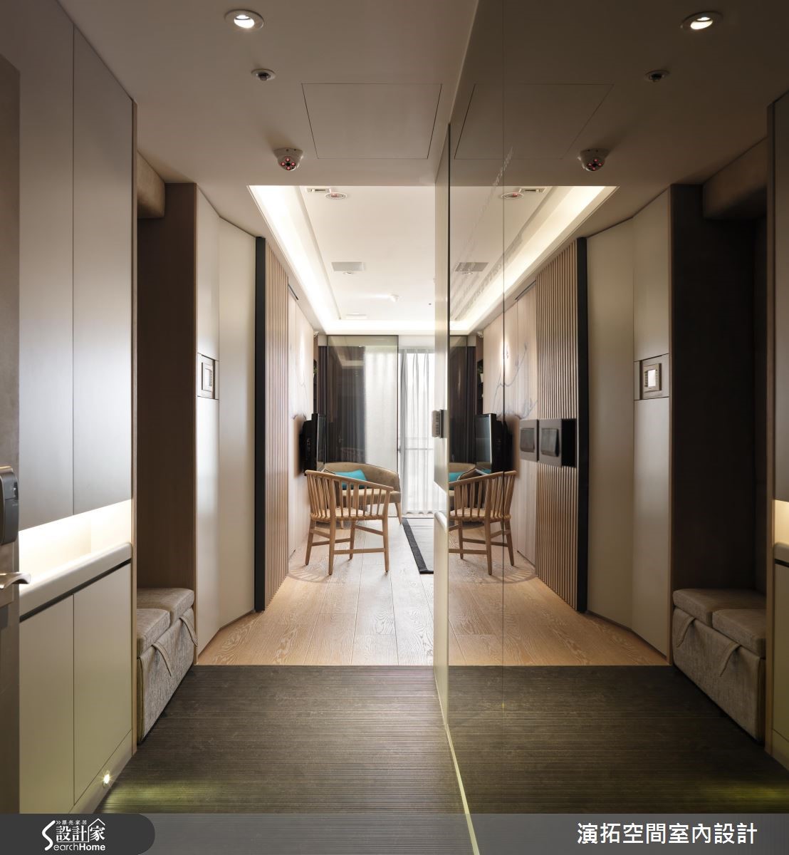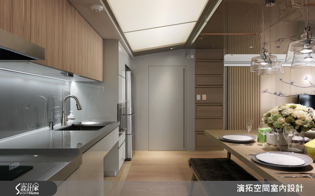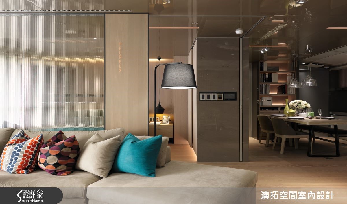 面对熟龄老后生活,不仅面临身体机能逐渐退化,许多长辈也担心若未来无法自主活动,会影响其他家人的生活质量,有鉴于此,设计师在92平方米住宅中融入友善长辈的机能设计,并结合物联网的智能系统,提升长辈的居住安全。【轮椅也可以,缓坡衔接公领域】玄关处以90厘米的缓坡走道与公共空间衔接,让轮椅也能轻松推动前进,柜体上更特别加入扶手设计,增加了长辈进入室内及穿鞋时的安全性,从进门开始,便能感受到设计师的贴心。【通透玻璃介质,减少视线死角】客厅和主卧利用通透的玻璃介质和开放式设计,既减少了照护者的视线死角,同时也让整体空间更加宽敞明亮;而家具软件的选择和设计上也相当用心,客厅处不设茶几,餐厨下柜和卫浴柜体刻意内缩,即便坐着轮椅,也能方便行动和使用。【利用智能系统,打造安心住宅】除了可以透过智能系统,调节温度、湿度、灯光、空气质量等功能,也包含贴心的关火、关水和定时用药提醒,若有发现异常情形,才会启动监视器,并通知在外的家人,既不会让长辈有时时刻刻被监视的心理不适,也使家人更加放心。
