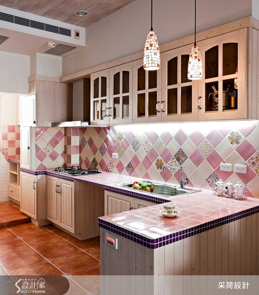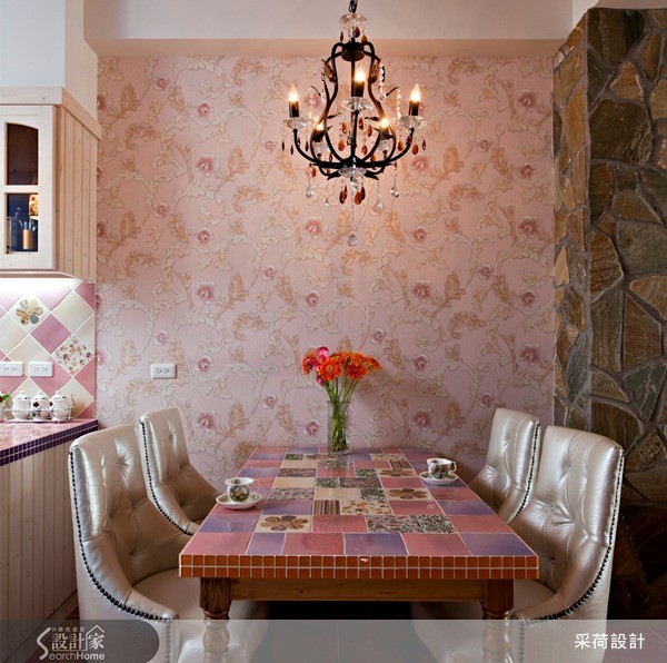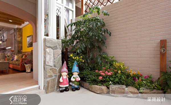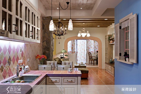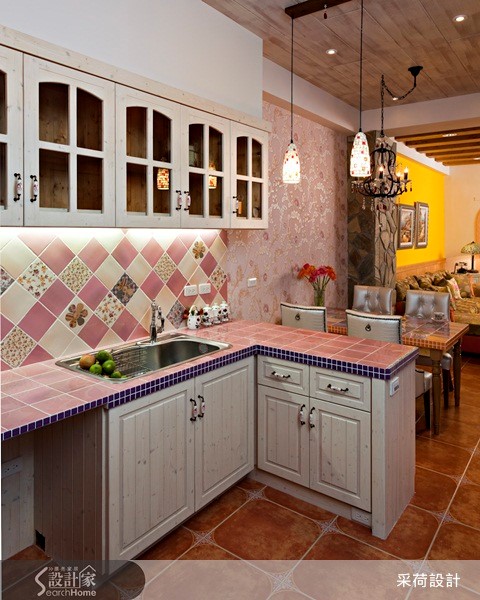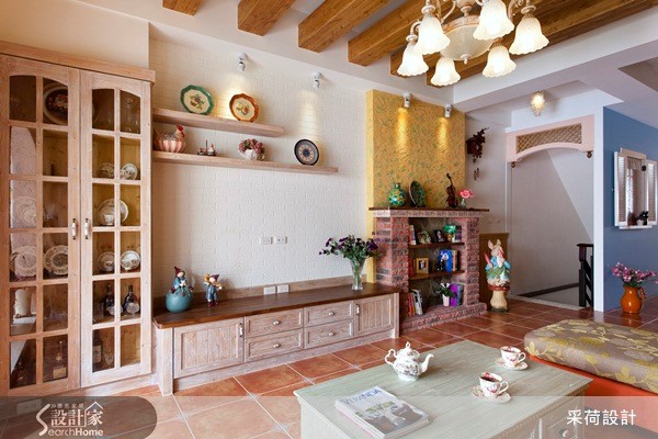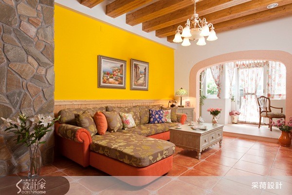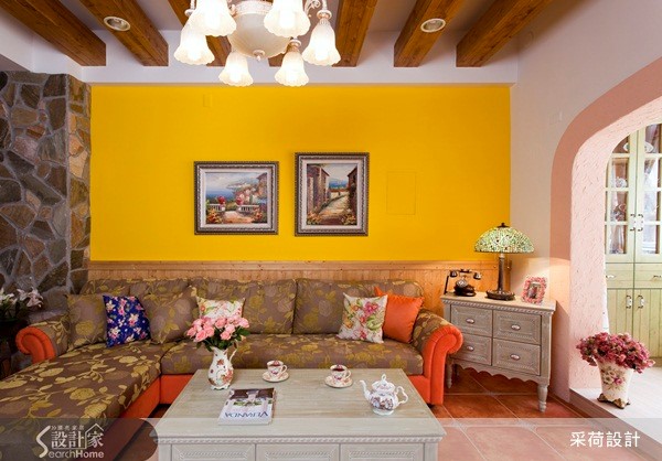 60平方米居宅中,设计师以欧式乡村风格为空间定调,注入高彩度的色彩,并融合美式拼布灵感,结合各式各样的进口花砖及手染木作,打造出有如童话绘本般梦幻住宅。【开放式拱门导入采光,化解阴暗】设计师拆解阳台的既有门框,改以开放式拱门呈现,圈划出一块与厅区相连的个人工作区,并导入庭院采光与绿意,展现明亮舒适的使用情境,同时借引光线,化解餐厅较为昏暗的景况。而饱和的鲜黄色墙面、活泼的布艺设计等,皆完美诠释了西班牙的热情风采;对比着生动的客厅氛围,餐厨领域则显得唯美雅致,运用仿拼布义大利进口花砖点缀壁面、呼应屋主的个性喜好,再搭配白色法式餐椅、花卉墙纸妆点,使浪漫气质更为提升。此外,居宅中加入不少天然建材,像是仿壁炉柜的古朴红砖、包覆结构柱的粗犷石材,并搭配花色家具,除了使空间更添装饰美感,亦彰显了乡村风格回归自然的初衷。
