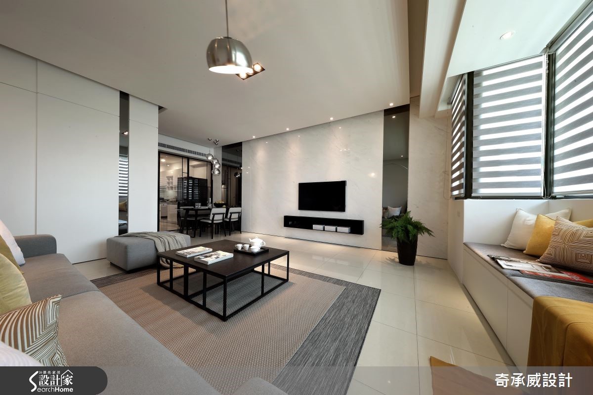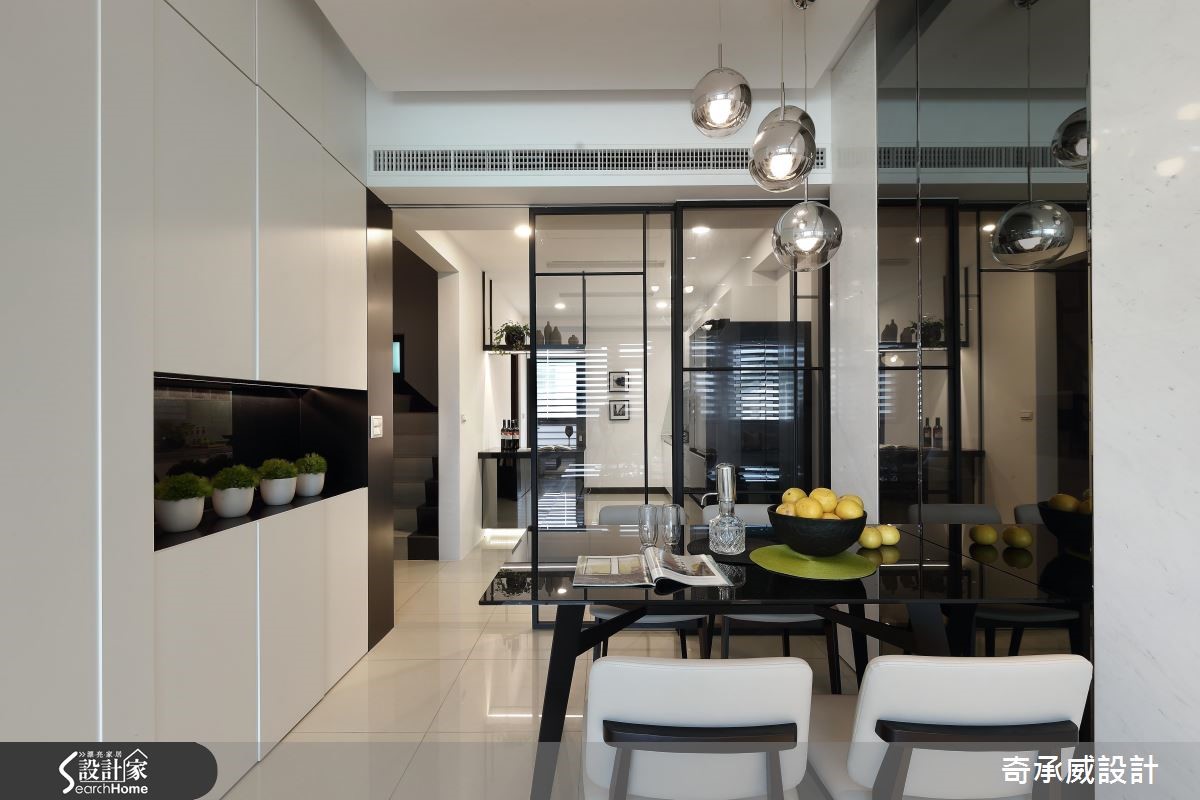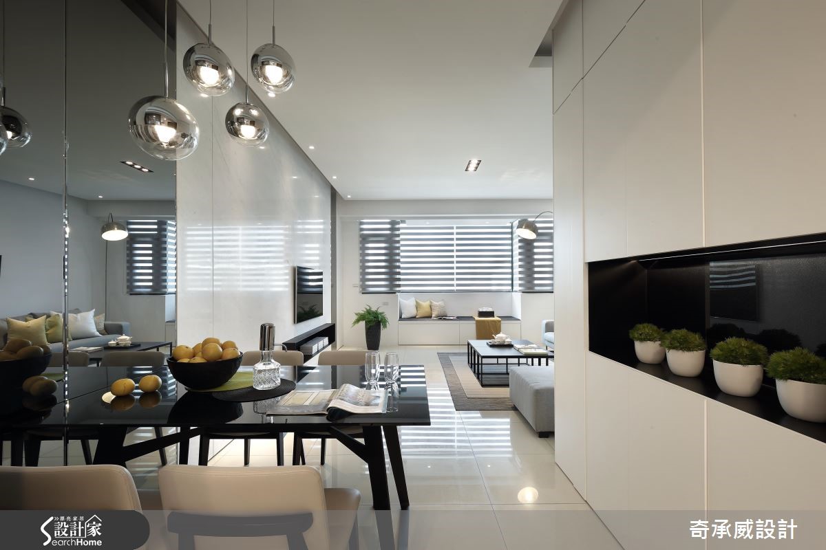 两个世代共享透天别墅,如何照顾长辈对于动线与机能的需求,同时符合子代对于风格的需求,显得时尚简约呢?且看设计团队巧手改造!【开放设计与流畅动线,备感大器】公共空间以宽敞的开放设计与流畅动线见长,以纯白色调为基底,搭配明朗活泼的鲜黄色家饰品,配合凸窗结构,将飘窗纳入窗下,接收充沛的采光。电视墙采用雪白银狐石材搭配对称灰镜设计,在纯白空间中彰显大器质感。【私领域回归简约,赋予完善机能】餐厅走道旁以柜体提供收纳,镜面则扮演视觉放大角色!利用一道铁件灰玻移门划分餐厨,避免油烟溢散、打造利落线条。私领域回归简约,以黑白调性体现在材质上,简约不失层次,并结合书房、更衣功能,使机能更完善。